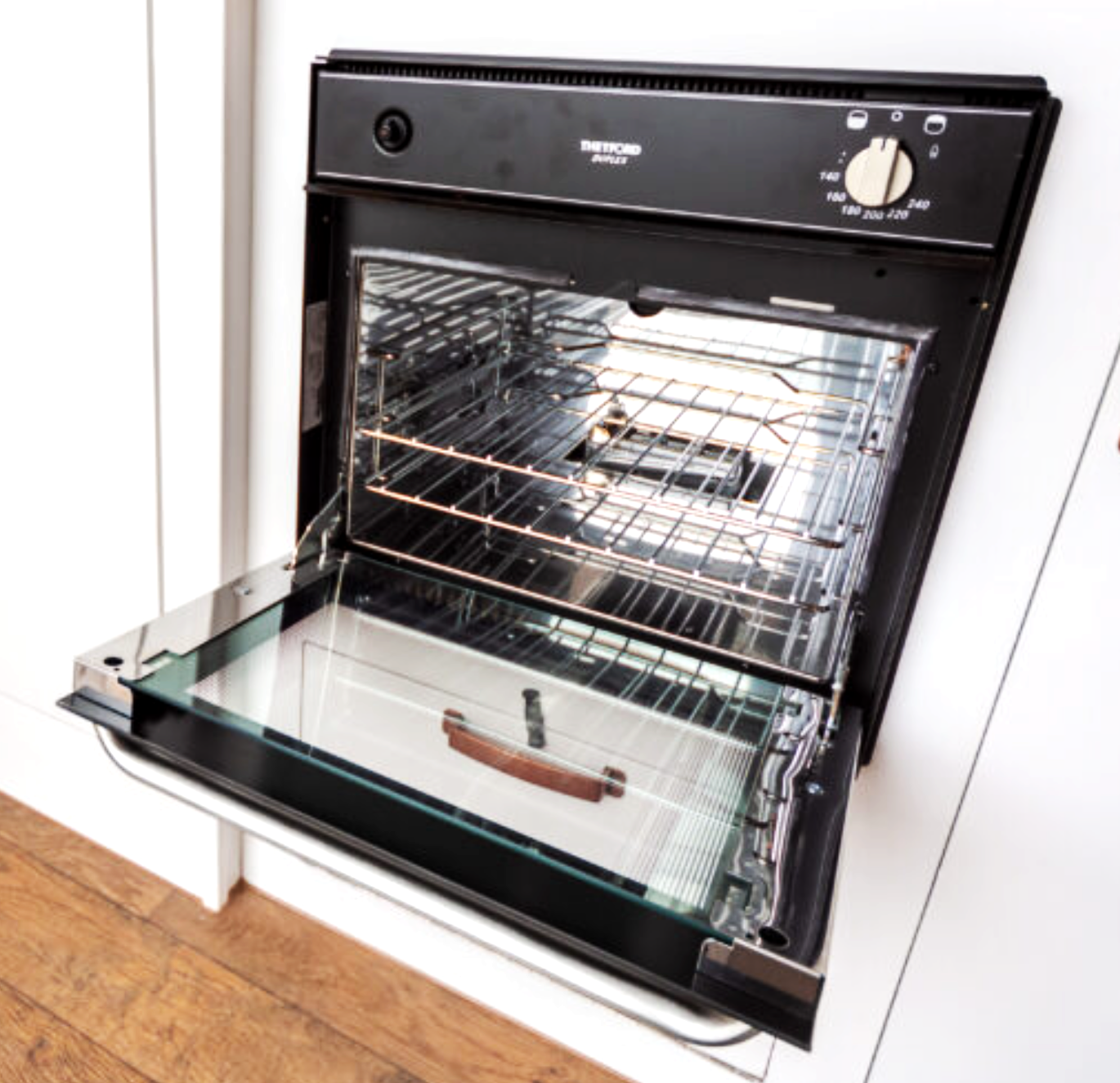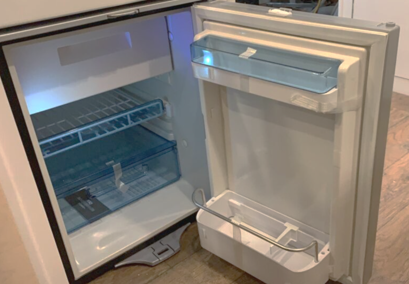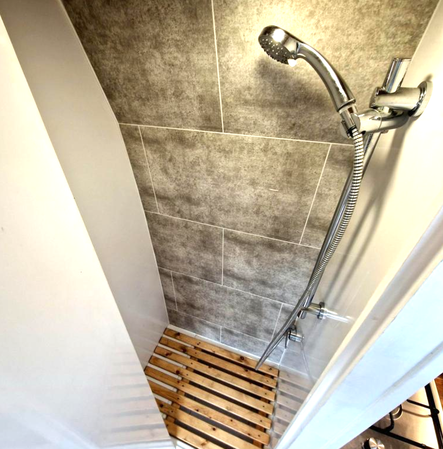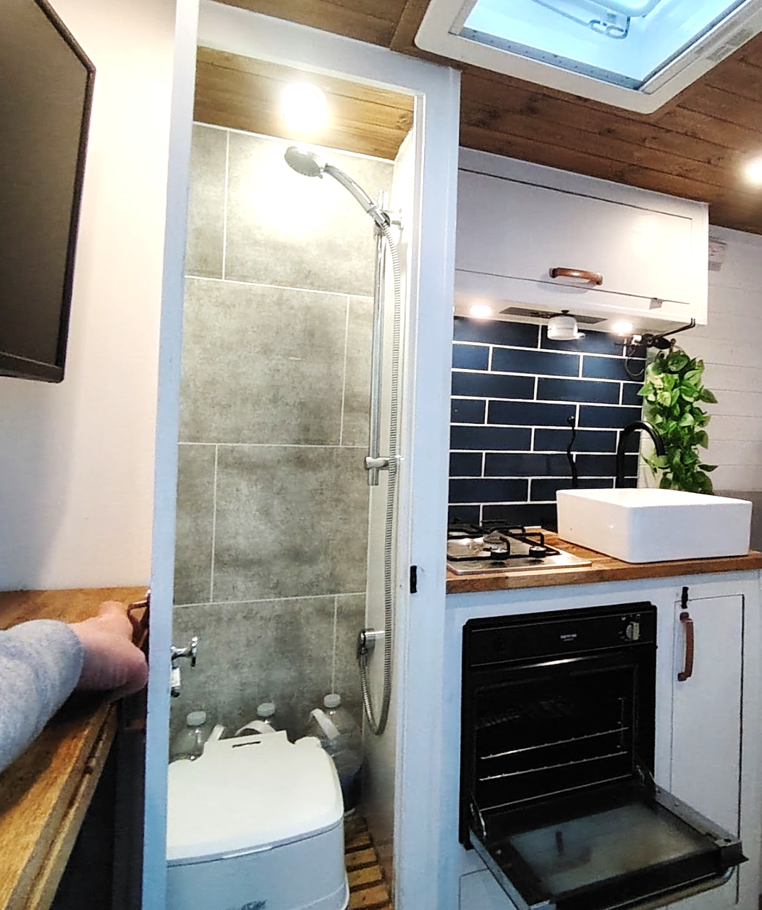 The kitchen area is equipped with a full range of appliances, including a fridge/freezer, gas oven, grill, and hob. A gas water heater supplies hot running water to both the shower and the custom low-profile ceramic sink and tap. Additional space for meal preparation is provided with the fold-out desk space which acts as a dual-purpose work / food prep area. Additionally, there is diesel-powered air heating and cooling from the main tank, ensuring comfort in all weather conditions.