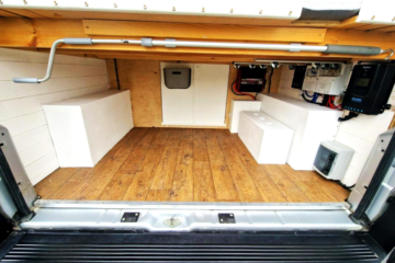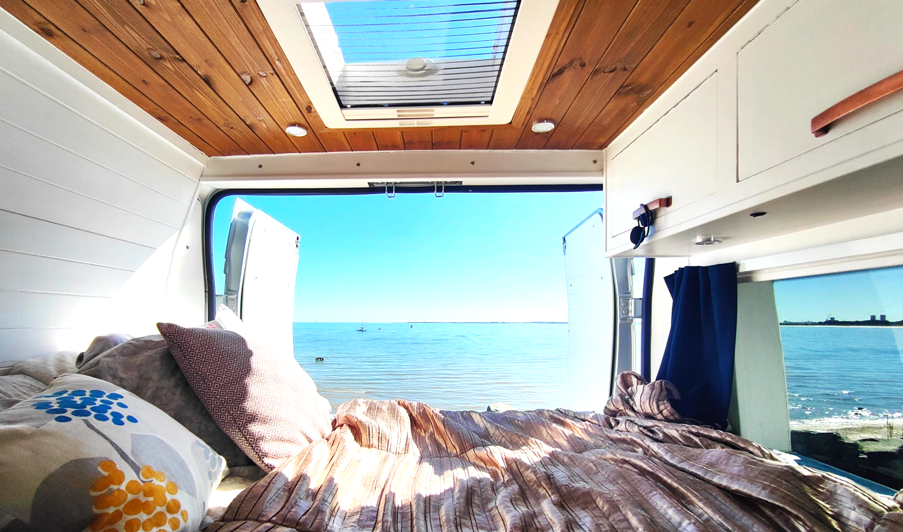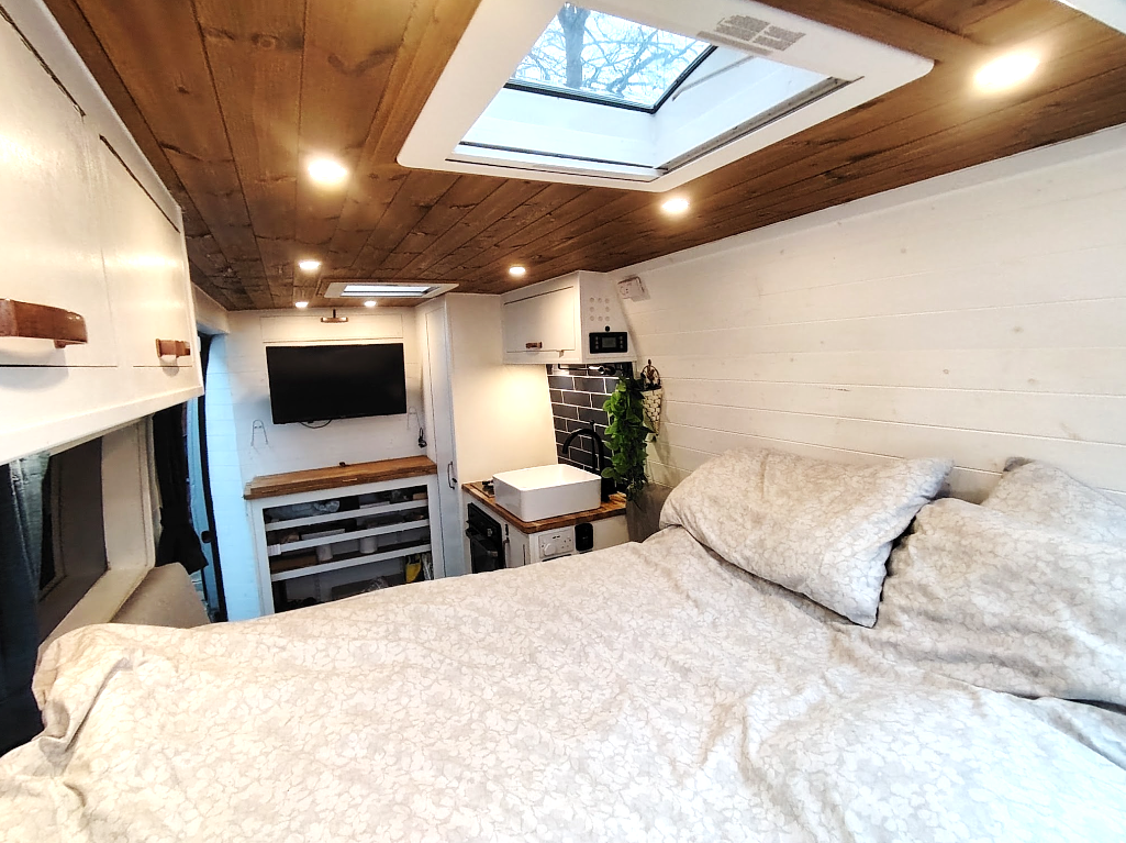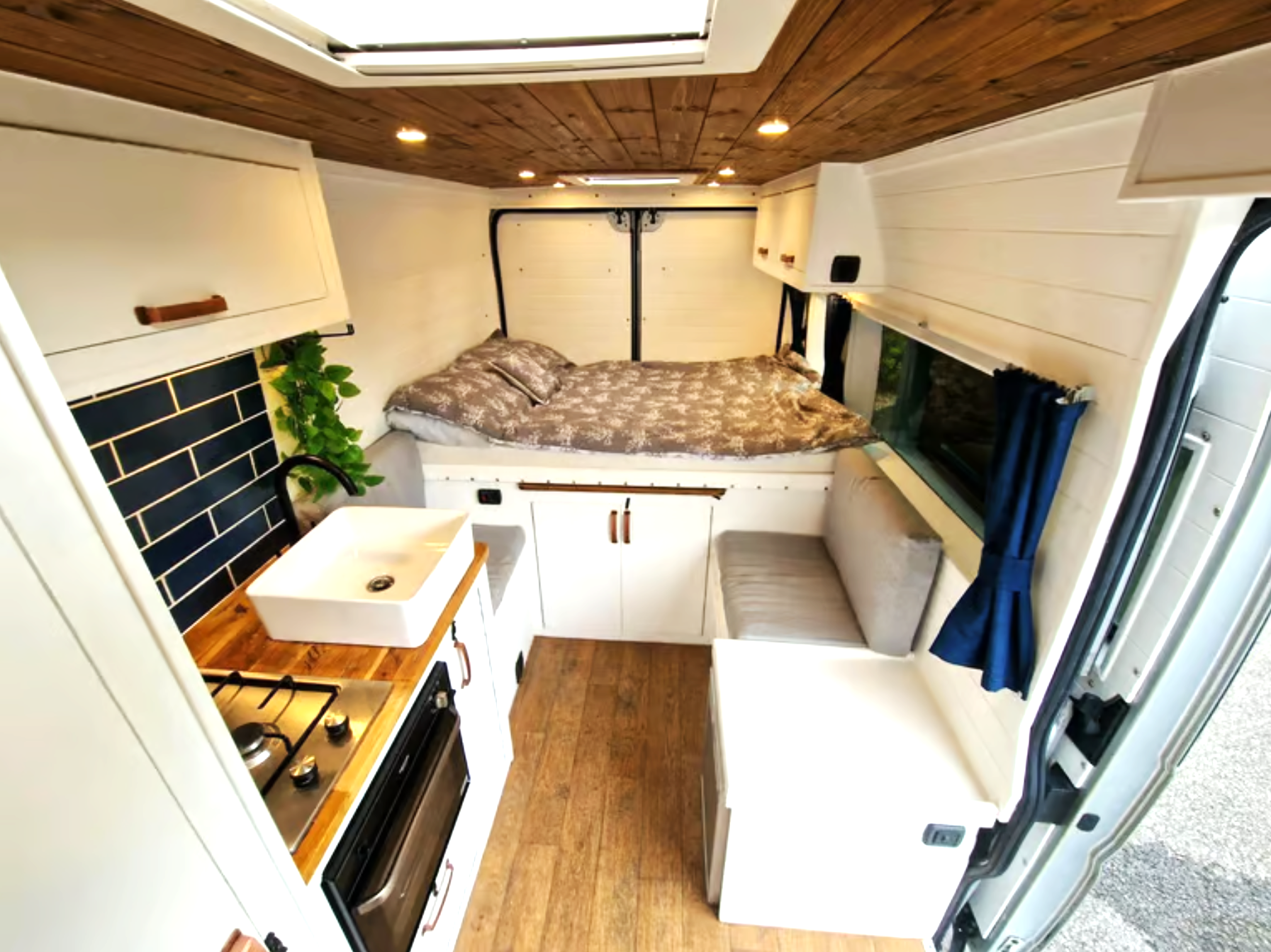 Inside, the van is meticulously crafted, wired, and insulated to the highest standards. This upgraded version features high-end upholstery, a full-width panoramic window with privacy tinting, two roof hatches with retractable blackout blinds, insect screens, and lockable latches.