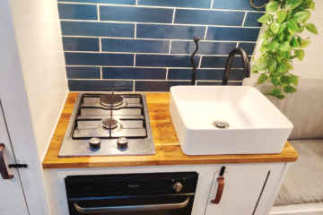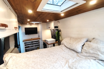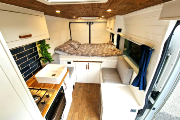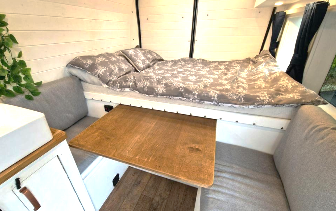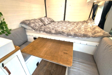 – 1 x full-size convertible single bed (6’ x 2′) which is also convertible to facing seats for dining or a forward facing bench seat perfect for film nights