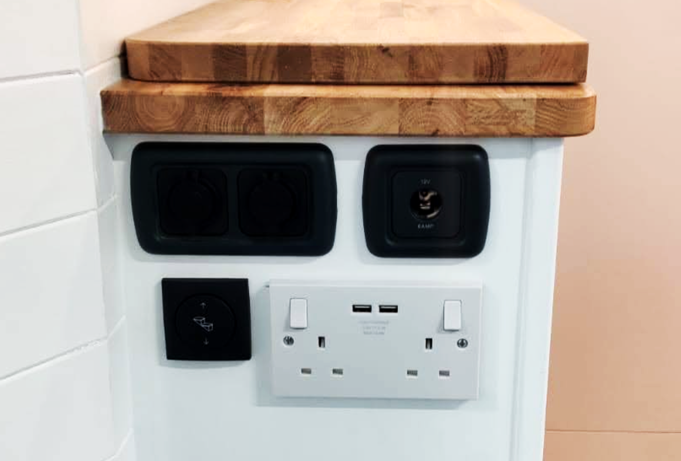 Electrical and metering features are extremely comprehensive, with two huge 160w solar panels with an MPPT controller, two premium lithium leisure batteries, and a high-end pure sine wave inverter suitable for powering multiple high-wattage devices simultaneously. The camper includes six USB power outlets, four UK plug outlets, a 12v outlet, four-zone LED lighting with entry and exit lights, a CBE touchscreen control panel with a backlit display for battery and water levels, and control panels for the fan heater/cooling, water heater, and inverter. A gauge for LPG and a carbon monoxide alarm are also included for safety.