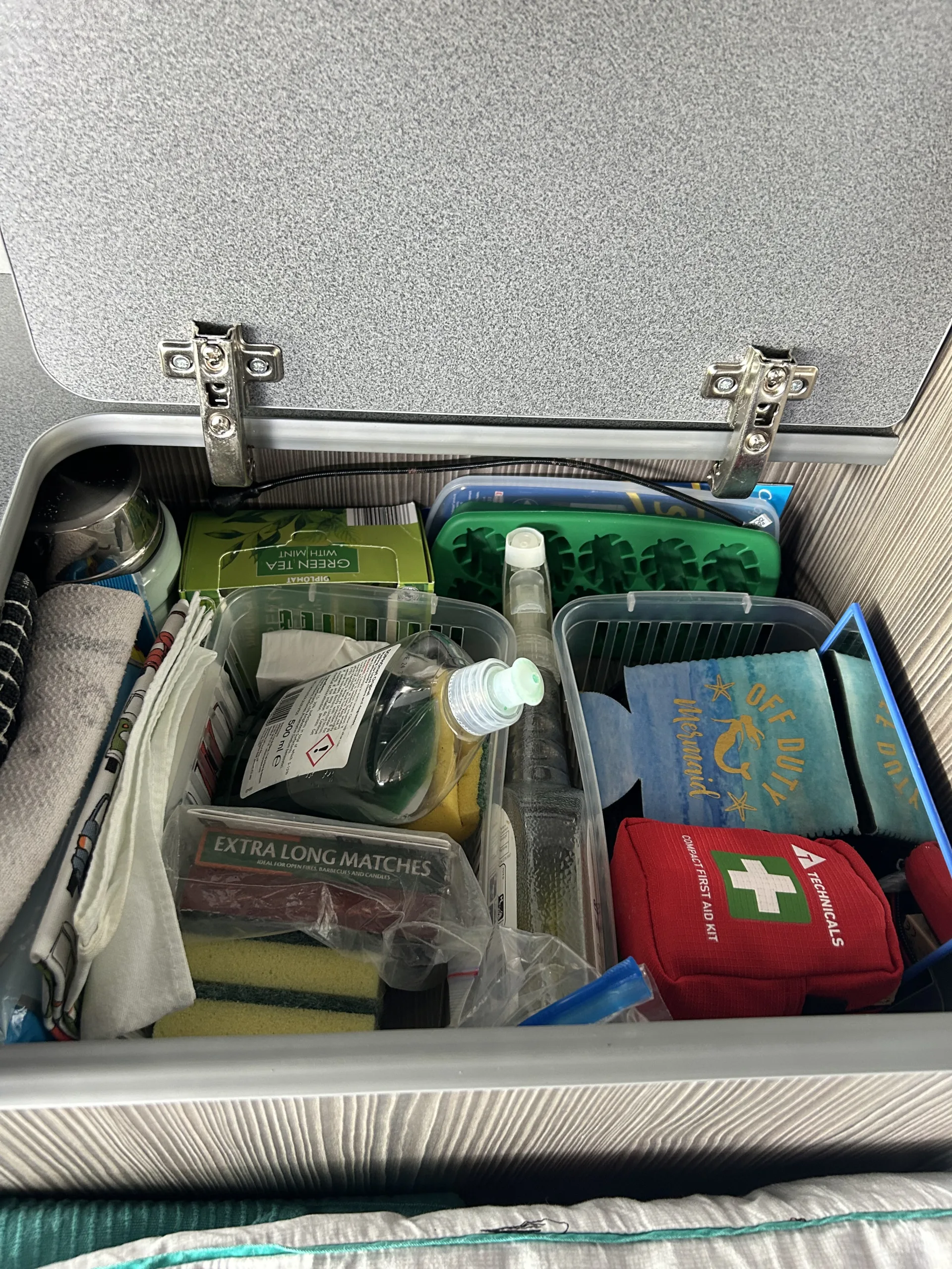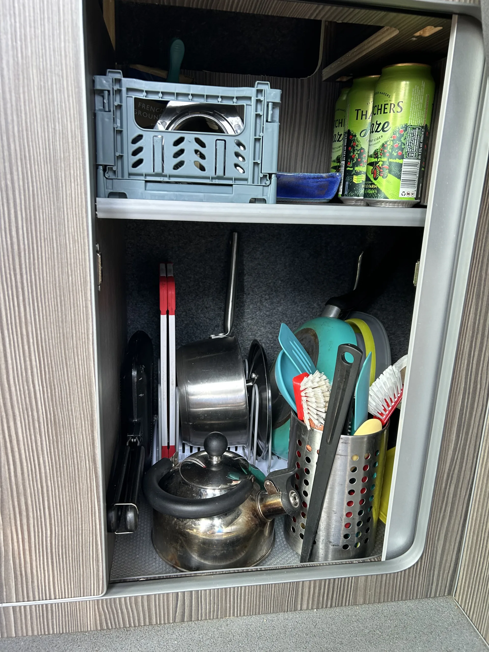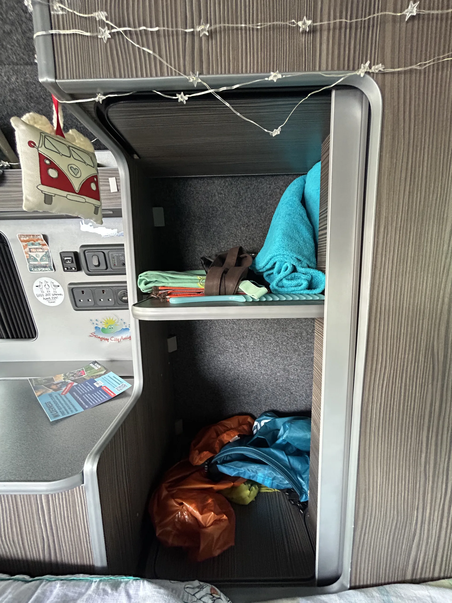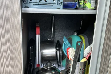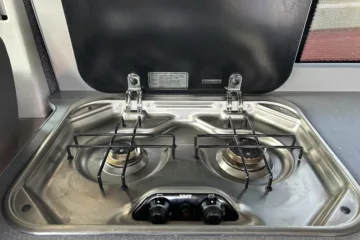 The galley is fitted with a two burner Dometic hob with piezo starters and a glass cover, a two way (12v/240v) Isotherm CR49 fridge with freezer compartment, a pull out pantry, large cupboard with shelf, plenty of worktop, with a top loading compartment. All surfaces are easy clean and are in very good condition. Note that the Galley does not have a sink. I chose not to have one, however, there is space next to the cooker to fit one, as well as space for water tanks in the large cupboard. There is also storage above the worktop for spices, small jars, towels, trinkets, etc.