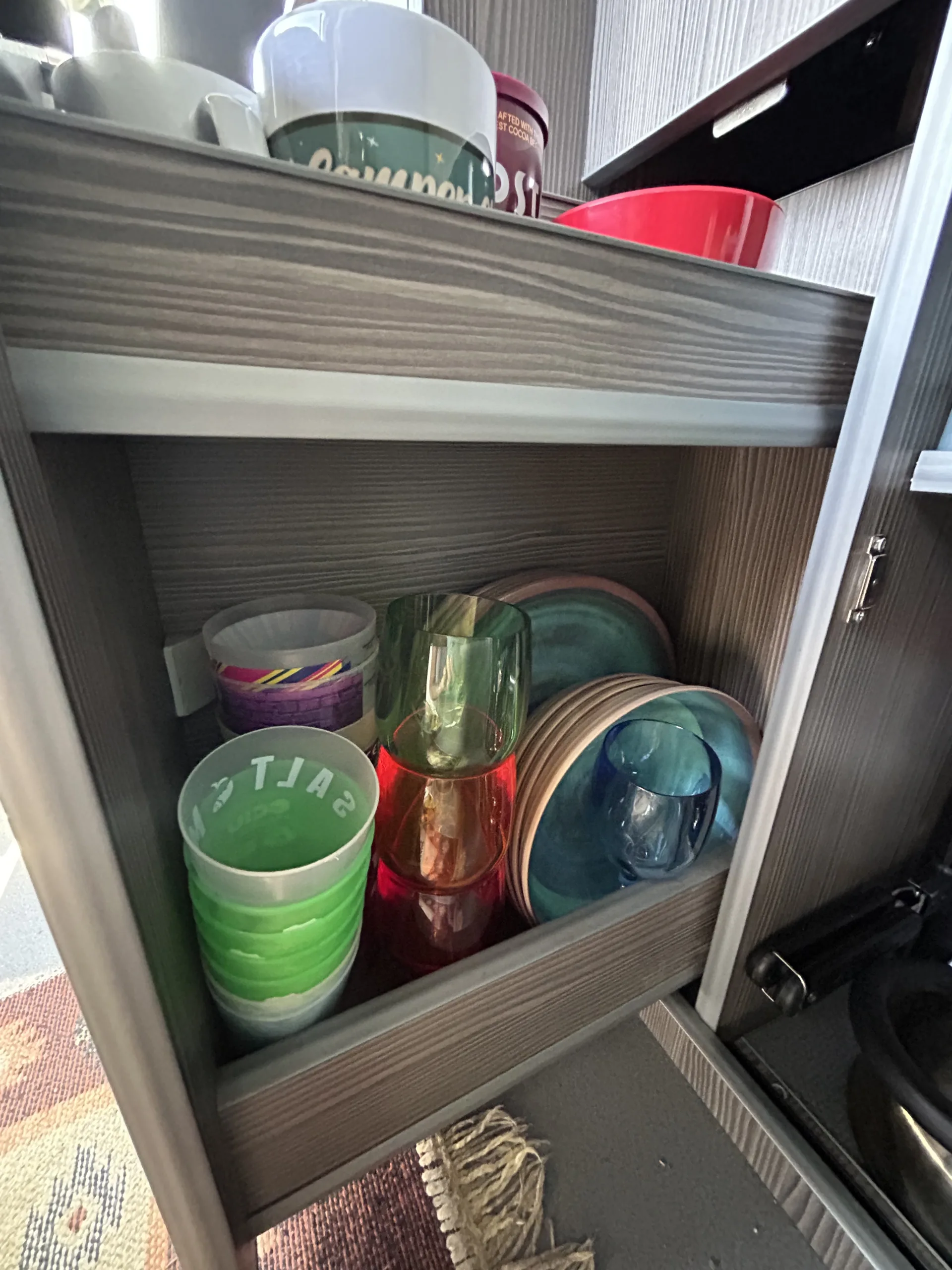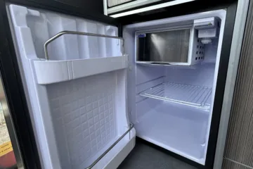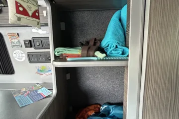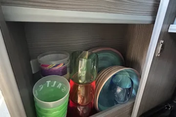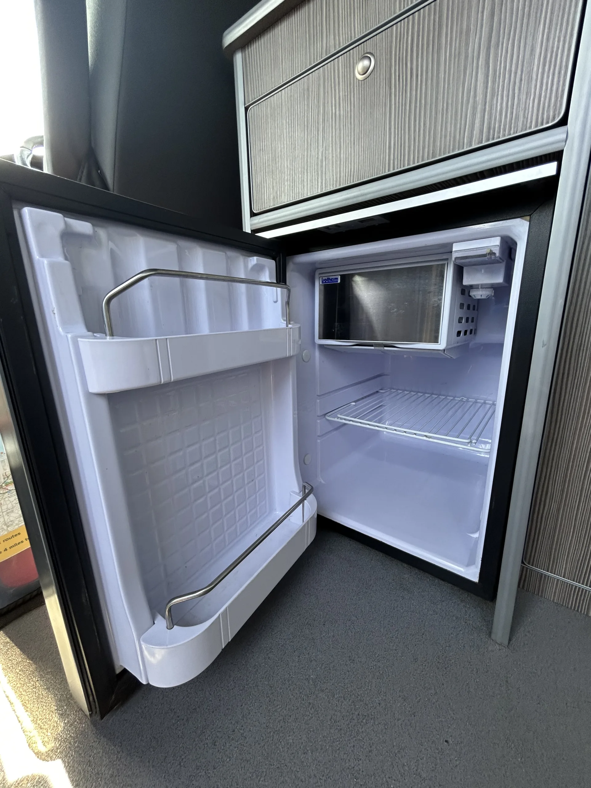 The galley is fitted with a two burner Dometic hob with piezo starters and a glass cover, a two way (12v/240v) Isotherm CR49 fridge with freezer compartment, a pull out pantry, large cupboard with shelf, plenty of worktop, with a top loading compartment. All surfaces are easy clean and are in very good condition. Note that the Galley does not have a sink. I chose not to have one, however, there is space next to the cooker to fit one, as well as space for water tanks in the large cupboard. There is also storage above the worktop for spices, small jars, towels, trinkets, etc.