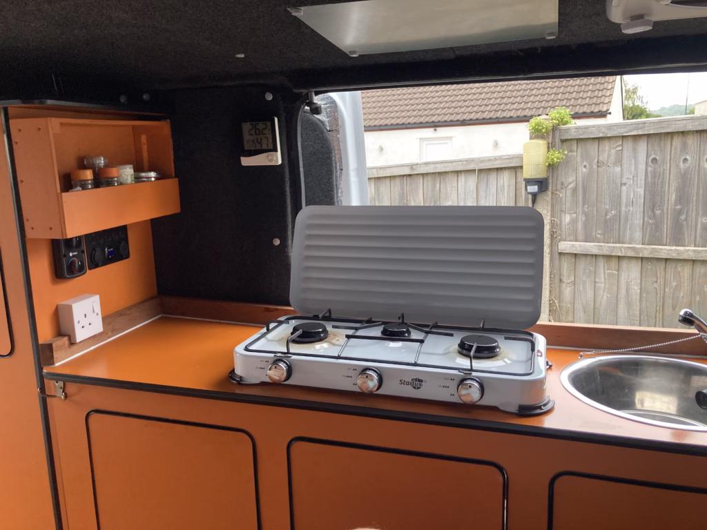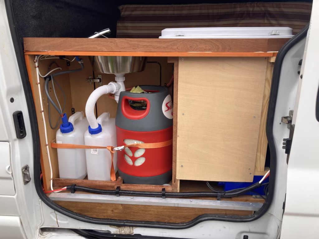 As you can see, there is a sink, running water, 10L fresh and 10L waste tank (I think you could swap the fresh to a 20L and would fit easily)