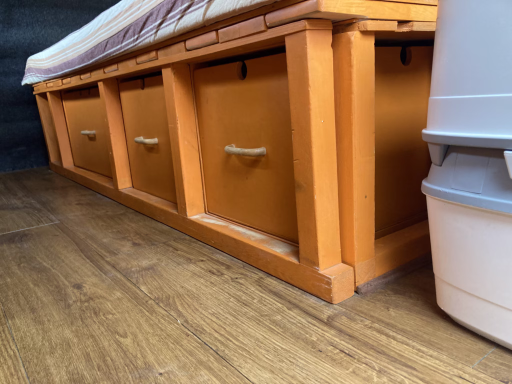 There is ample storage under the bed by way of three large drawers, the built in unit at the end and the shelving unit.