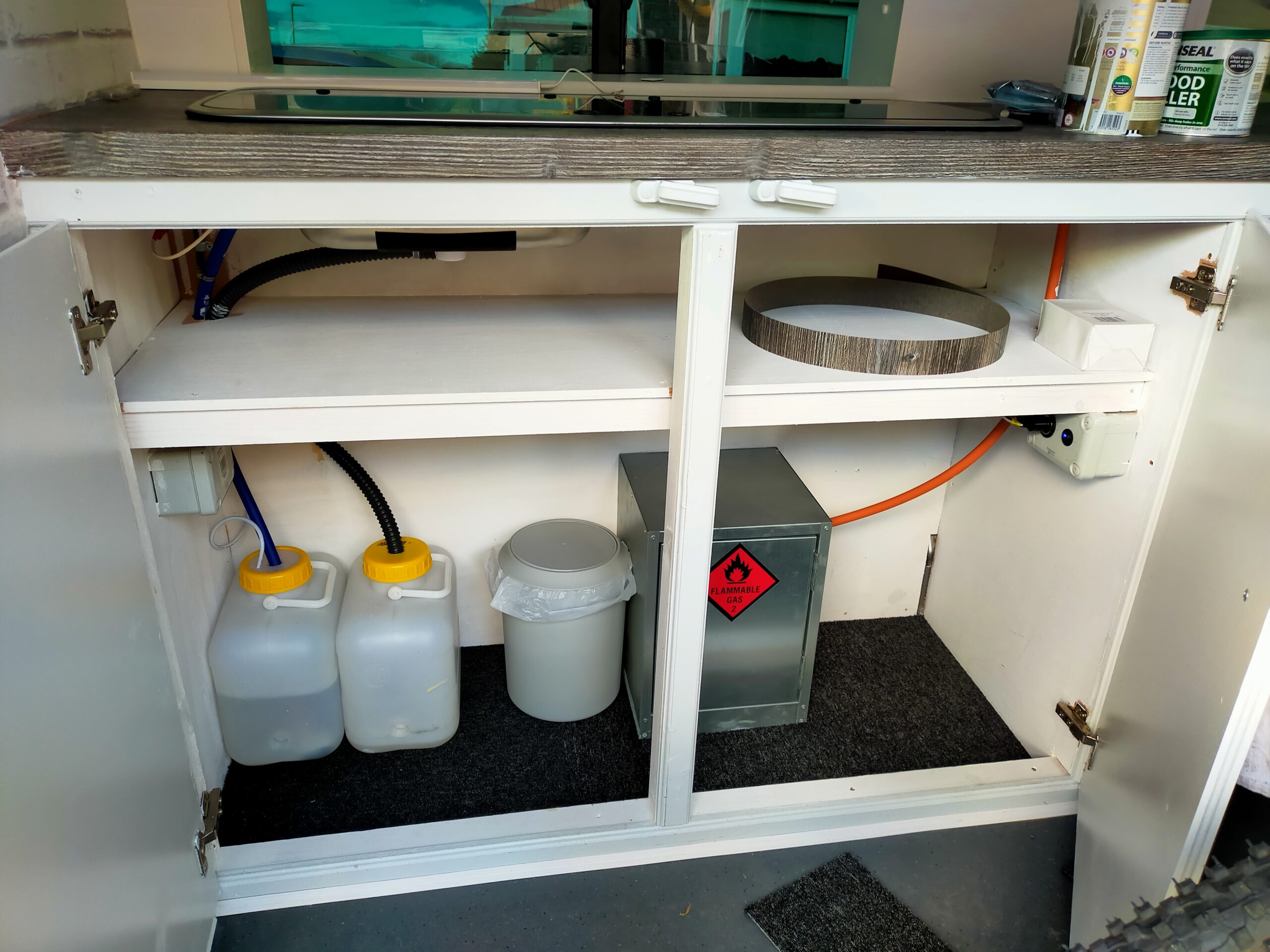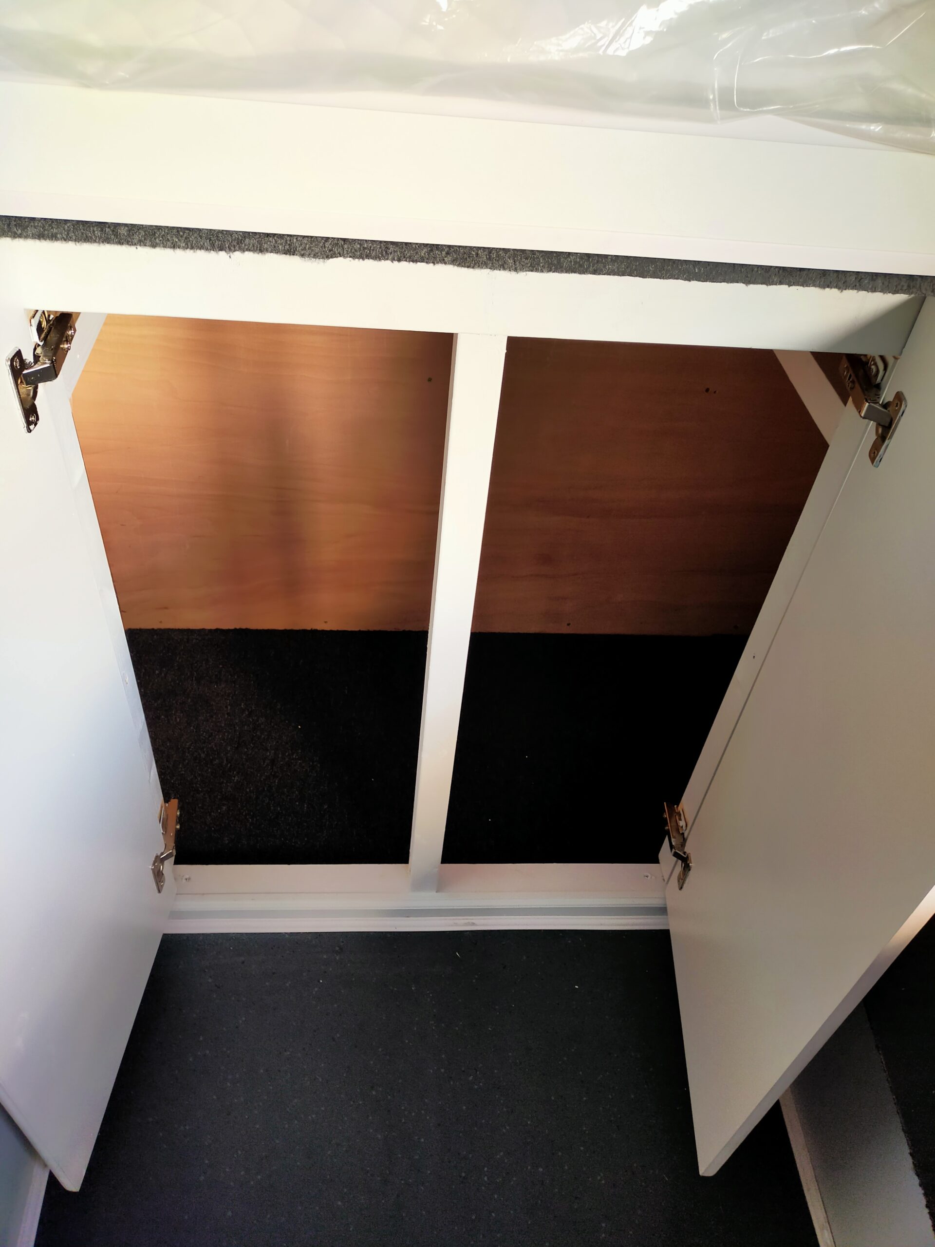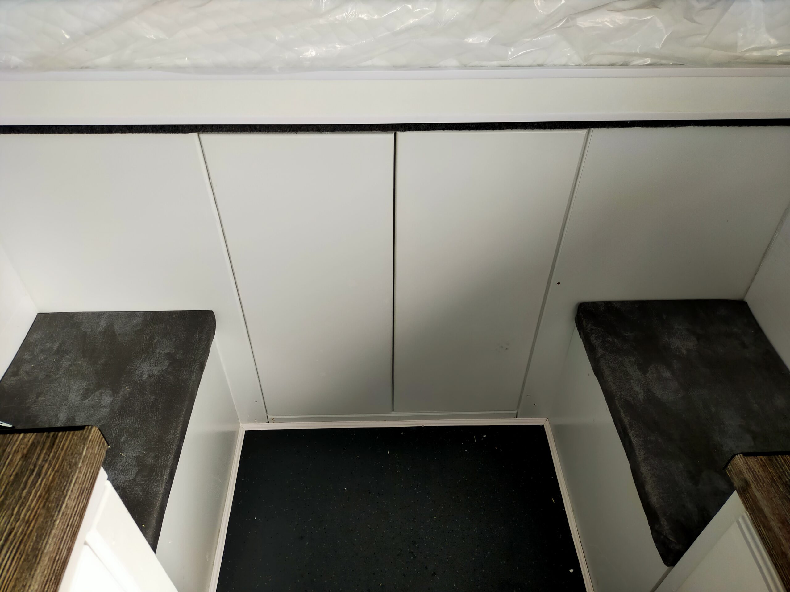 plenty of storage underneath the fixed bed, under worktops and above storage. PVC celling and walls with 4 x spot lights plus a reading light. floors are fitted with Polysafe non slip waterproof flooring, very tough wearing.