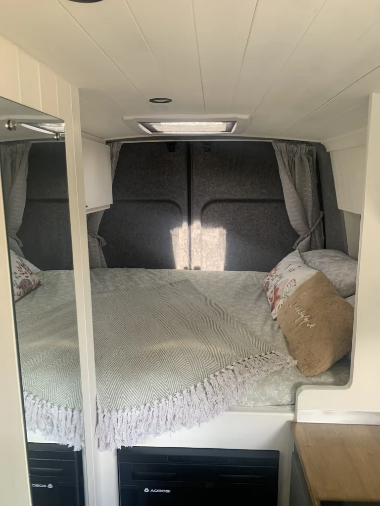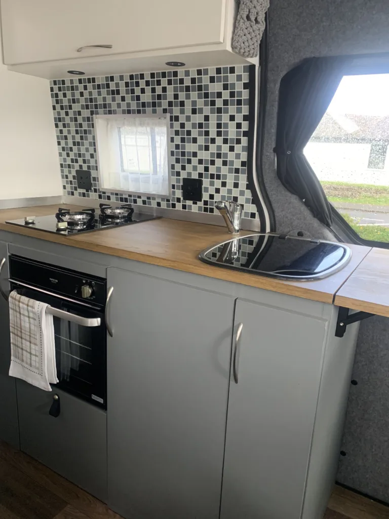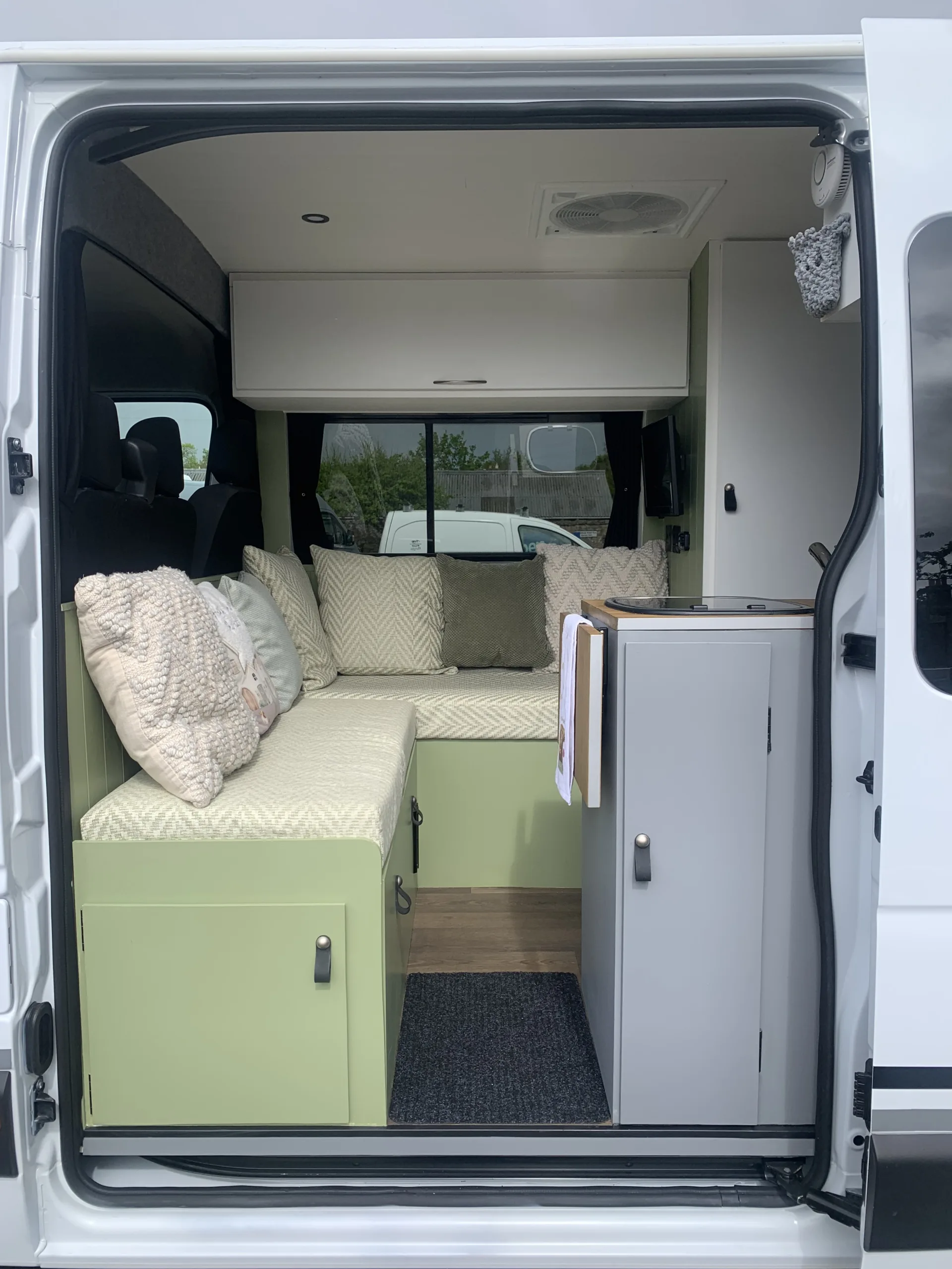 Fixed bed 6ft2 x4ft.Separate toilet with Thetford 565p portable loo.12v 65l compressor fridge,Thetford gas oven and hob,Thetford Argent sink with Reich tap.Diesel heater,240v hook up,12v system,battery to battery smart charger,240 v charger,12 v tv,3 seats in front ample storage in overhead cupboards and under l shaped seating area which can also convert to small bed 6ft2 x3ft6 ,detachable table.Solid wood worktops with flip up extra leaf.Touch sensitive lights both down lights and spots.Mosaic tiled splashback. Various sockets and usb connections.Full length mirror.Memory foam mattress.Curtains on windows and in bed area.Large under bed boot area.