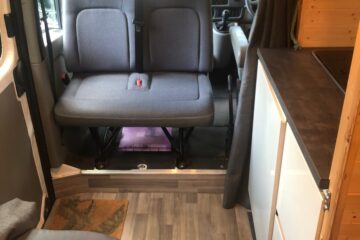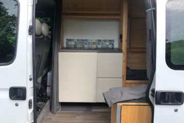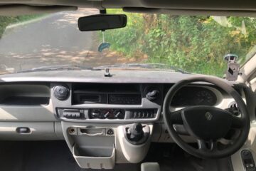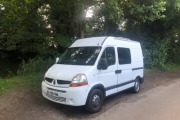 Beautifully converted Renault Master with wood fi nish throughout. The design and layout allows for a functional living space, with every area maximised. The bed and table can be stowed when not in use, whilst the seats and rear of the van provide ample storage to stow possessions. For the electricals you have two 12v points, four USB slots, four 240v plug sockets connected to a leisure battery (with inverter) which has split charge alongside two 100w solar panels for off -grid living, and a hook up point for when on campsites.