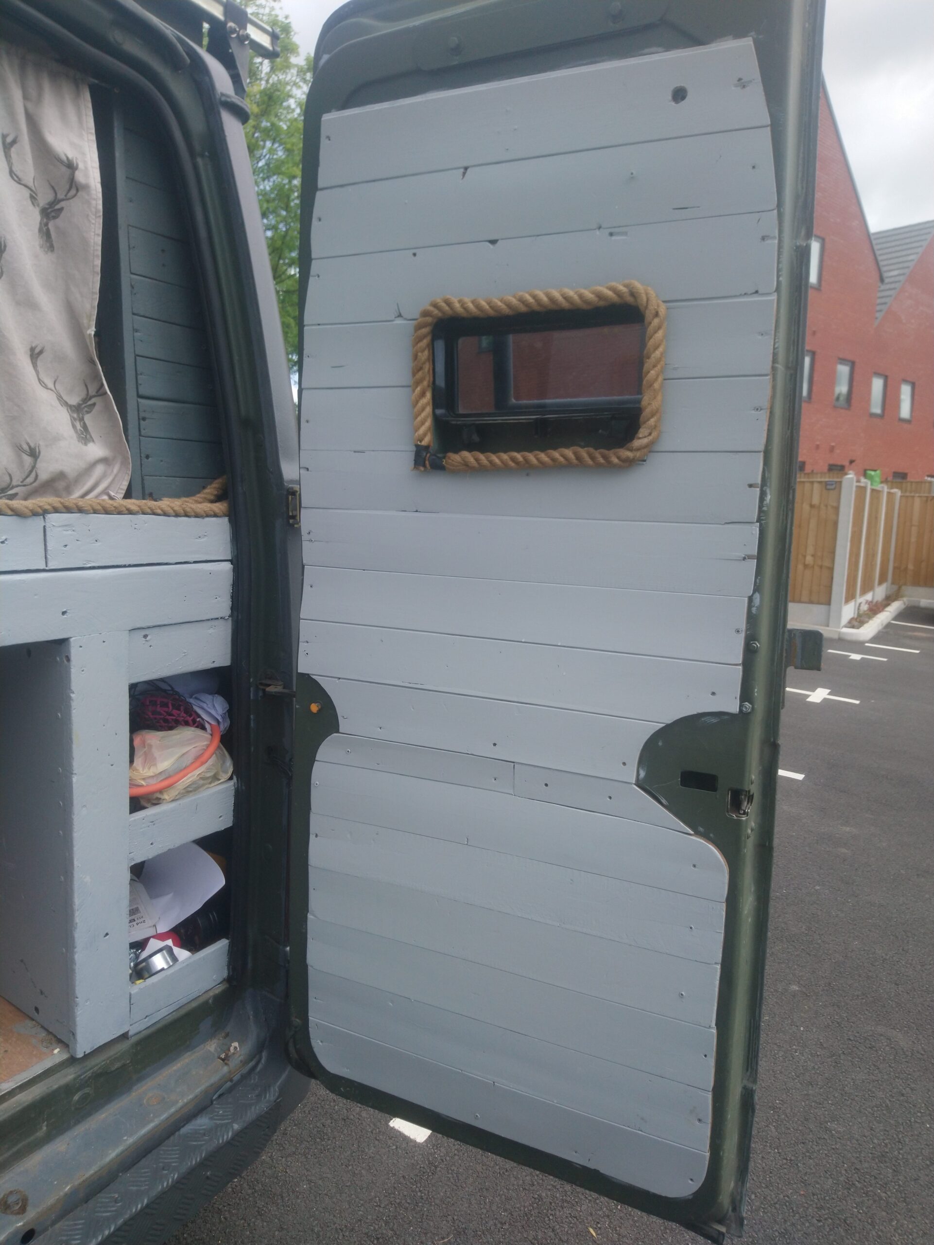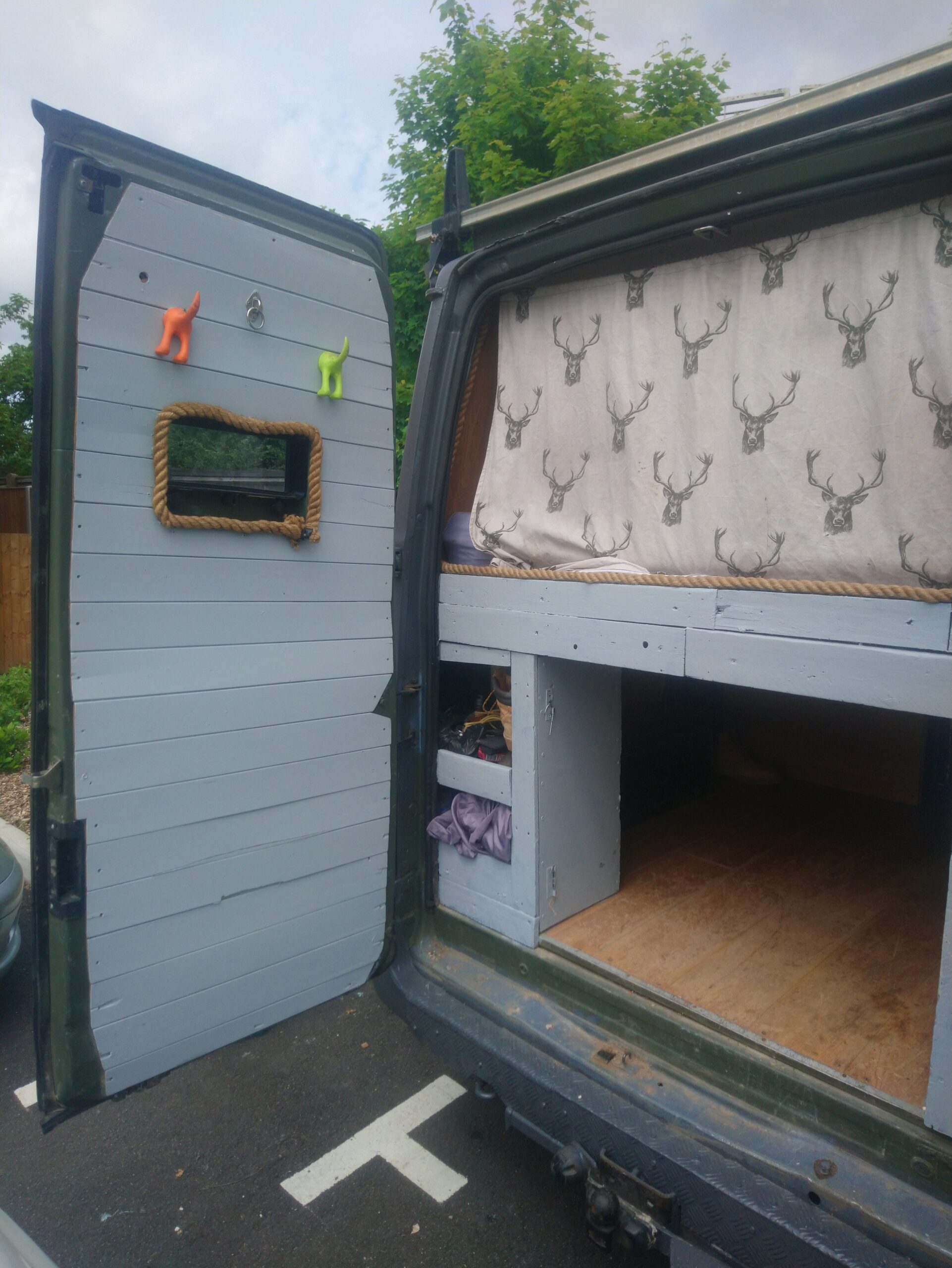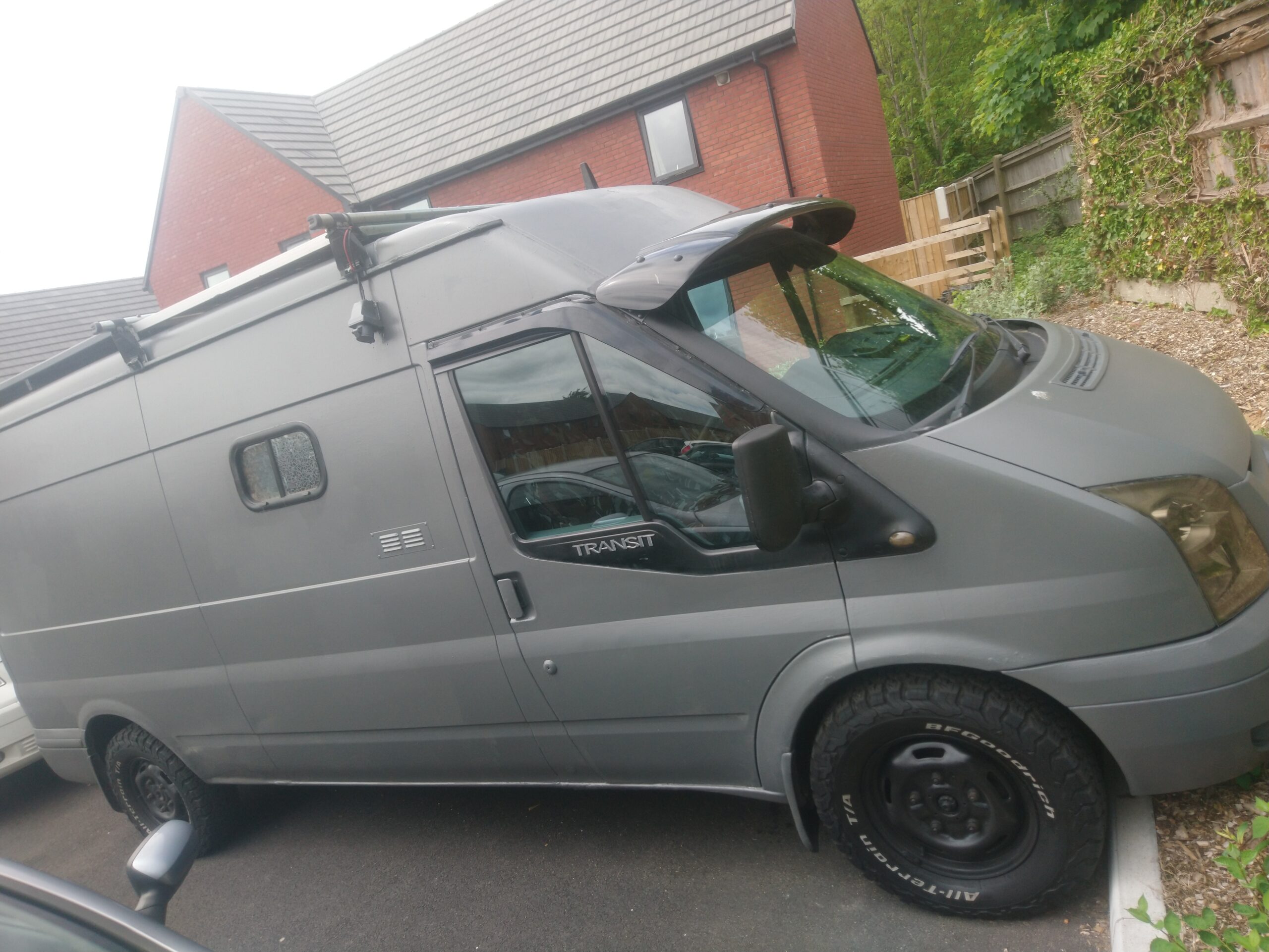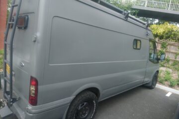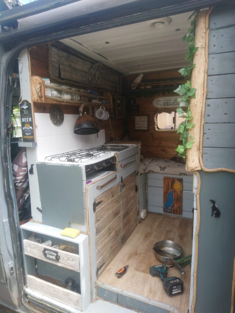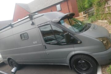 Rustic self built conversion. Everything is included with van from bedding, awning, crockery, gas bottle, toilet, 60 ltr compressor fridge. All you need is fuel and your away. Roller painted with battleship grey paint, bf Goodrich all terrain tyres. Conversion has king sized fixed bed with under bed storage or dog bed area with gates at both ends. Lots of storage, 12 v usbs, led lights, extractor fan, 4 opening windows, fully insulated, diesel heater, twin 110ah leisure batteries, 200 Watts off solar, split charge relay, sink, CD radio, 2 burner hob with grill, 240 hook up, 2 double sockets, removable table, shelving, mirror 50 ltrs water