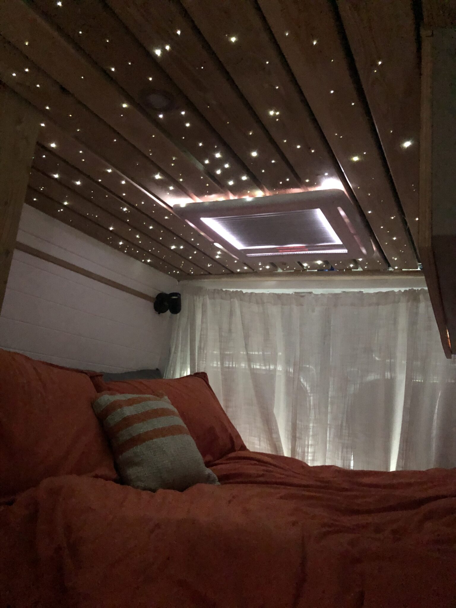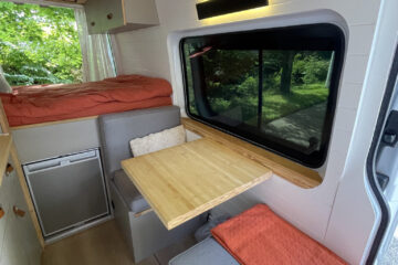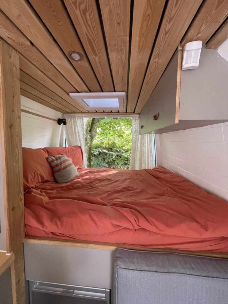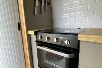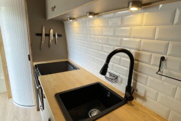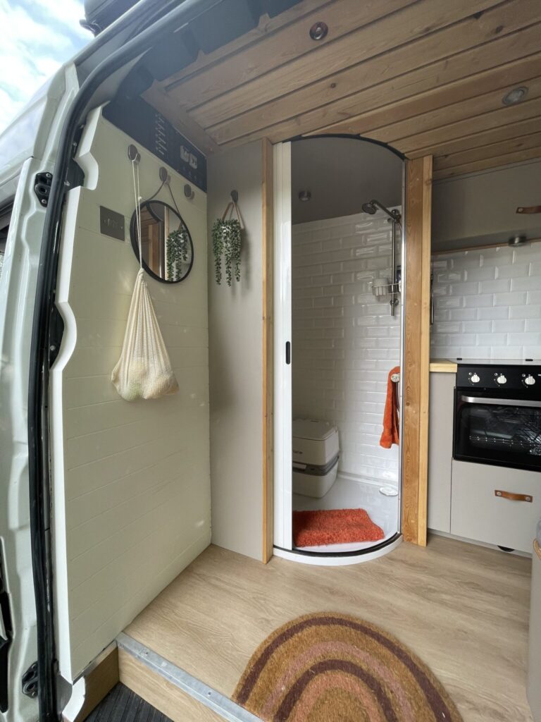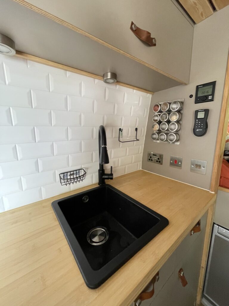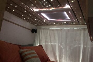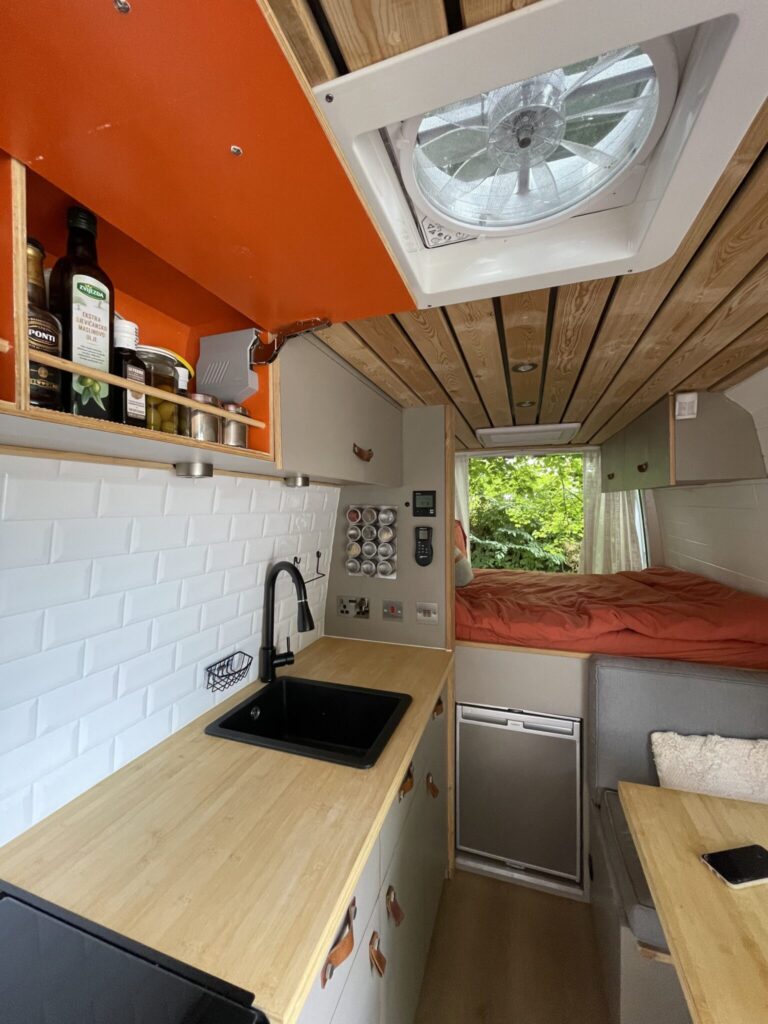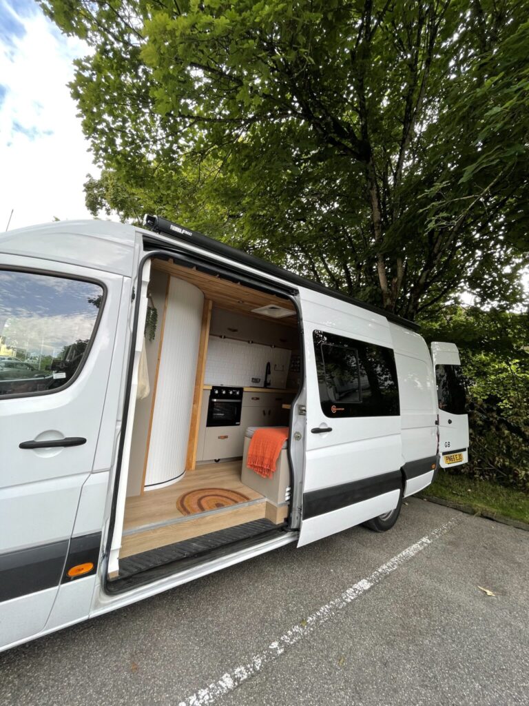 This van was converted for me to use and travel and the quality of the conversion reflects this. Unlike many conversions, nothing was scrimped or saved when building, all conversion elements were either built or purchased brand new, including all electrics, water systems, windows and awnings. Sadie is an offgrid, luxury campervan which can be traveled in for long periods of time but also for more local weekend trips. She truly is a luxurious van to travel in with a large shower, plenty of storage, oven with three hobs, 4m Fiamma awning, inbuilt fibre optic star lights above the bed and a spacious dinette.