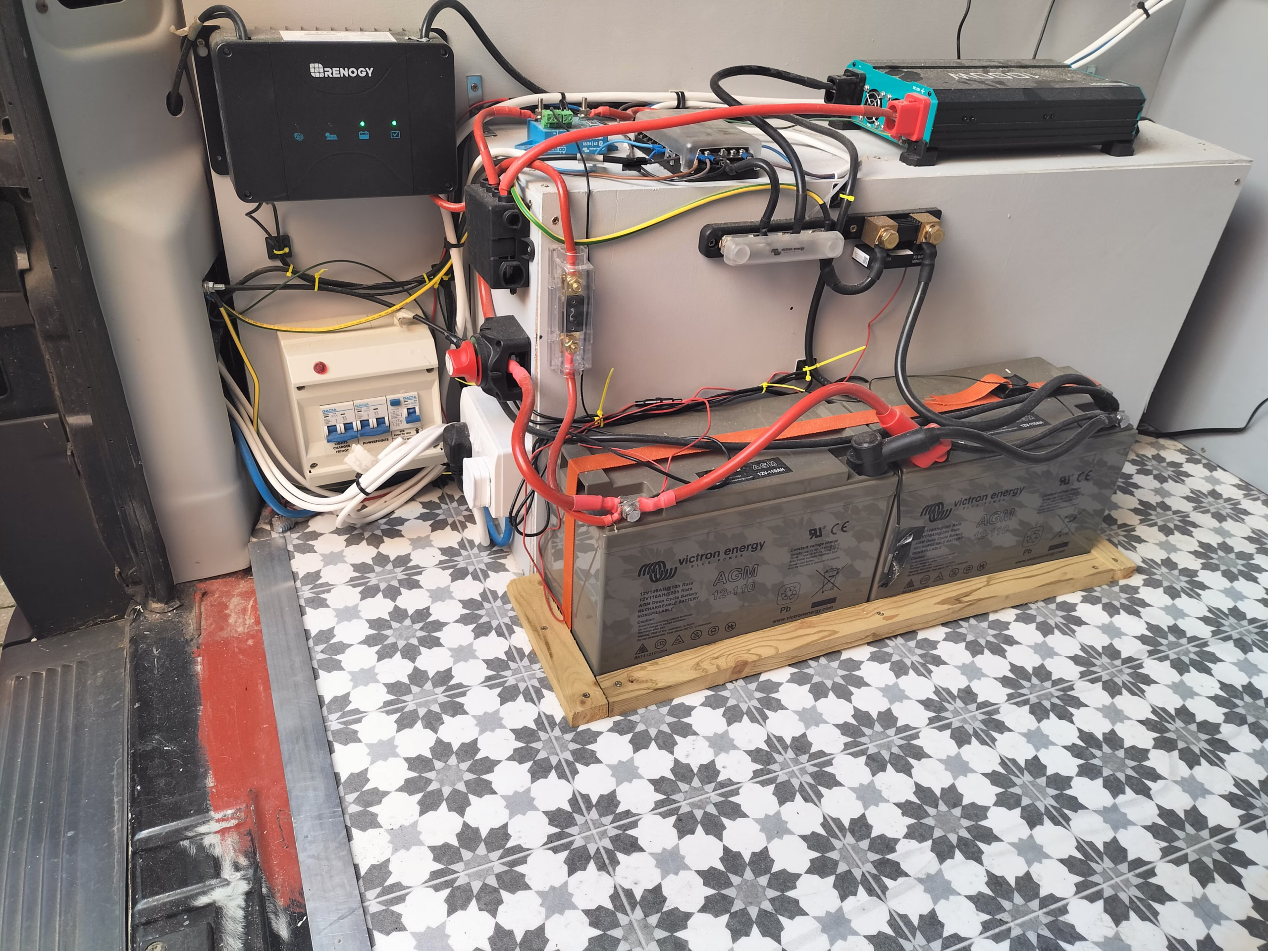*200w solar panel, 2x 110ah AGM leisure batteries, 1000W inverter
