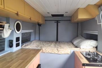 Jeanie is a former minibus that we self-converted at the start of 2024. She has given us lots of fantastic adventures, but the bed is, unfortunately, no longer suitable for our older dog, so it’s time to find her a new home.