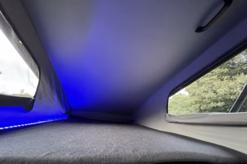 Sleeping up to 4 people with two double sleeping compartments including an Upper pull down double bed with luxury foam mattress in the practical yet sleek pop top roof.