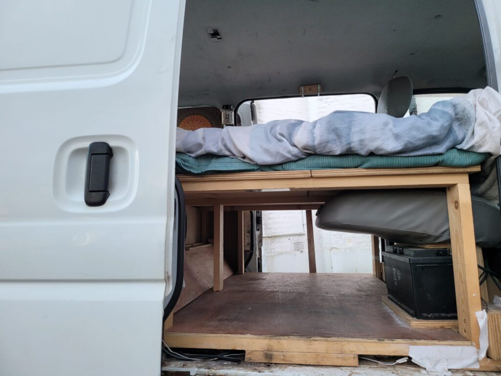 The is ample space to sleep two in the back of the van. I built this van for myself (6’4) and my girlfriend (much smaller). The bed on the driver side folds down meaning a tall person like myself can sleep on the driver side fully stretched out. A smaller person can sleep fully stretched out on the other side – if required the passenger side could be easily modified to fit a taller person too, you would simple need to buy another hinge.
