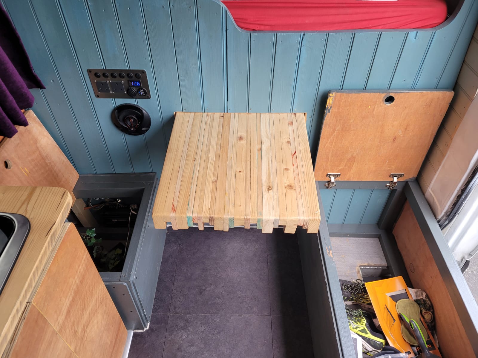 Guest bed on van floor (under seating area / table) using memory foams cushions typically used on seats, come together to create comfy guest bed which is just short of 6tf height and 3ft width.