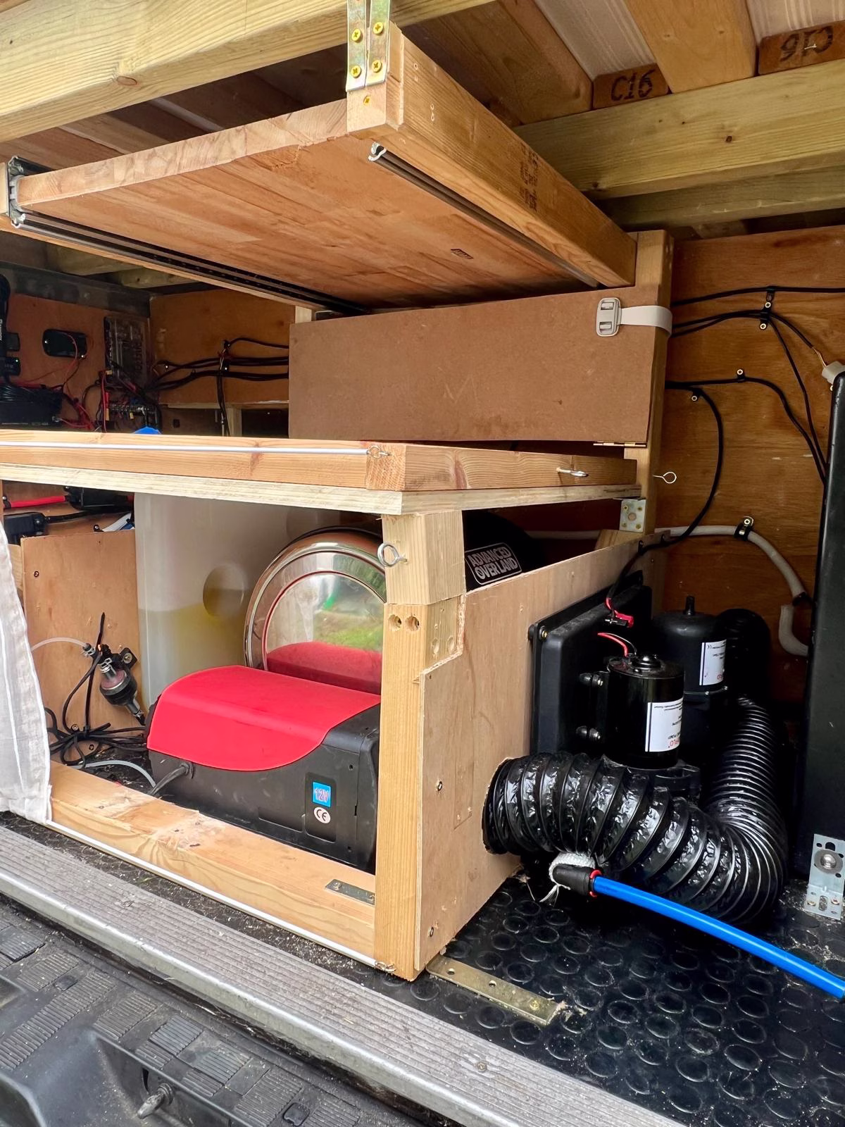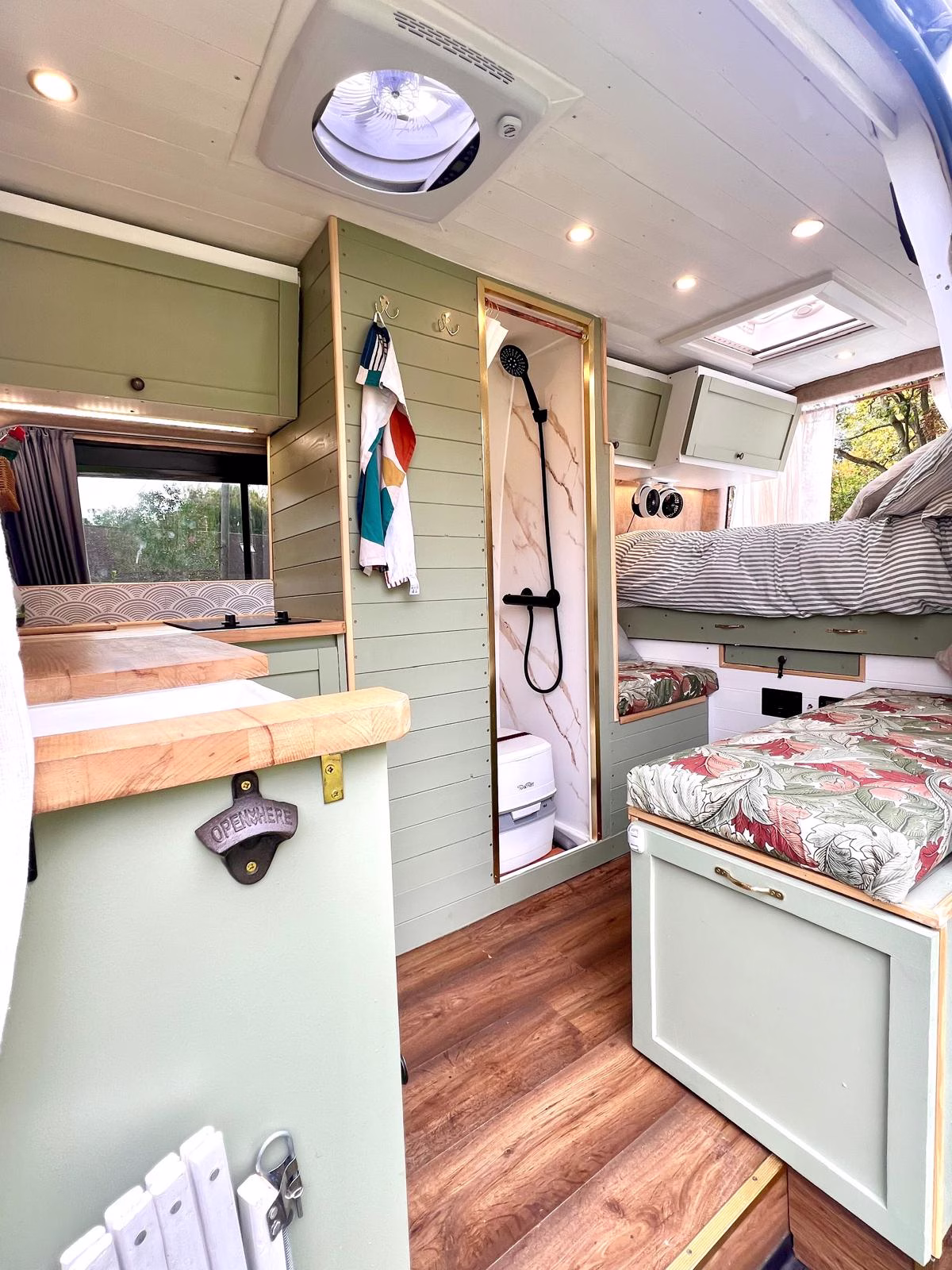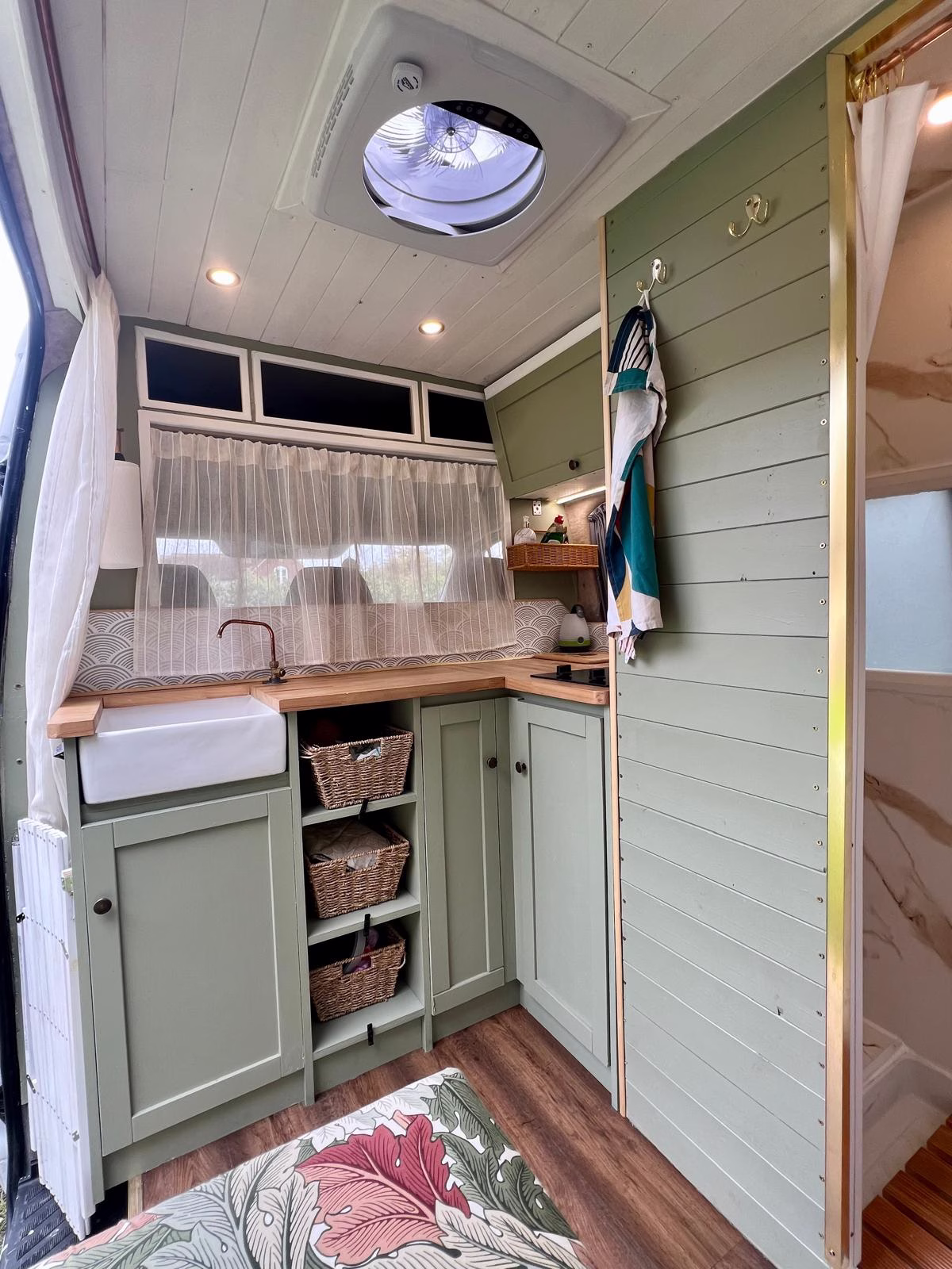 – Beautiful butler sink and custom made copper tap with switch and submersible pump with 2 x 10l tanks stored below (1 fresh, 1 grey).