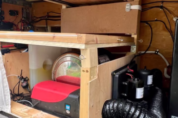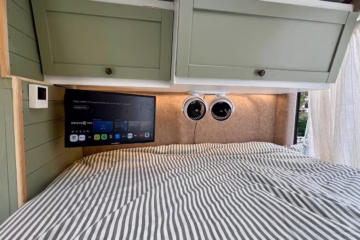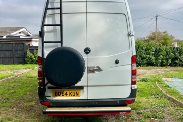 The van is fully insulated all round with a combination of 25/50mm Celotex, Dodo fleece and Dodo thermoliner – so perfectly warm in winter and keeps things cool in summer – also helped by the brand new Normadic Ark Airplus fan in the front and roof-light in the rear above the bed (both have black out blinds). There is plenty of above head cupboard space, kitchen units, underseat storage, bulk head space, plus the garage in the rear. It should also be noted that it comes with a custom rear ladder/spare wheel storage and c-grip awning rail (Stitches and Steel 125 awning included). Now for the breakdown: