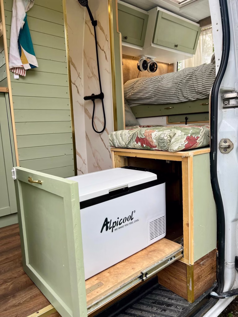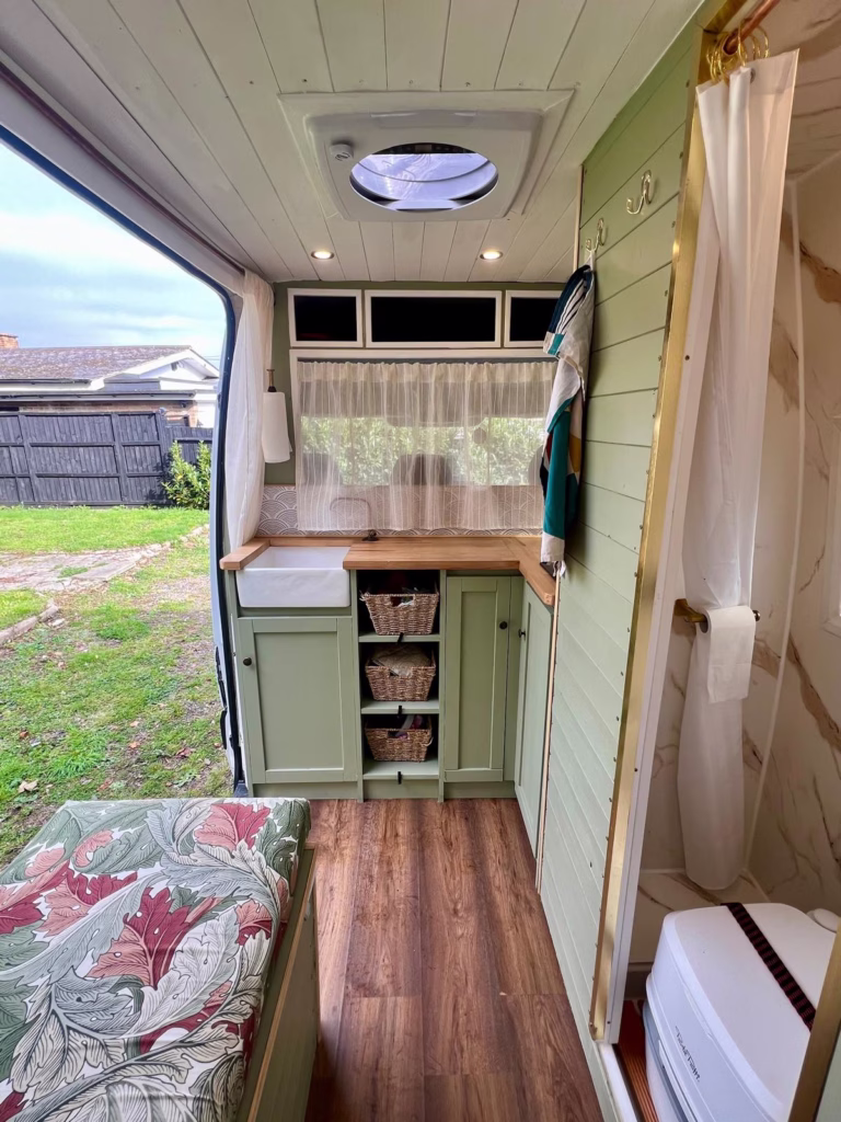 – Beautiful butler sink and custom made copper tap with switch and submersible pump with 2 x 10l tanks stored below (1 fresh, 1 grey).