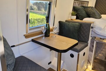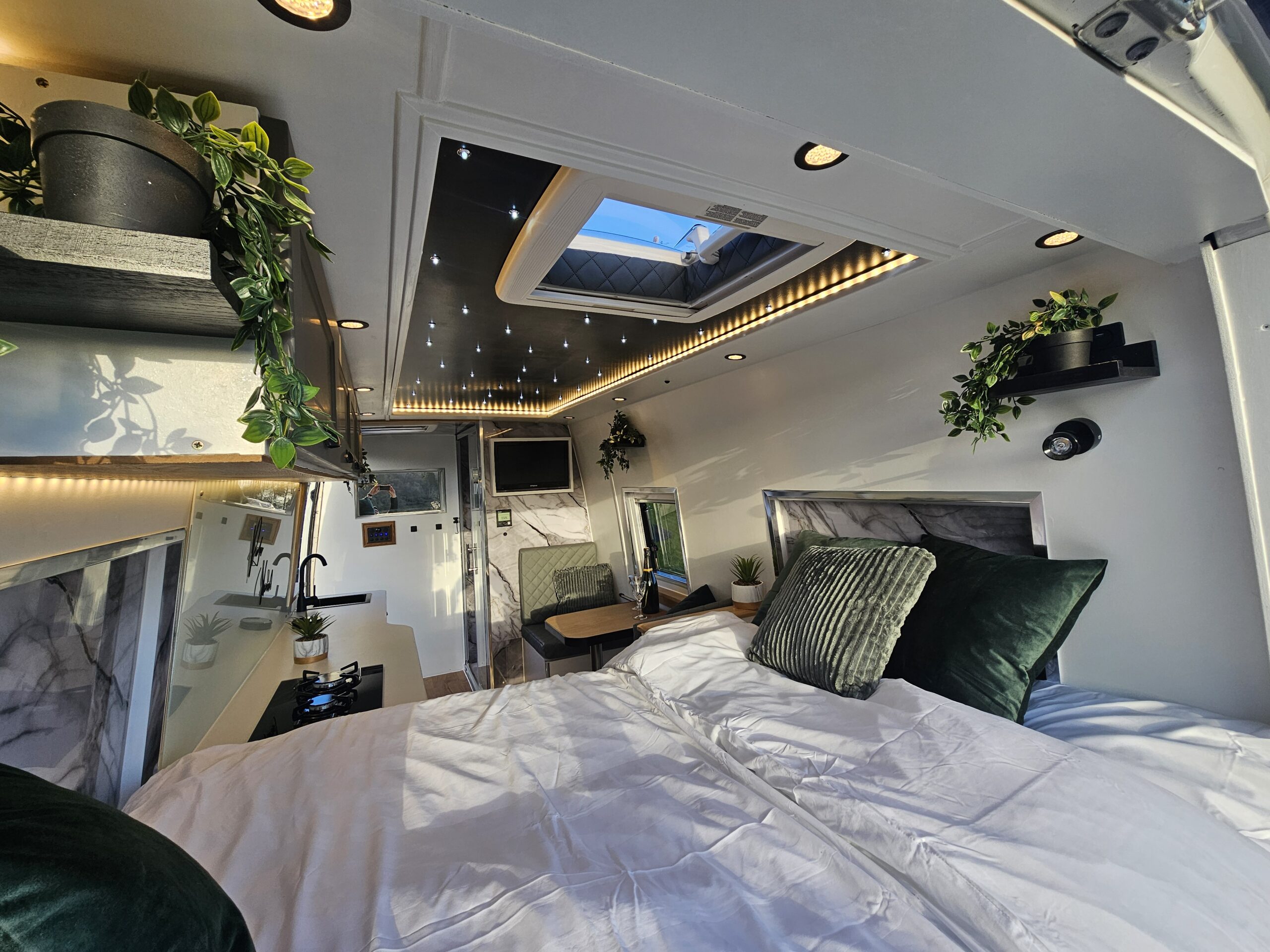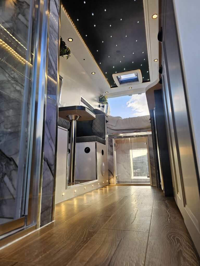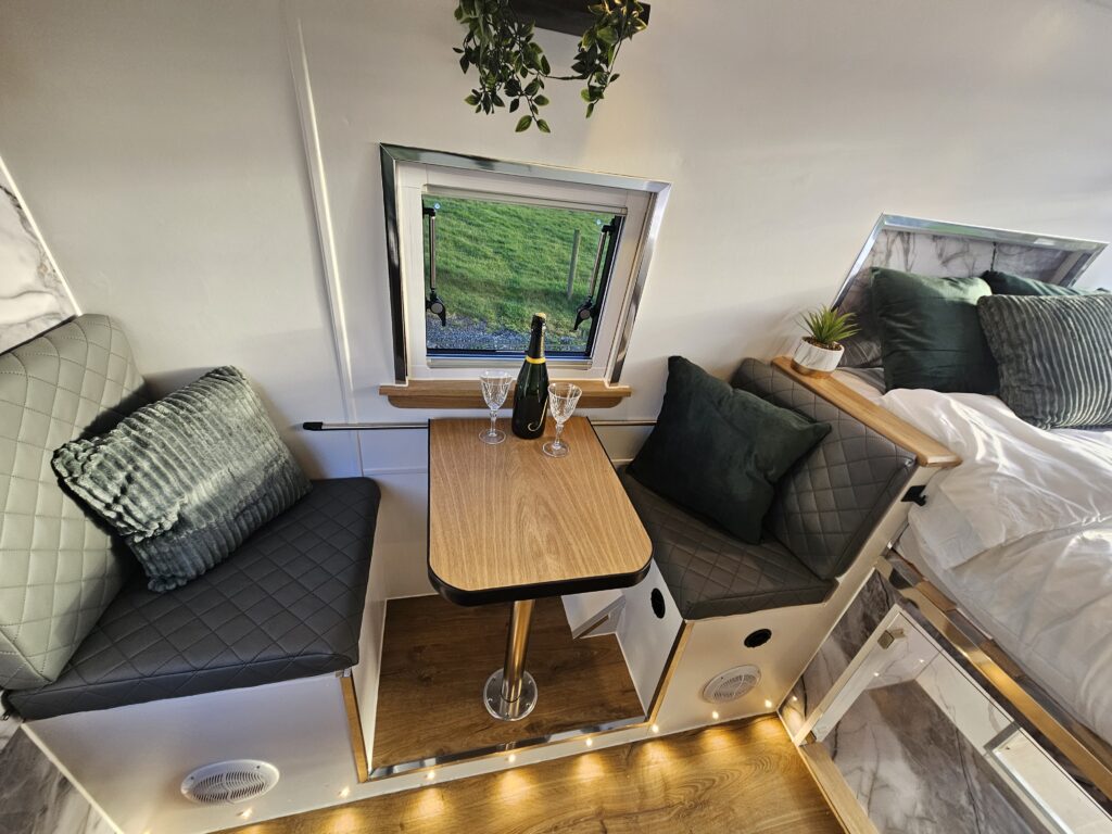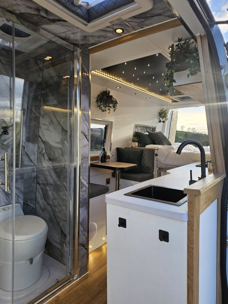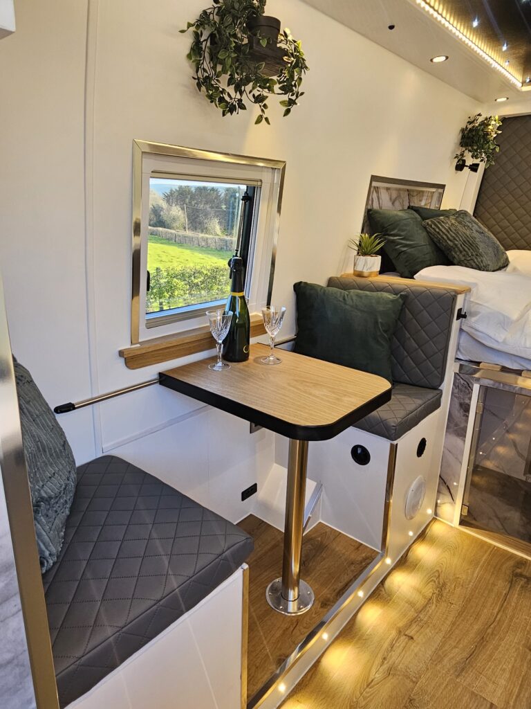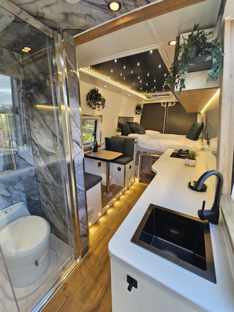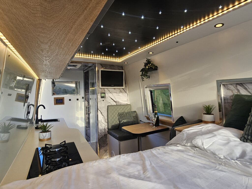 Professionally converted with shower and enclosure , electric cassette toilet, double bed, gorgeous kitchenette, fitted 12v /electric fridge and gas hob ,