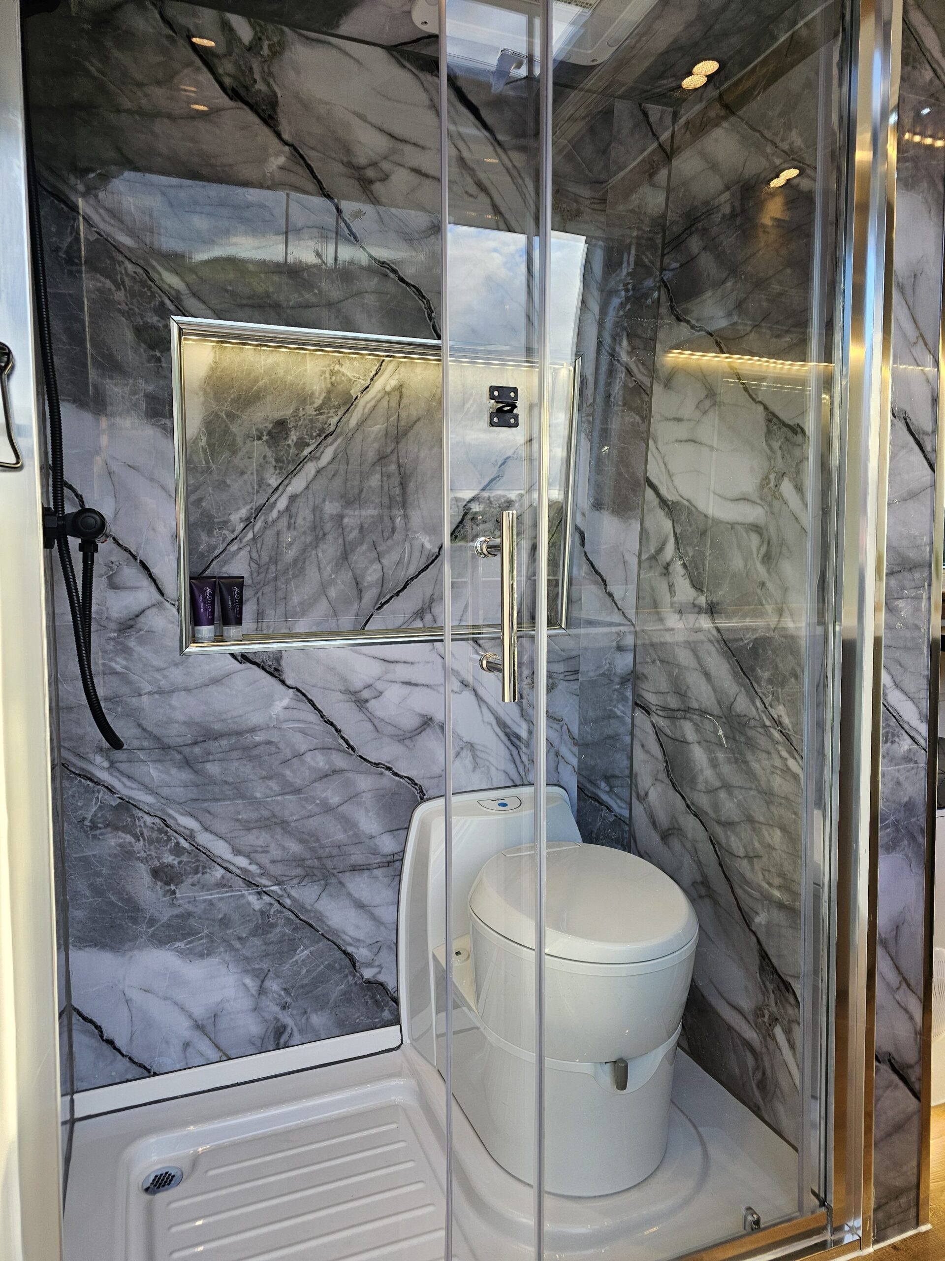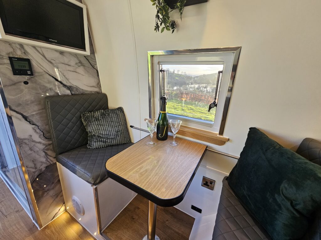 Boasts a full size shower and enclosure, double bed, gorgeous kitchenette, fitted fridge and built in cassette toilet with electric flush .