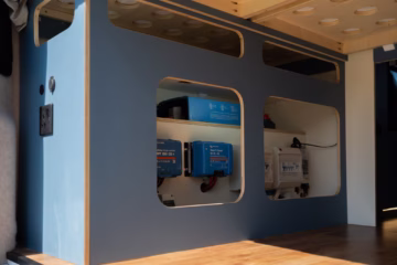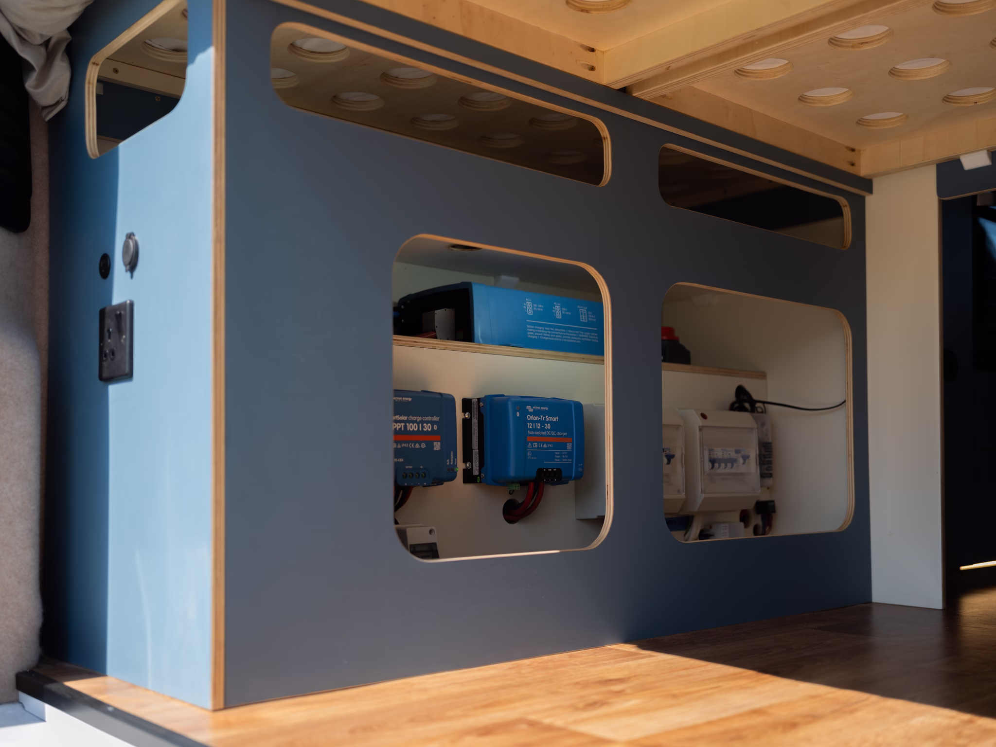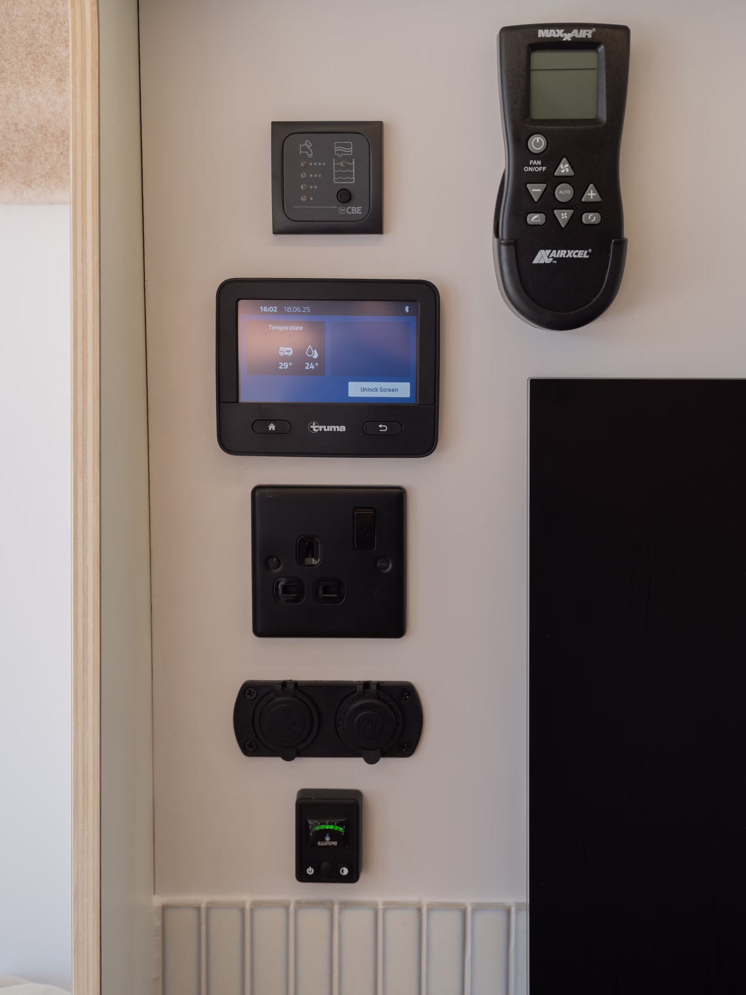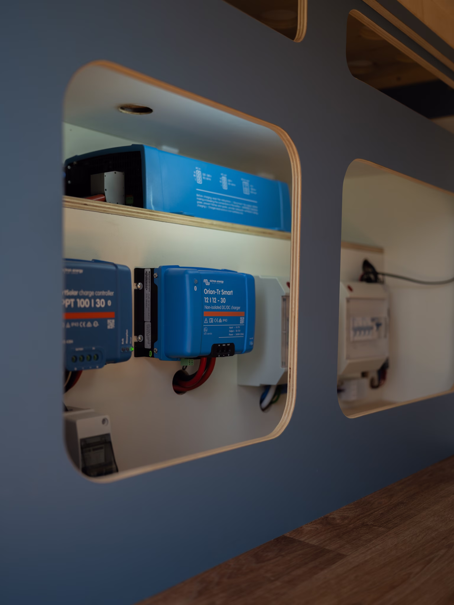 Power comes from a full Victron electrical system with a Fogstar lithium battery, supported by solar, DC to DC charging and shore power, giving multiple charging options and keeping you comfortably off grid.