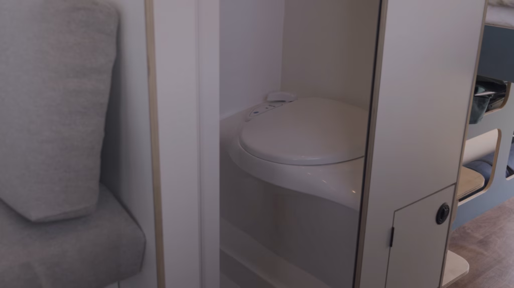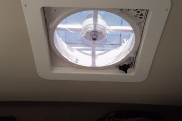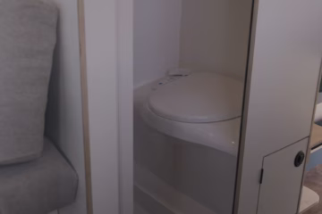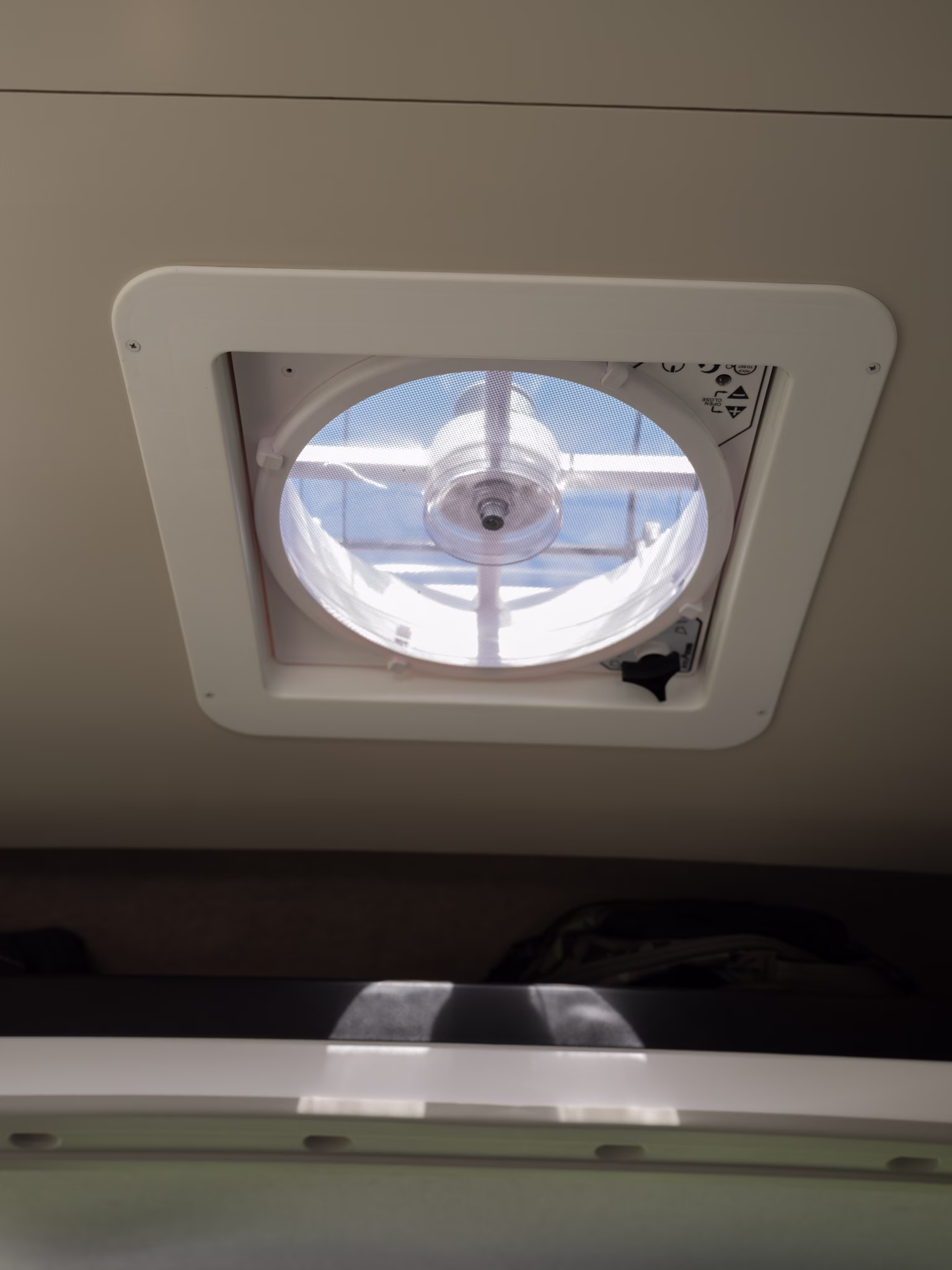 Storage is generous throughout, with well designed overhead cupboards and practical spaces everywhere. Above the bed, a large skylight floods the area with natural light by day and is perfect for stargazing at night.