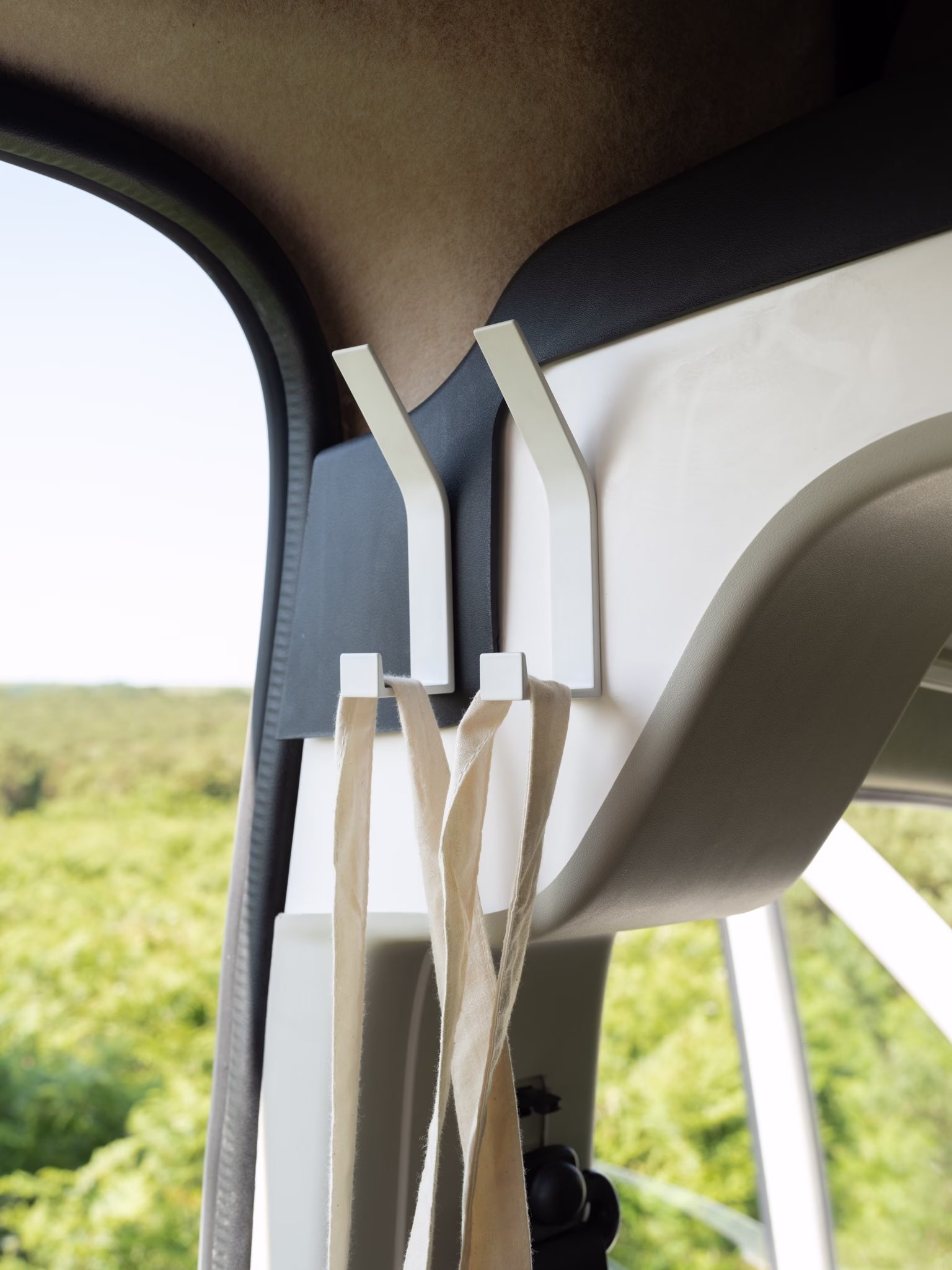 Standing height is 6’2 with an internal width of 6’3. At the front, twin swivel seats open directly into the living space, working alongside a comfortable sofa, Lagoon table mount and folding worktop to create a flexible lounge with multiple seating and work configurations. A Maxxair fan keeps fresh air moving and the interior comfortable in all conditions.