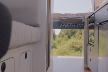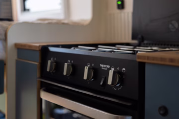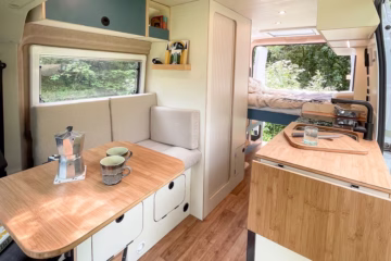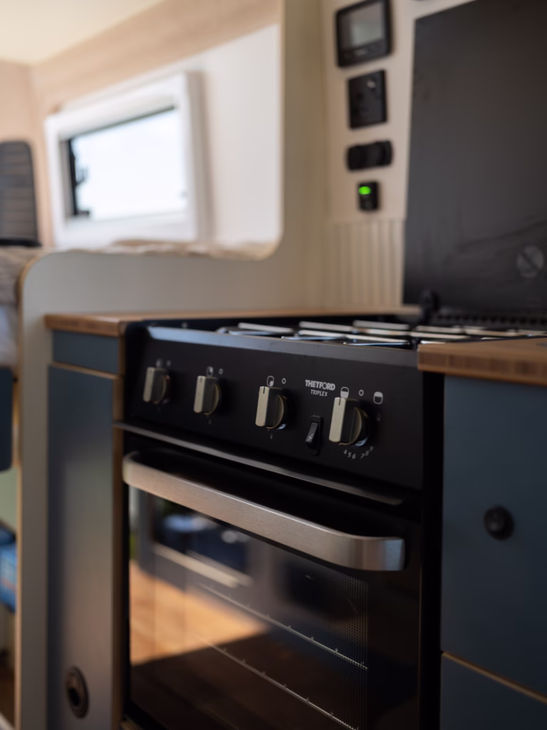 The kitchen is designed to make cooking effortless, whether it’s a quick morning coffee or a proper three course meal. It features an 80 litre Dometic fridge, a large bamboo worktop with a flip up extension, and a full size sink with a rotating tap that’s perfect for rinsing sandy feet or using as an outdoor shower. A gas hob, oven and grill mean you can cook properly wherever you park up.