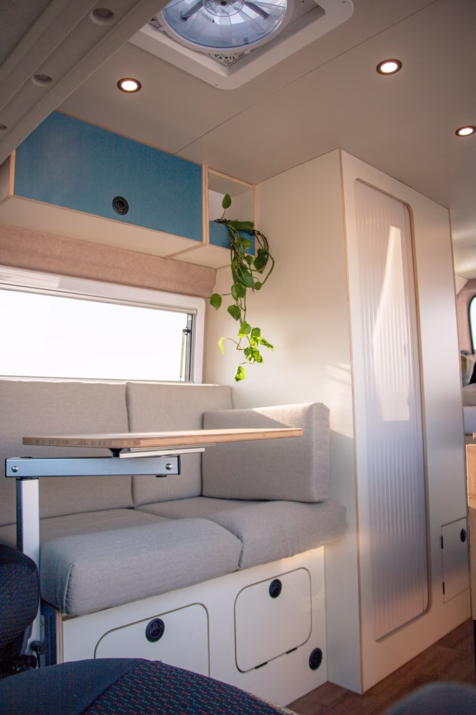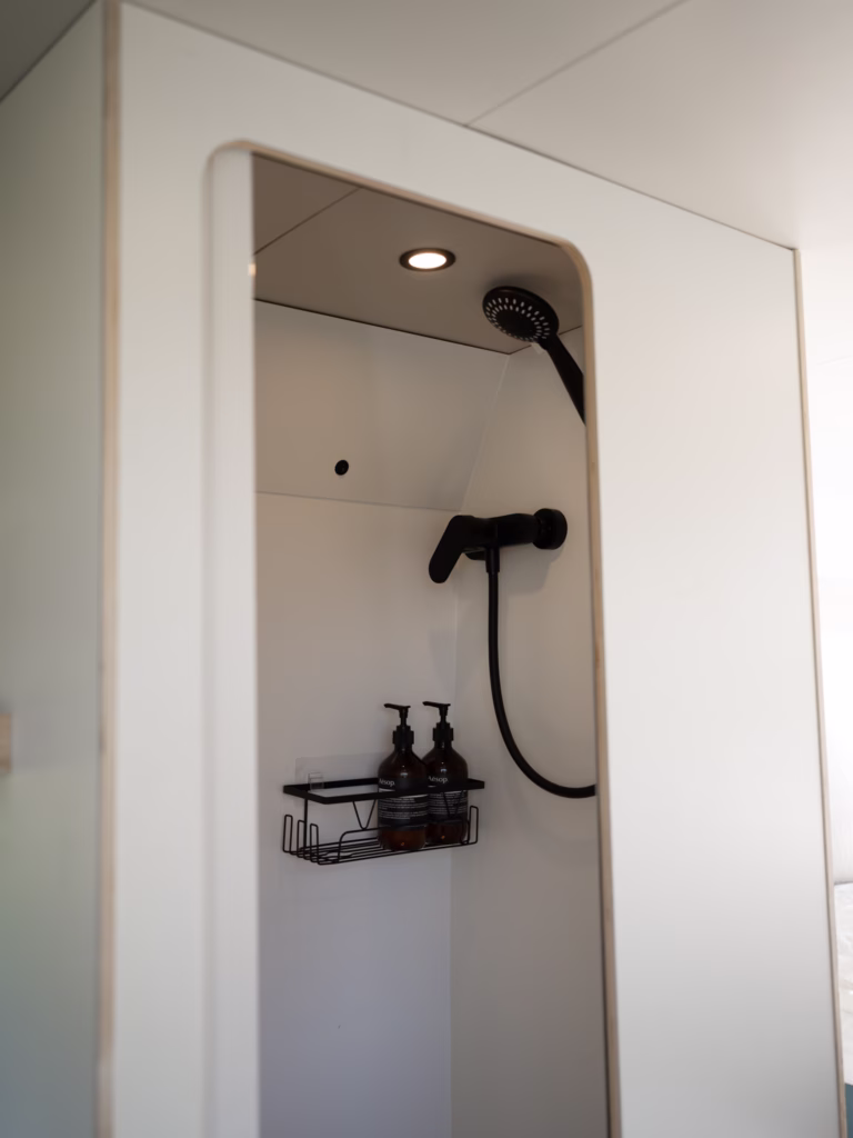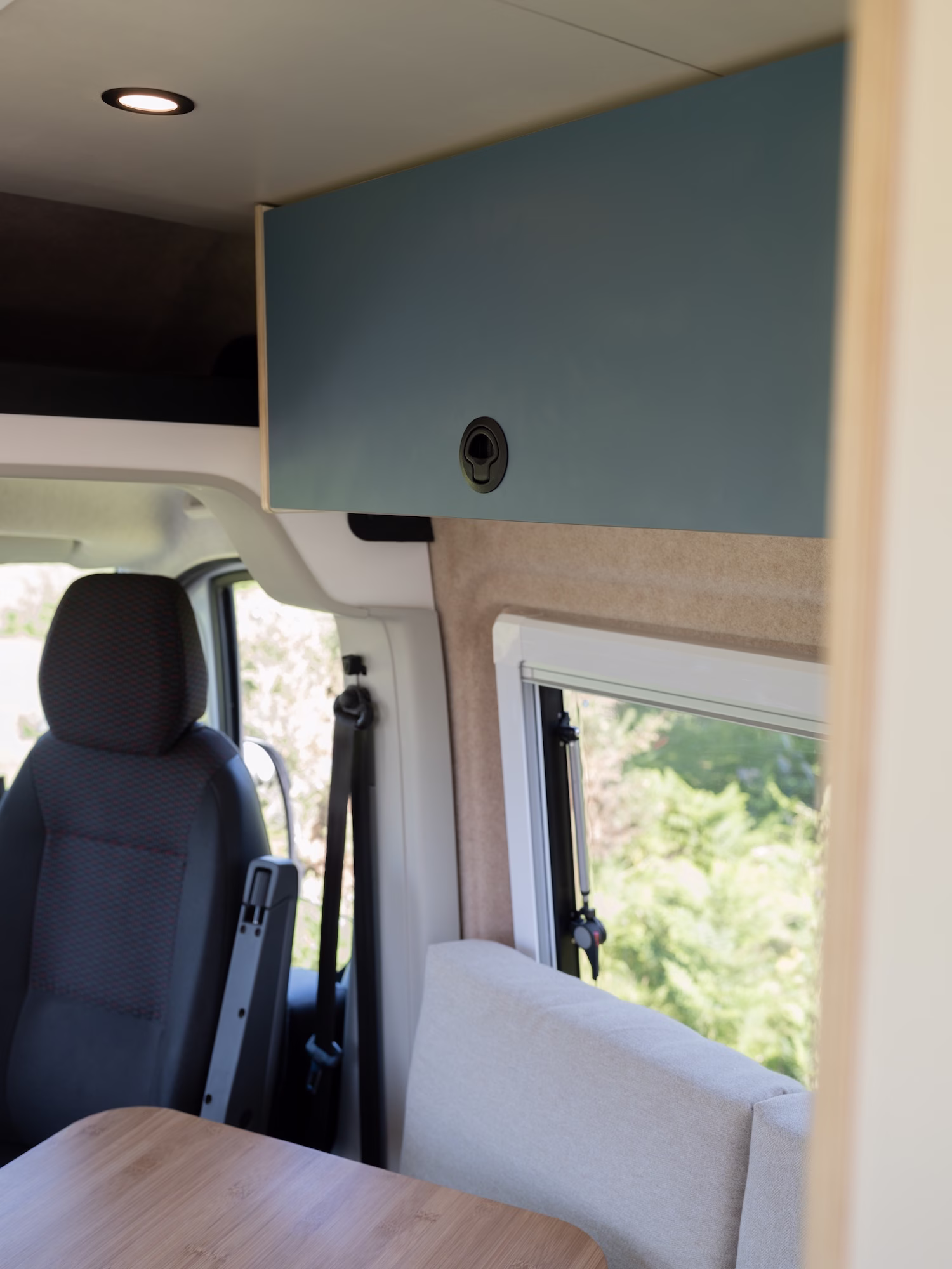 This is our latest show van, The Bluebird. Built on a Citroën Relay L3 H2, it is fully equipped for comfortable off grid living. Inside you’ll find a generous lounge with a sofa bed, a full shower and drying room, a fixed bed and a spacious kitchen designed for everyday use.