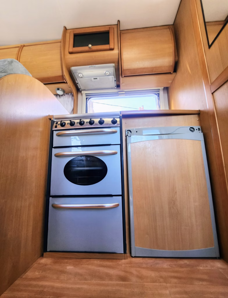 => Kitchen – Your On-board cooking facilities feature gas-powered cooking hobs, oven, grill, sink & taps with both hot & cold water, under-counter fridge, kitchen storage and clean food-prep surfaces throughout