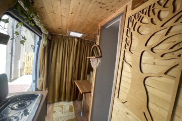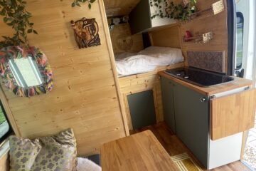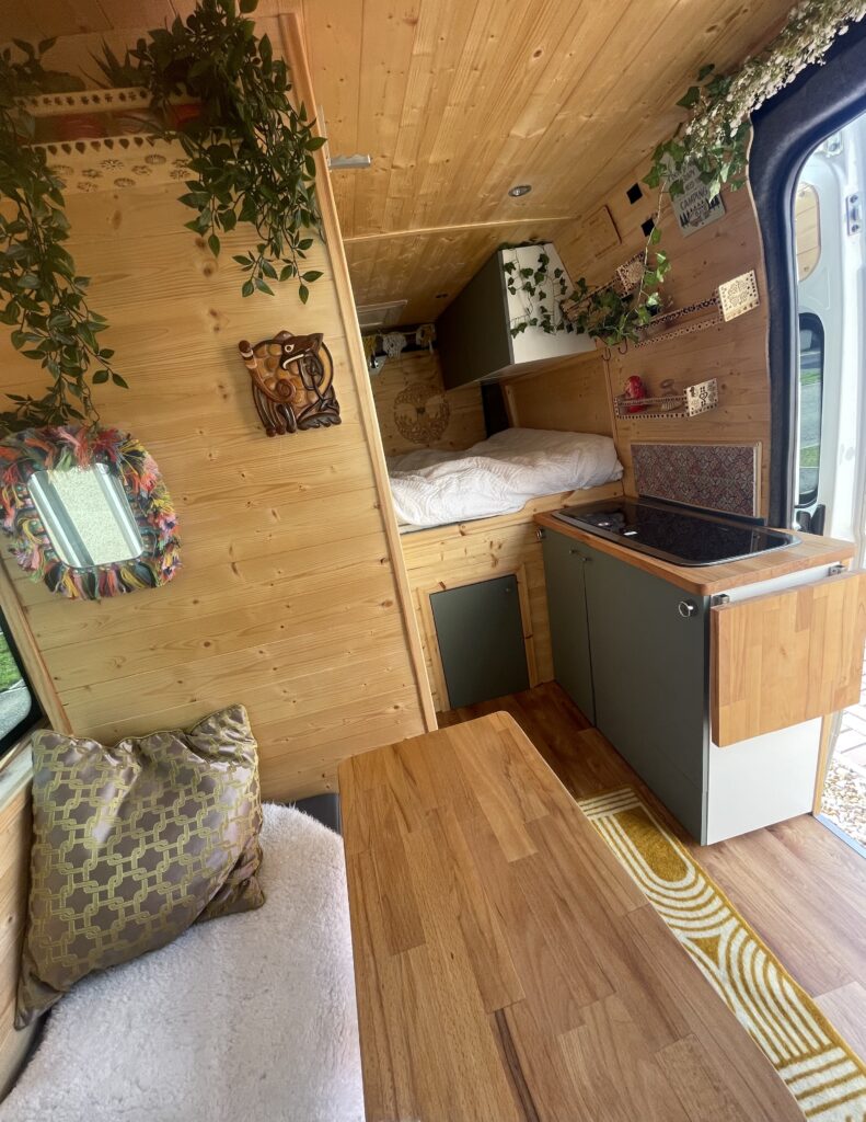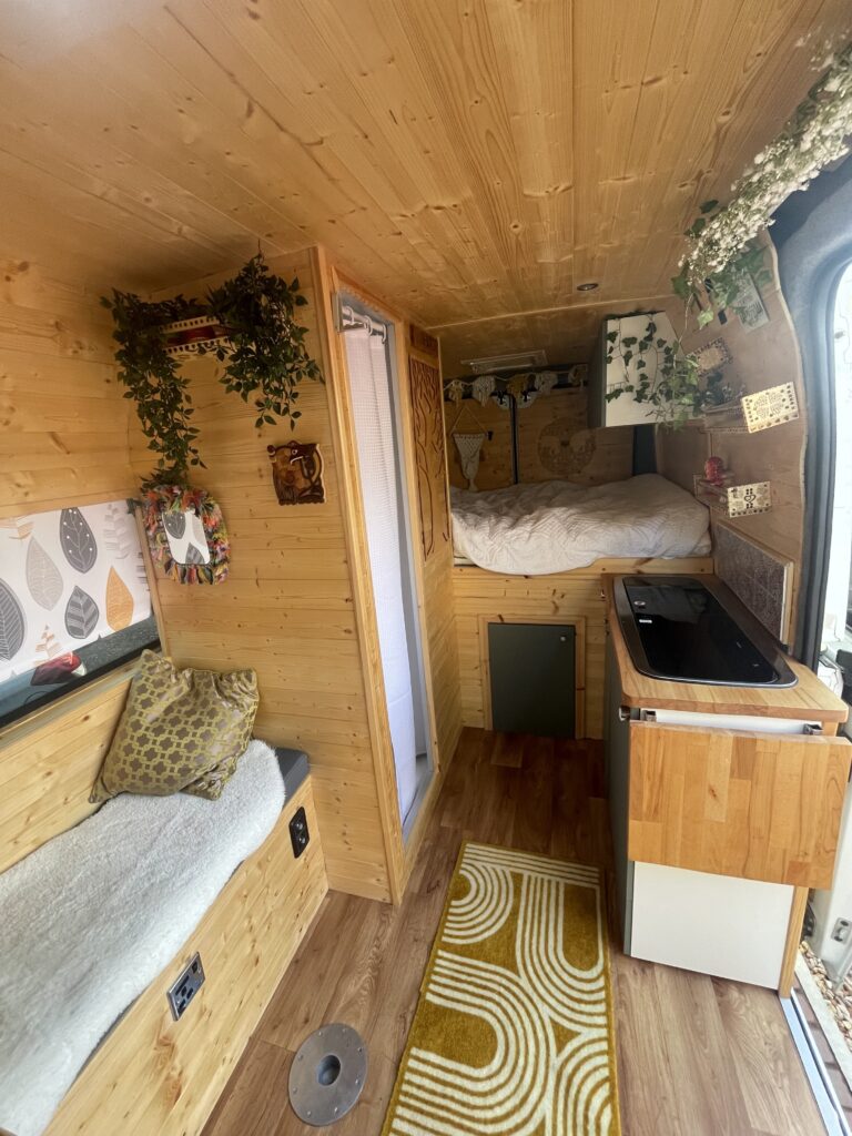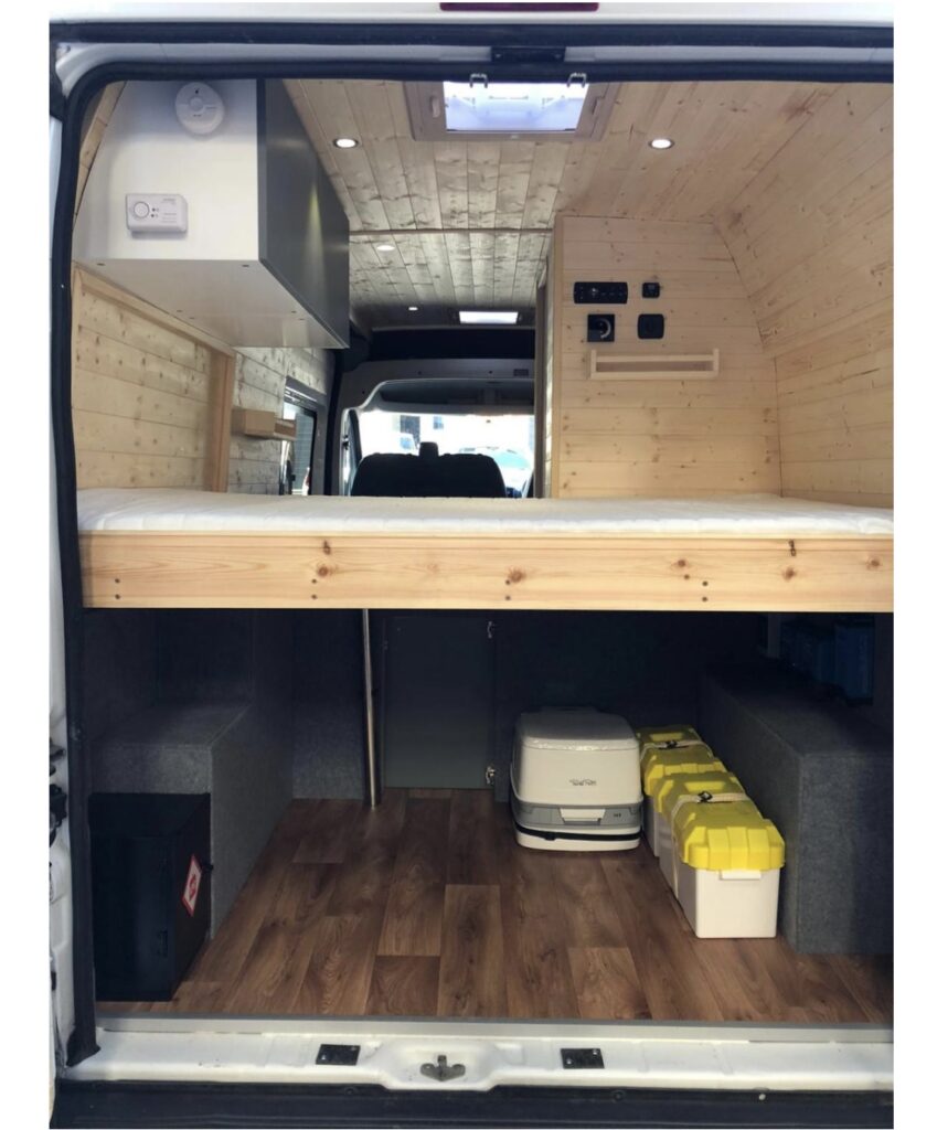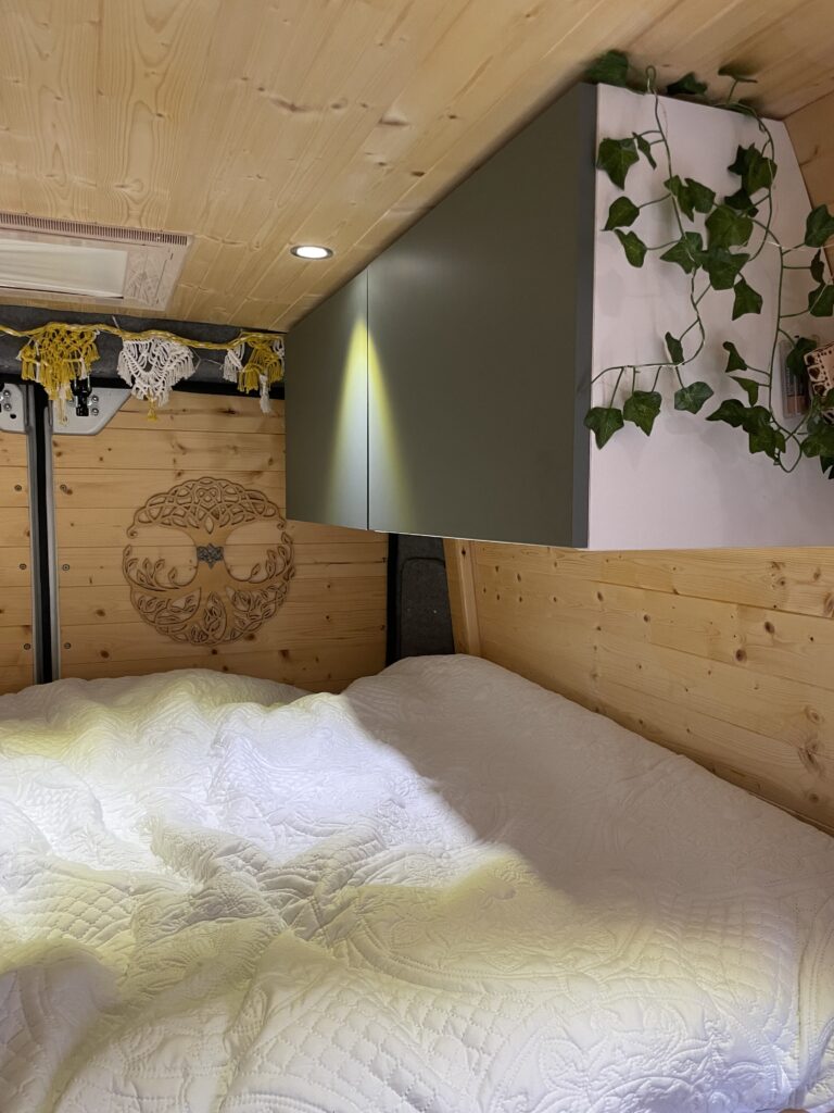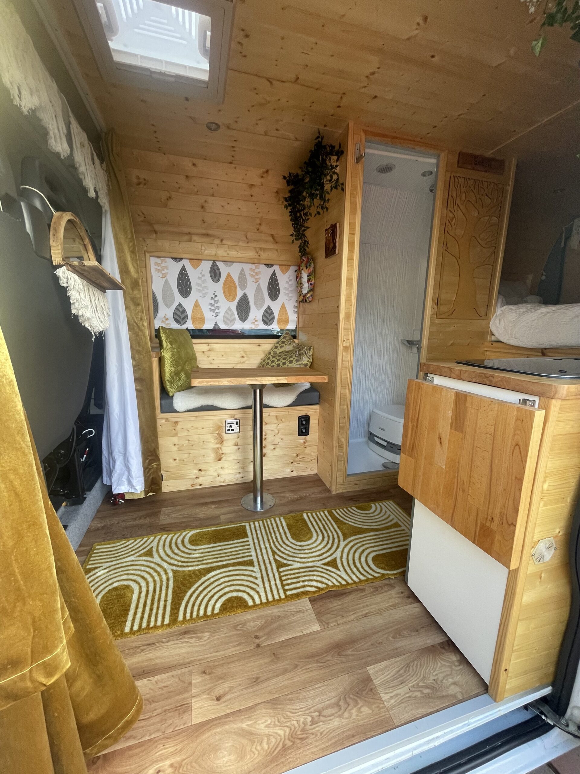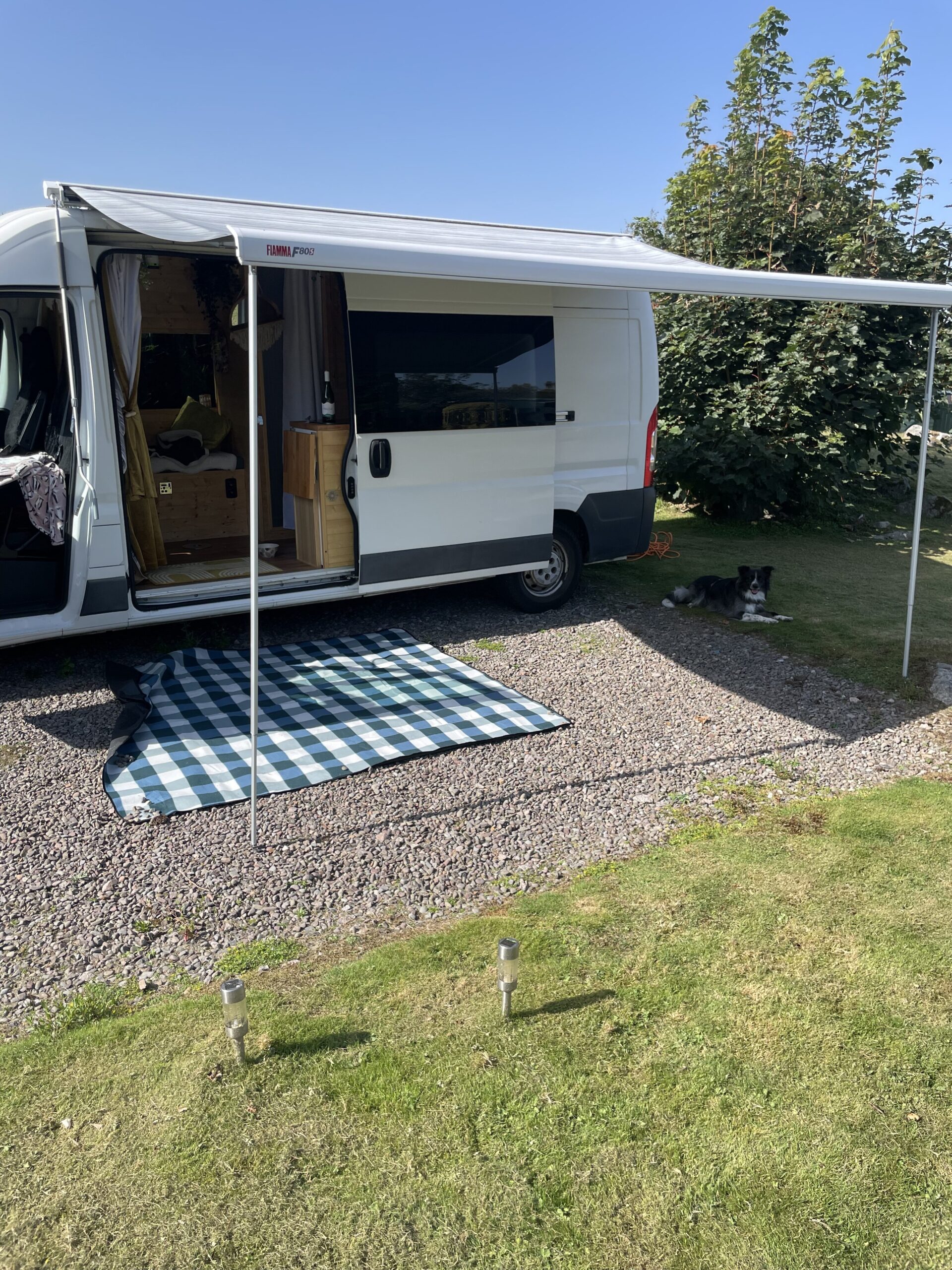 A beautiful bespoke, but professionally converted, camper van to be proud of . Looked after beautifully. Spruce timber clad throughout : solid beech removable table ( with cushioned bench) and also timber lift up extension board for galley and 2 storage cupboards for when the chef urge comes on and veg WILL be chopped! Smev combined 2 burner stove plus sink with tap, covered by black glass lid. 2.75kg full butane gas bottle in security box in boot with regulator to get the sausages sizzling and a Porta loo for after. Brand new shower -95cmx 70cm with fan & 2 under slung water tanks -83 litre fresh water / 63 grey. Fully off grid with solar package – 2x AGM 110ah leisure batteries : Solar panel; Epsolar MPPT controller-30a charges. Split- charge relay between leisure/ van batteries. Trickle charger for leisure batteries from mains electric when on grid. Brilliant Truma boiler , highly effective even in deepest winter with option for thermostat setting : control through App. A smart, smart camper designed to make the use of natural energy but ensure you don’t run out of juice. Good for women camping alone off grid like me and anyone not wanting to get stranded. 230v electric socket , multiple USB posts in living and bedroom areas and control panel by bed . Rockwall heavy duty insulation ( I’m in Scotland , and I still need to get out there !) for warmth and sound. Magnetic thermal window covers when it’s snow outside but the van is calling . 2 roof vents, light and bright when you want it , and velvet curtains with 6 LED mood lights plus fairy lights for when the day is done . Wall cabinets for all yer kit: huge garage underneath with access from cubby under bed if you need a beer or whatever and don’t want to leave the van. Fiamma awning and a 2023 drive away inflatable awning / tent included free worth £600. Unladen weight leaves lots of room for kit ( stated weight includes driver).
