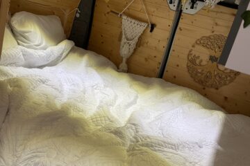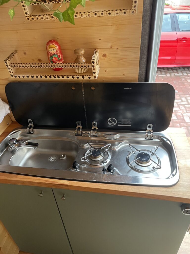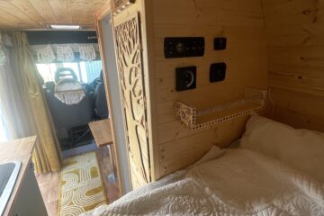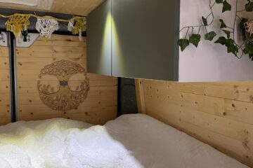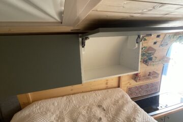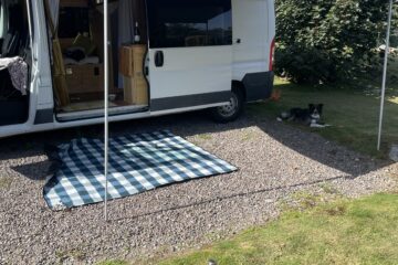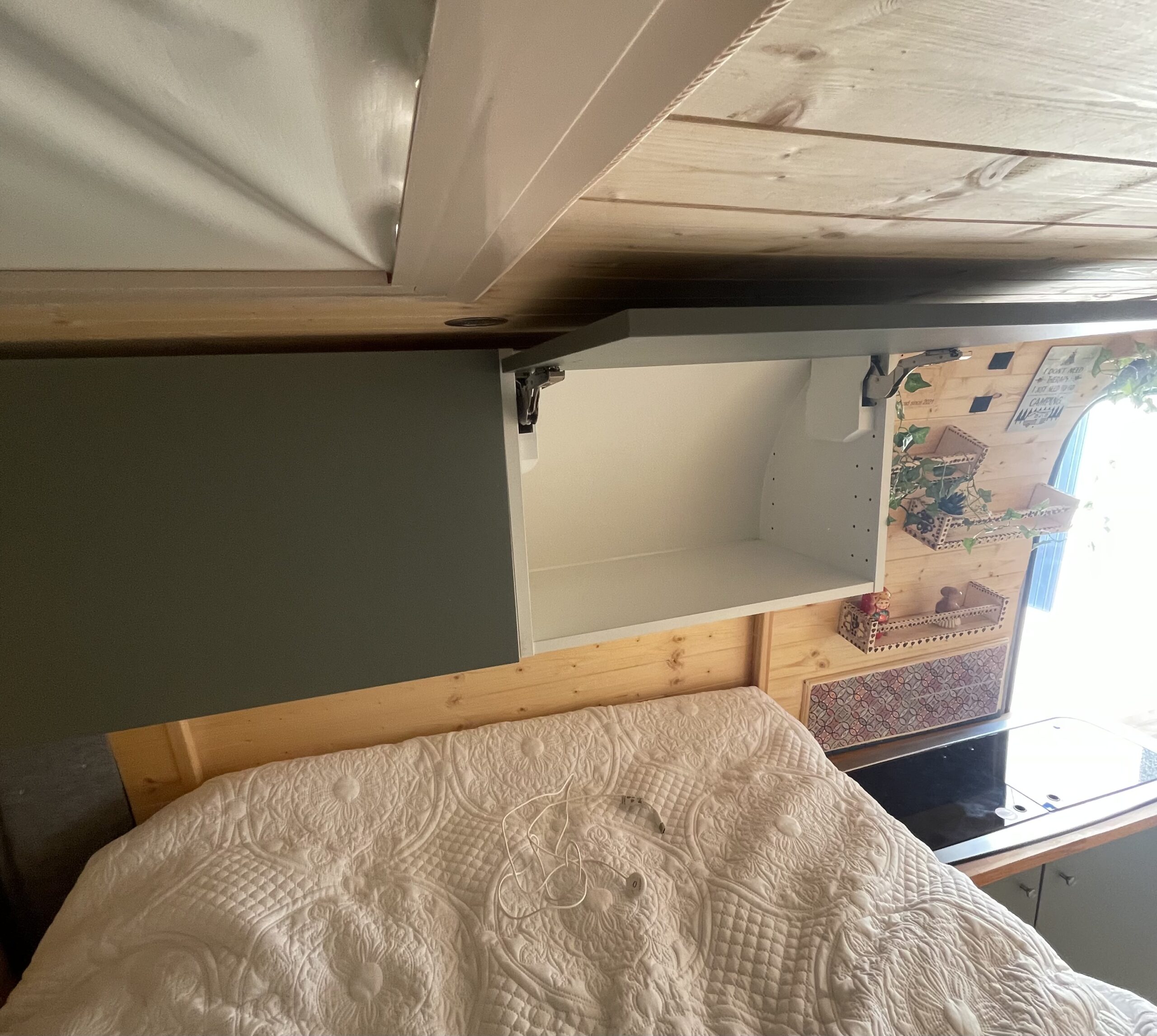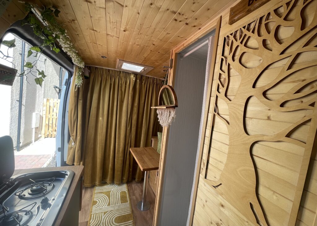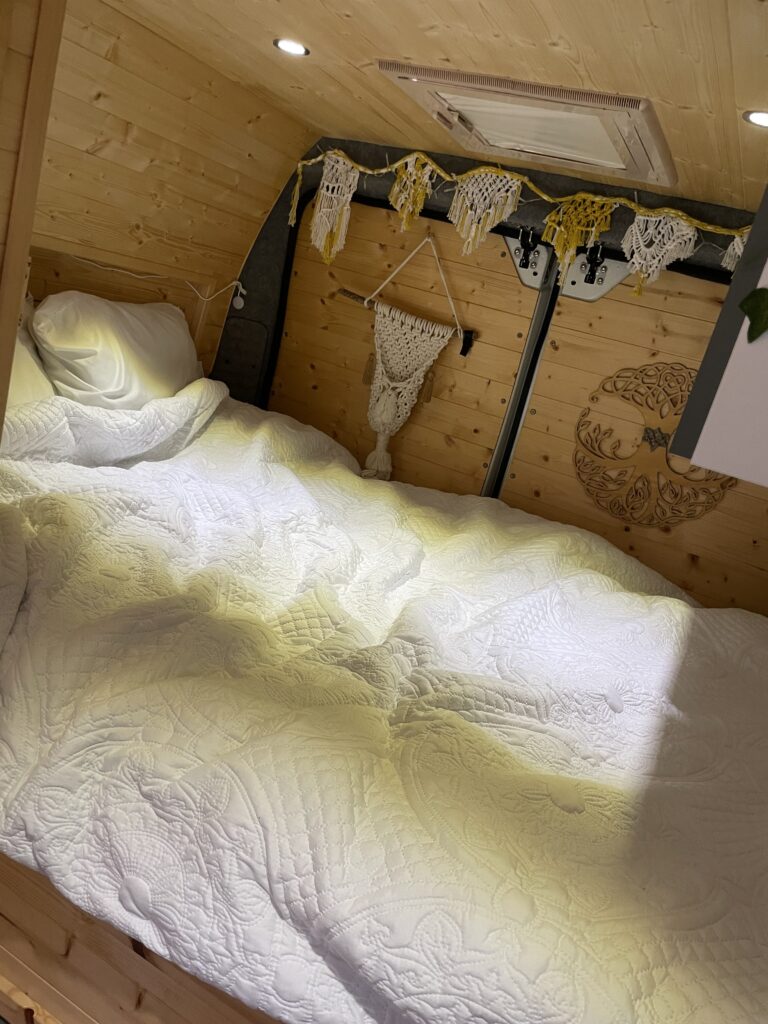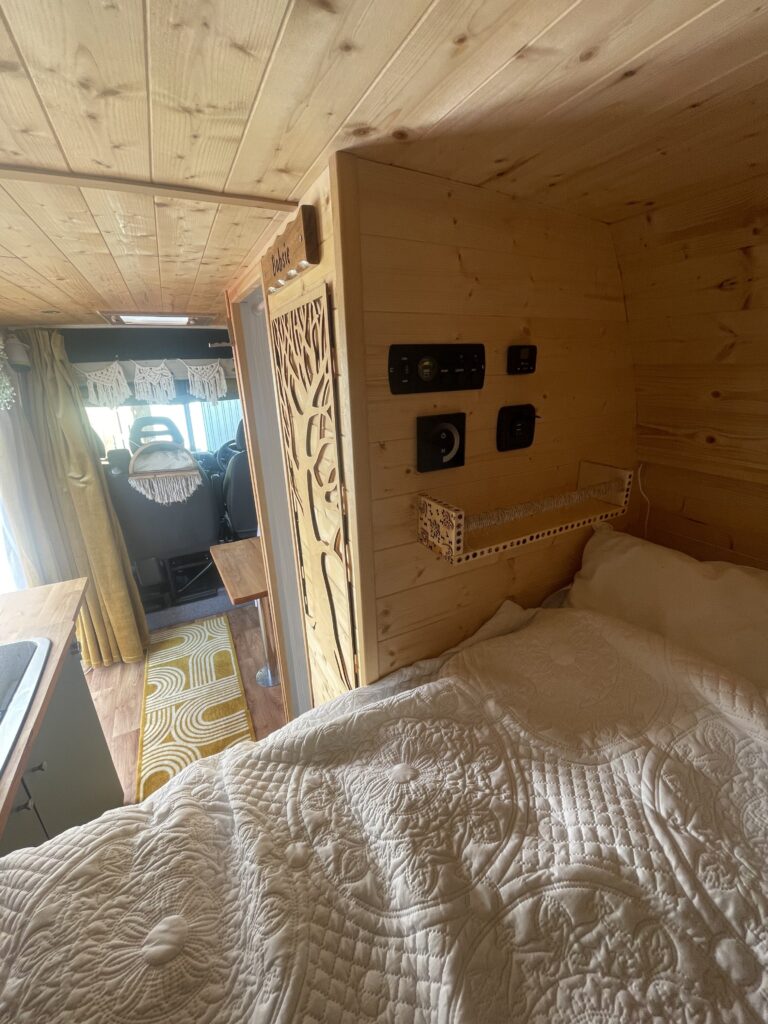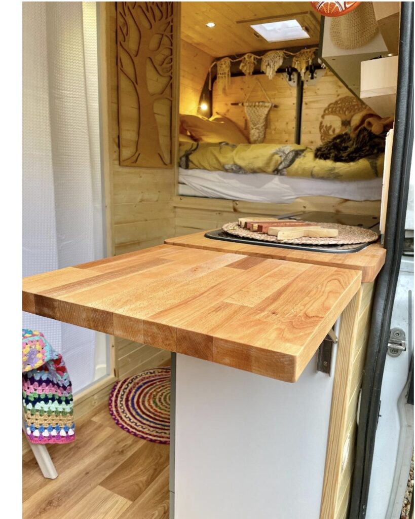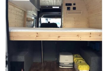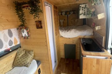 A beautiful bespoke, but professionally converted, camper van to be proud of . Looked after beautifully. Spruce timber clad throughout : solid beech removable table ( with cushioned bench) and also timber lift up extension board for galley and 2 storage cupboards for when the chef urge comes on and veg WILL be chopped! Smev combined 2 burner stove plus sink with tap, covered by black glass lid. 2.75kg full butane gas bottle in security box in boot with regulator to get the sausages sizzling and a Porta loo for after. Brand new shower -95cmx 70cm with fan & 2 under slung water tanks -83 litre fresh water / 63 grey. Fully off grid with solar package – 2x AGM 110ah leisure batteries : Solar panel; Epsolar MPPT controller-30a charges. Split- charge relay between leisure/ van batteries. Trickle charger for leisure batteries from mains electric when on grid. Brilliant Truma boiler , highly effective even in deepest winter with option for thermostat setting : control through App. A smart, smart camper designed to make the use of natural energy but ensure you don’t run out of juice. Good for women camping alone off grid like me and anyone not wanting to get stranded. 230v electric socket , multiple USB posts in living and bedroom areas and control panel by bed . Rockwall heavy duty insulation ( I’m in Scotland , and I still need to get out there !) for warmth and sound. Magnetic thermal window covers when it’s snow outside but the van is calling . 2 roof vents, light and bright when you want it , and velvet curtains with 6 LED mood lights plus fairy lights for when the day is done . Wall cabinets for all yer kit: huge garage underneath with access from cubby under bed if you need a beer or whatever and don’t want to leave the van. Fiamma awning and a 2023 drive away inflatable awning / tent included free worth £600. Unladen weight leaves lots of room for kit ( stated weight includes driver).