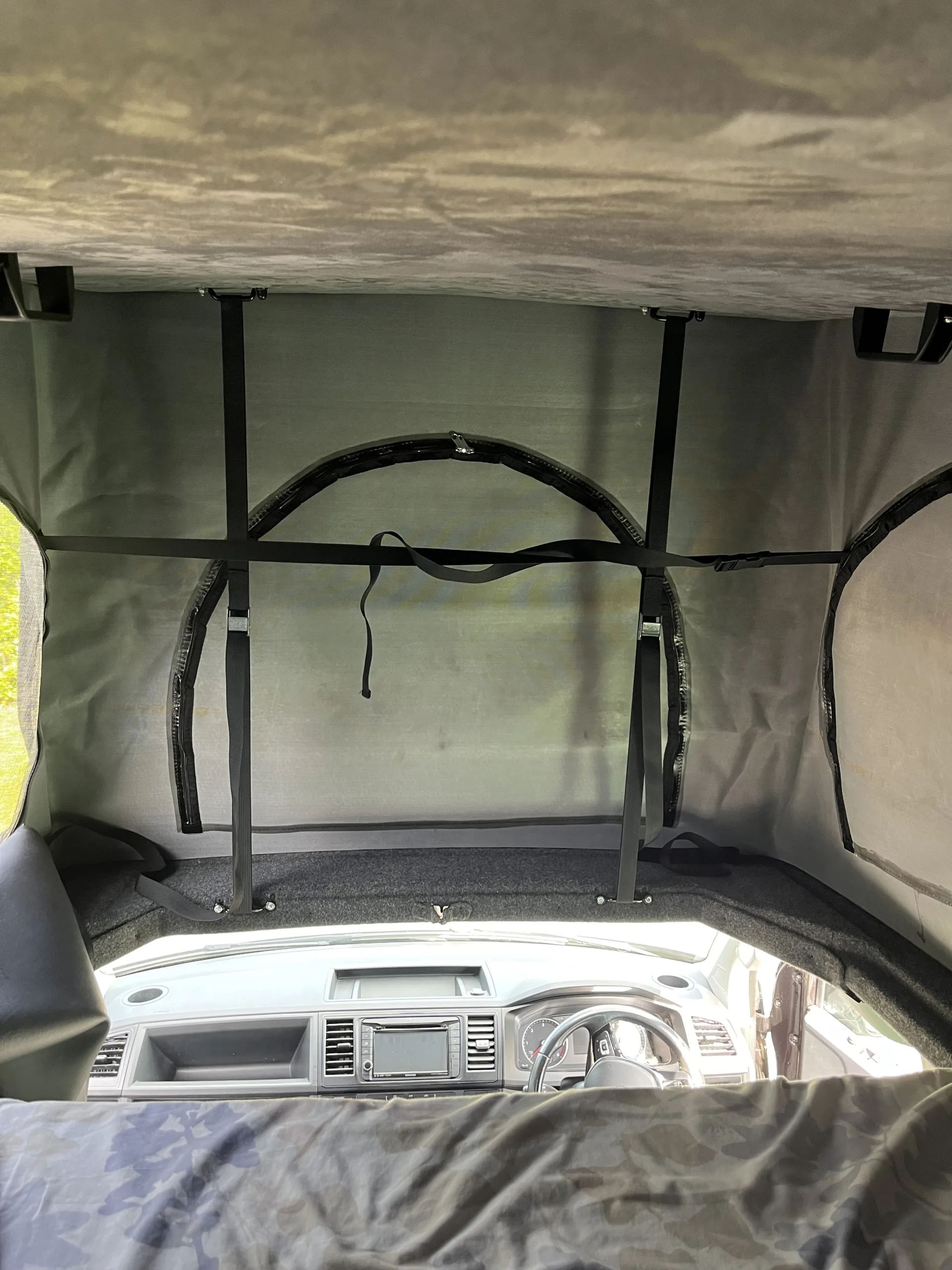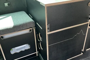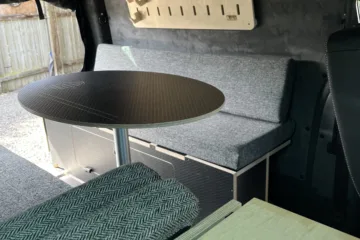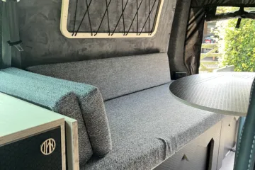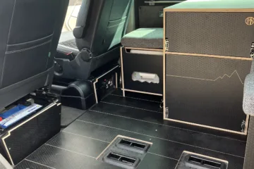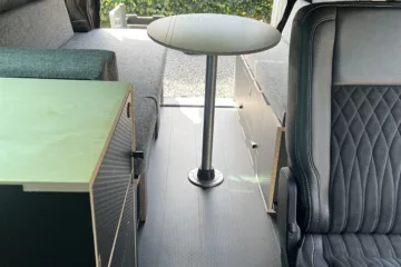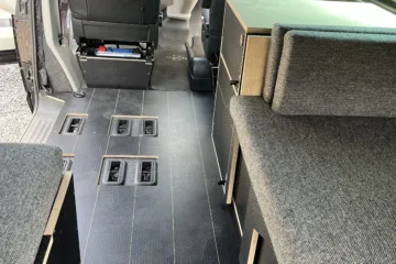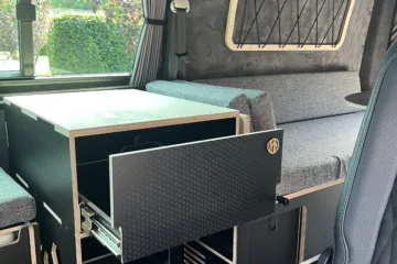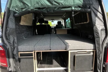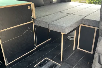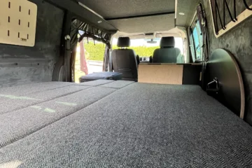 It is super flexible and can be used as a spacious 2-berth camper with the roof up giving more head room, 3 berth (and 3 belted seats) using the pop top bed, 4 berth (replacing a couple of units with the bench seat) or remove the units completely for a 5-seat kombi van. In kombi mode it can easily be used as a second vehicle for day to day use. Super easy to remove the units – they’re just bolted to the floor.
