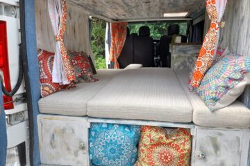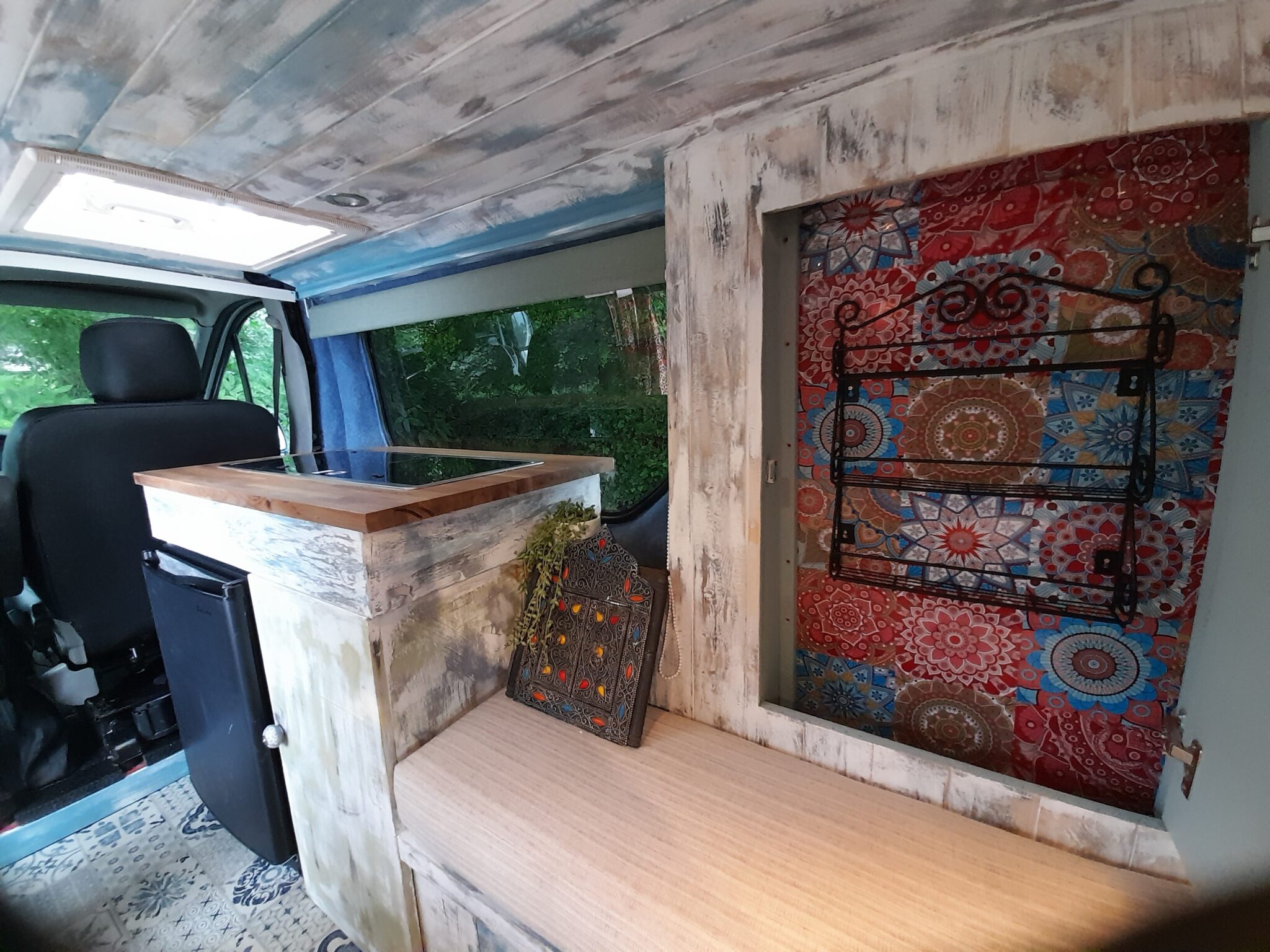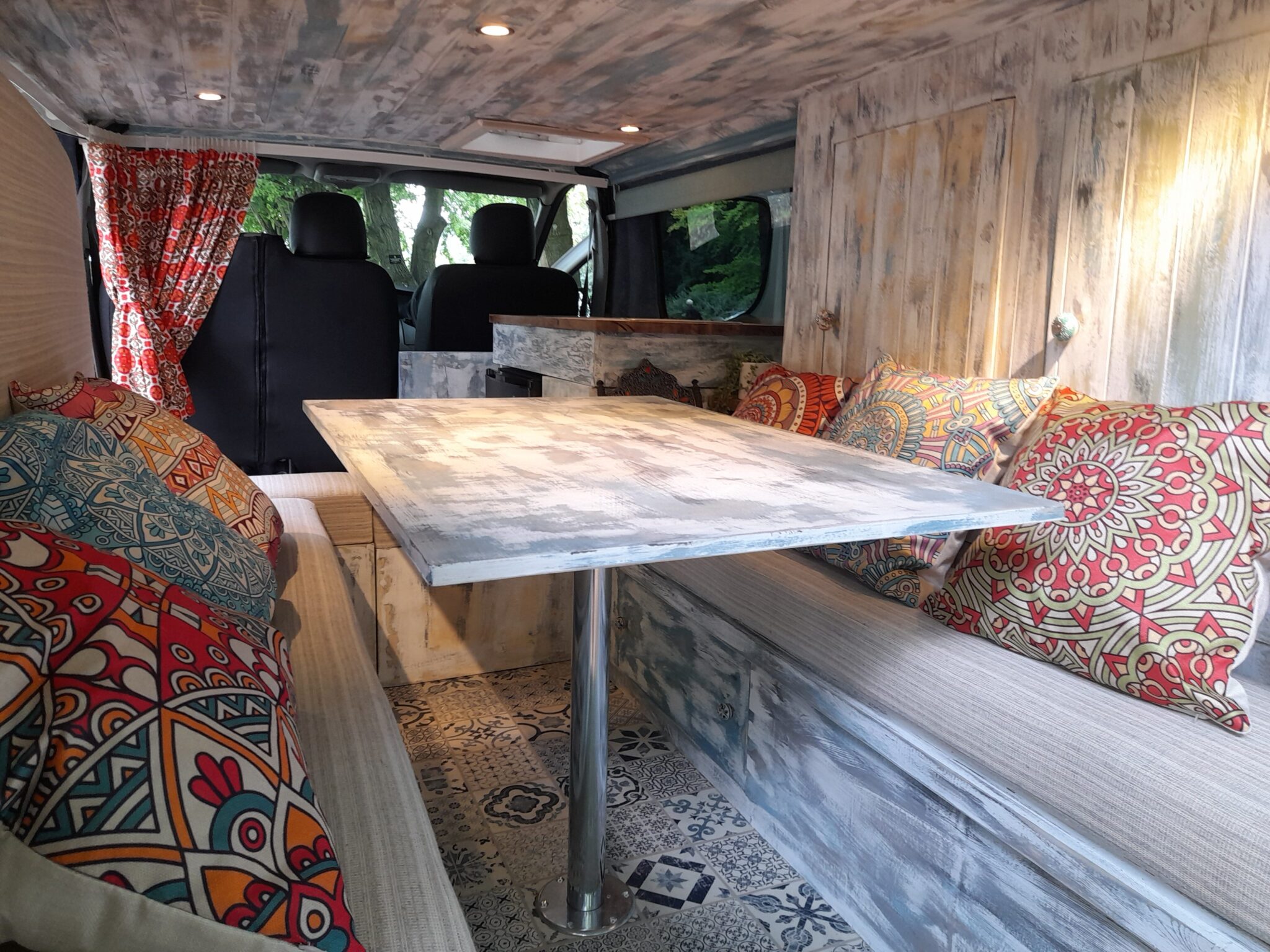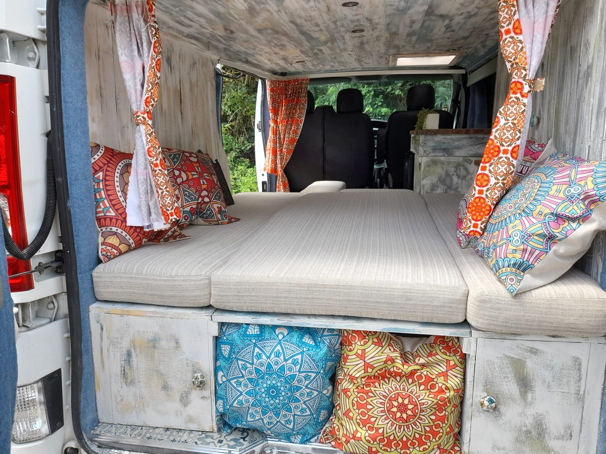 Bespoke design and totally unique in style this conversion was conceived as a high end campervan experience with quality upholstery and meticulously detailed hand-painted wood finish. The aim (which I think we achieved) was to look and feel like a surf shack on wheels. Light, bright, colourful and spacious interior, unusually comfortable and spacious double bed and hand picked fabrics and cushions complete the look.