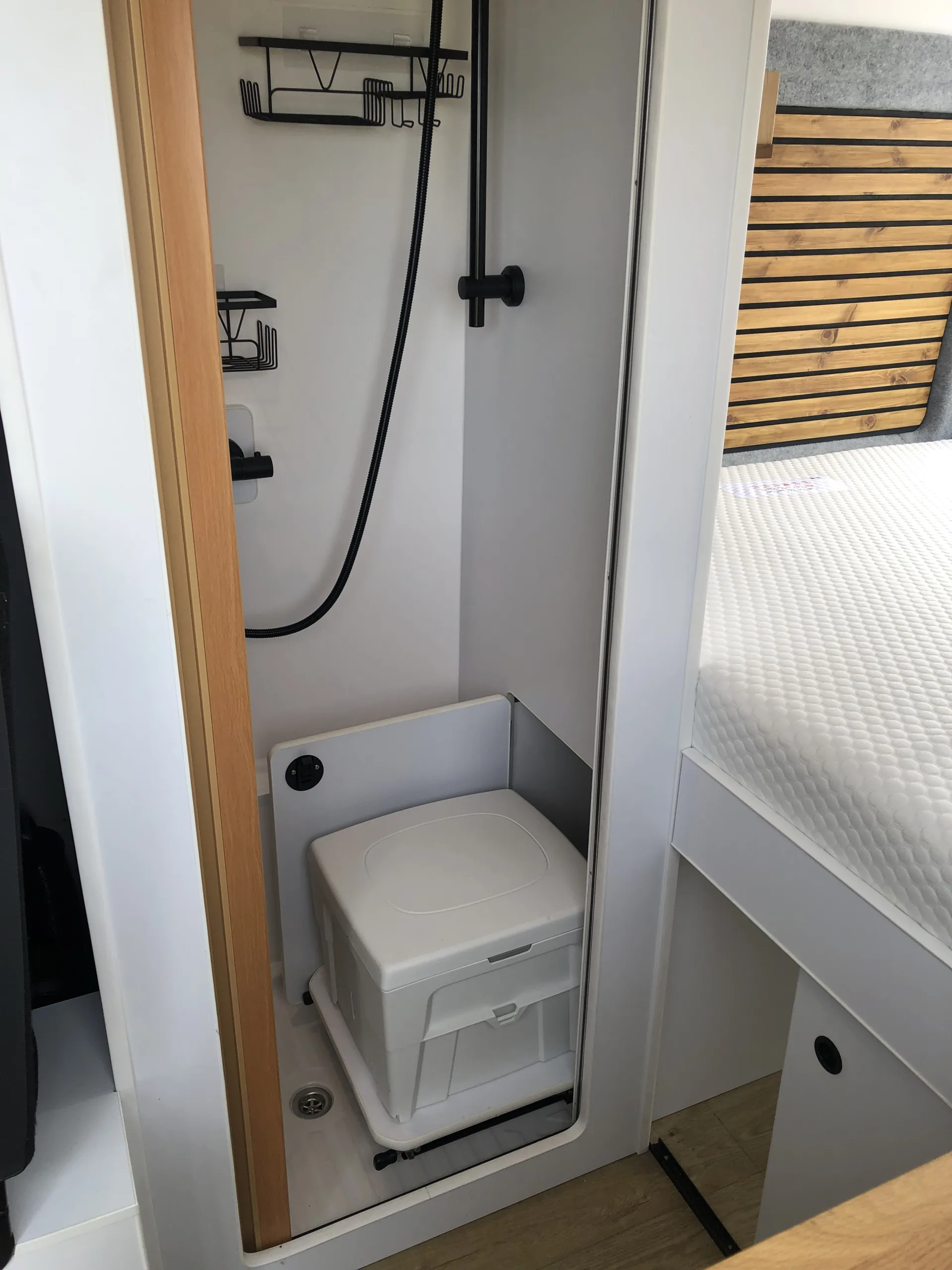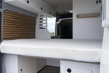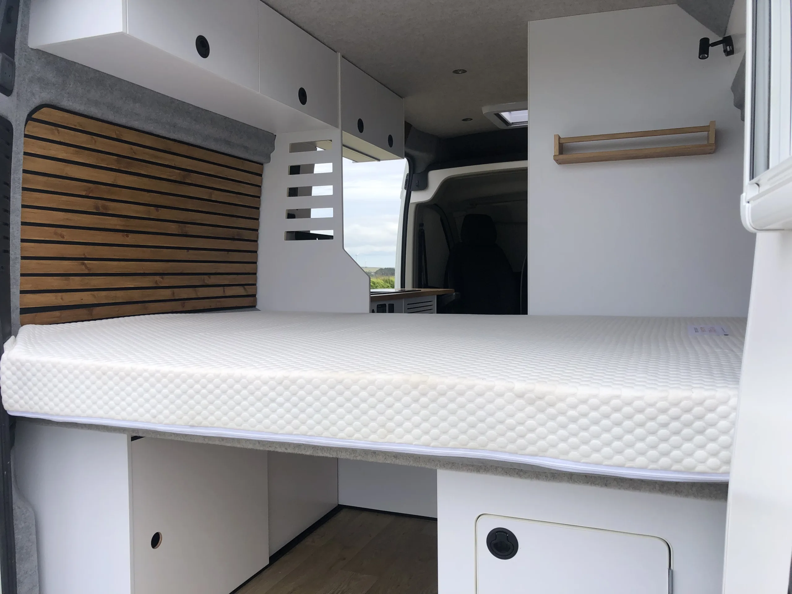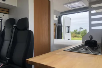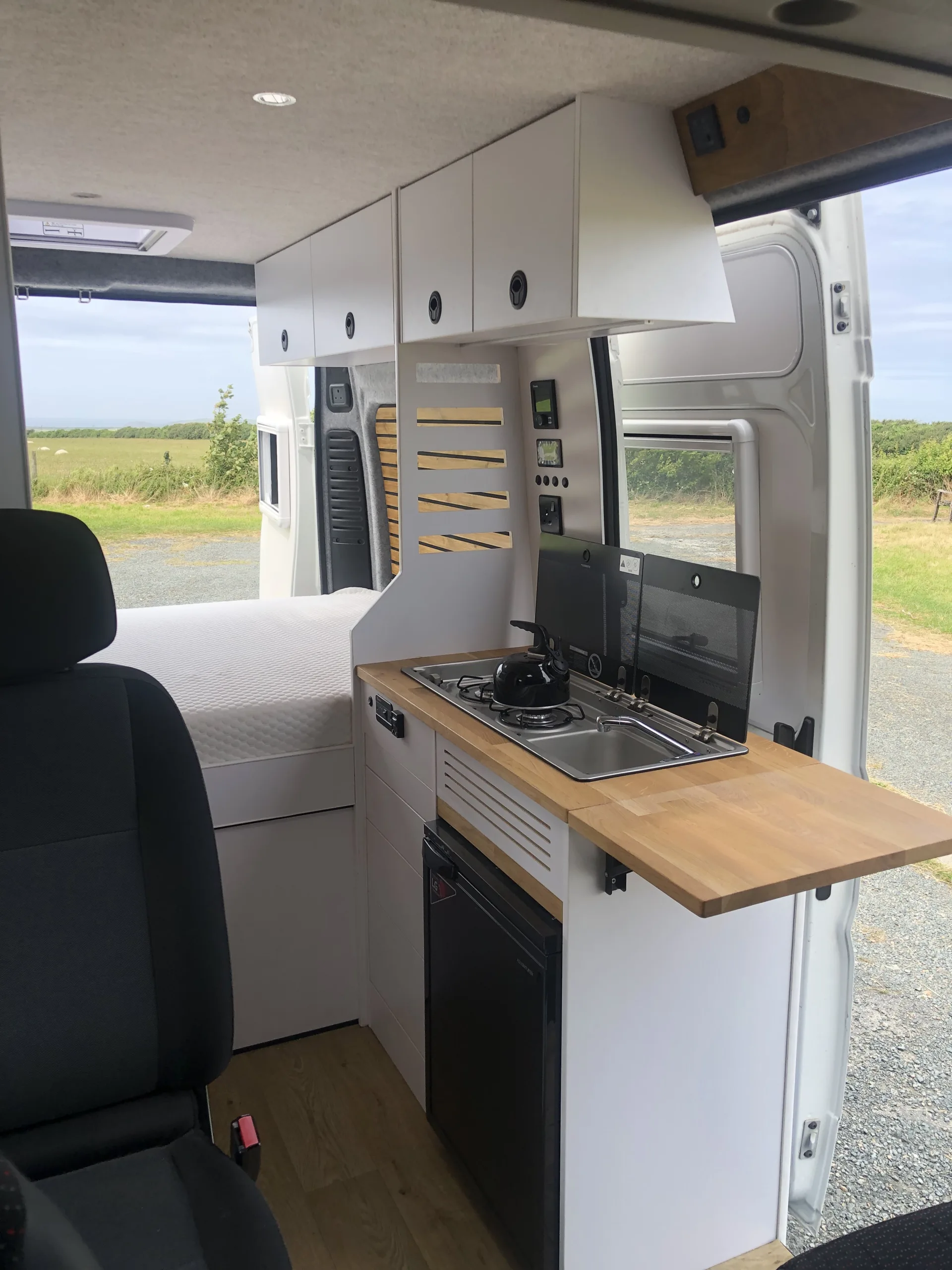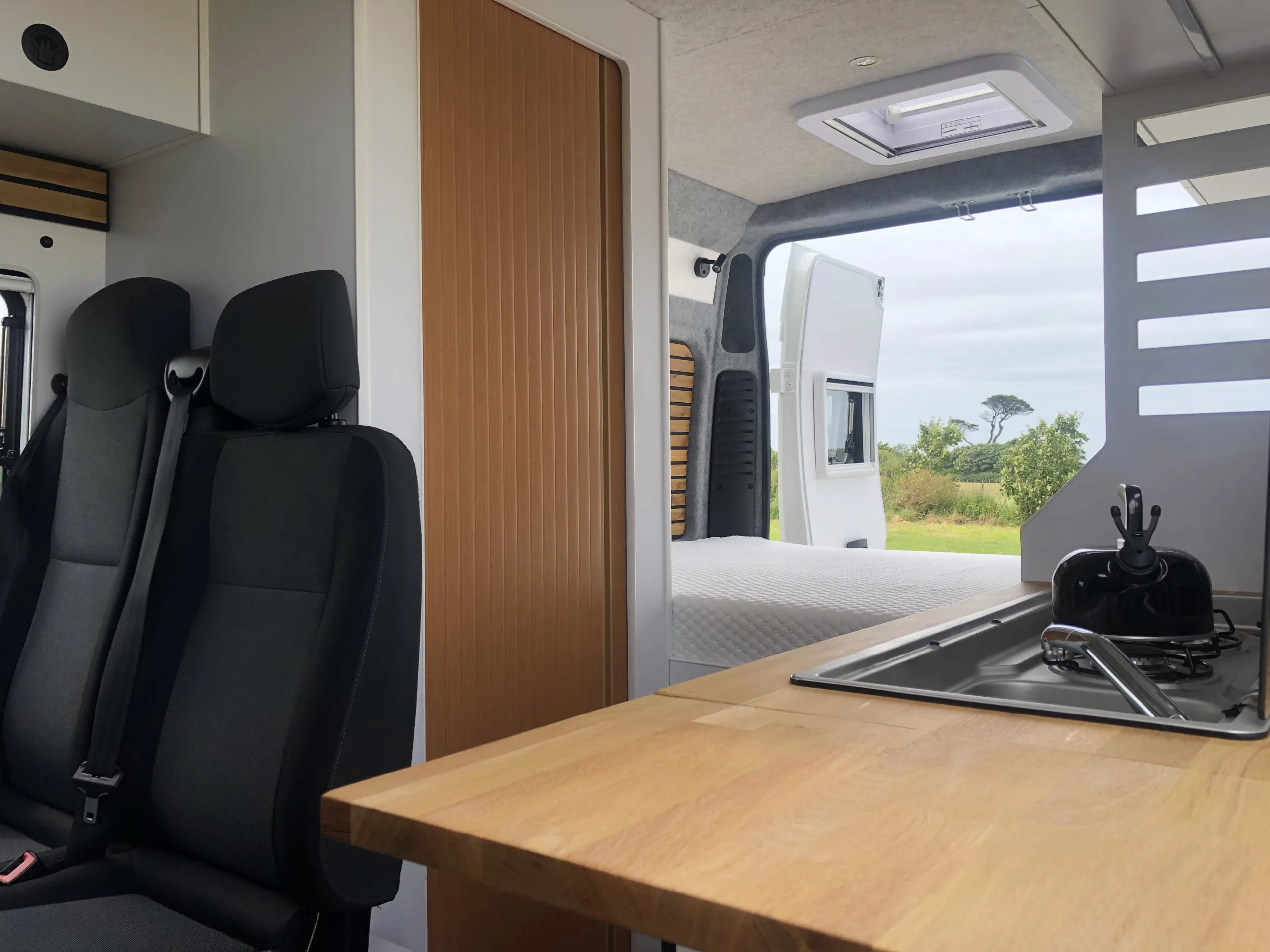 Step inside and you’re welcomed by a bright, calming space, finished in white camper-grade ply and oak accents. The layout is designed to feel open yet functional, perfect for couples, solo travellers, or anyone craving a peaceful escape on wheels.