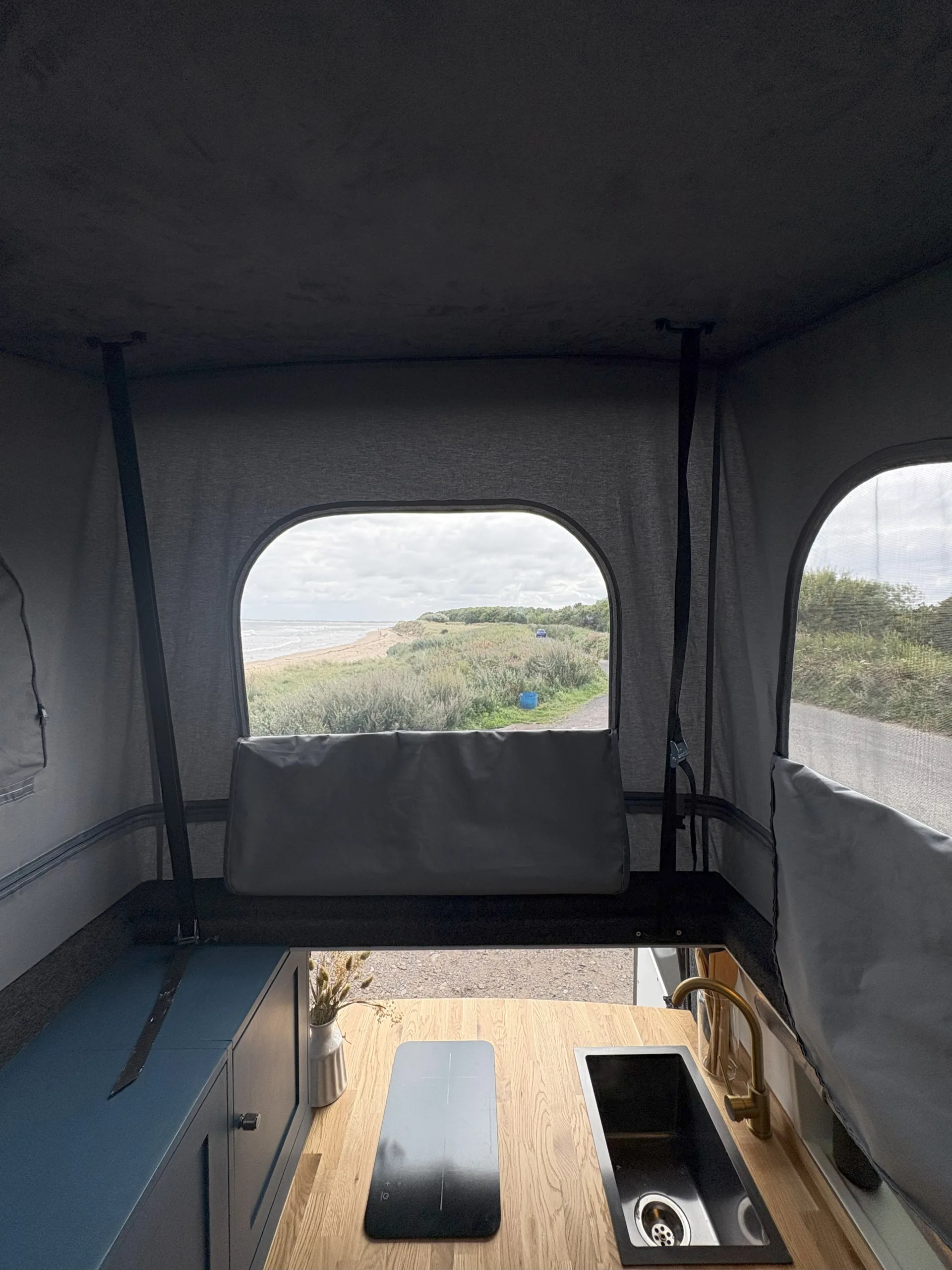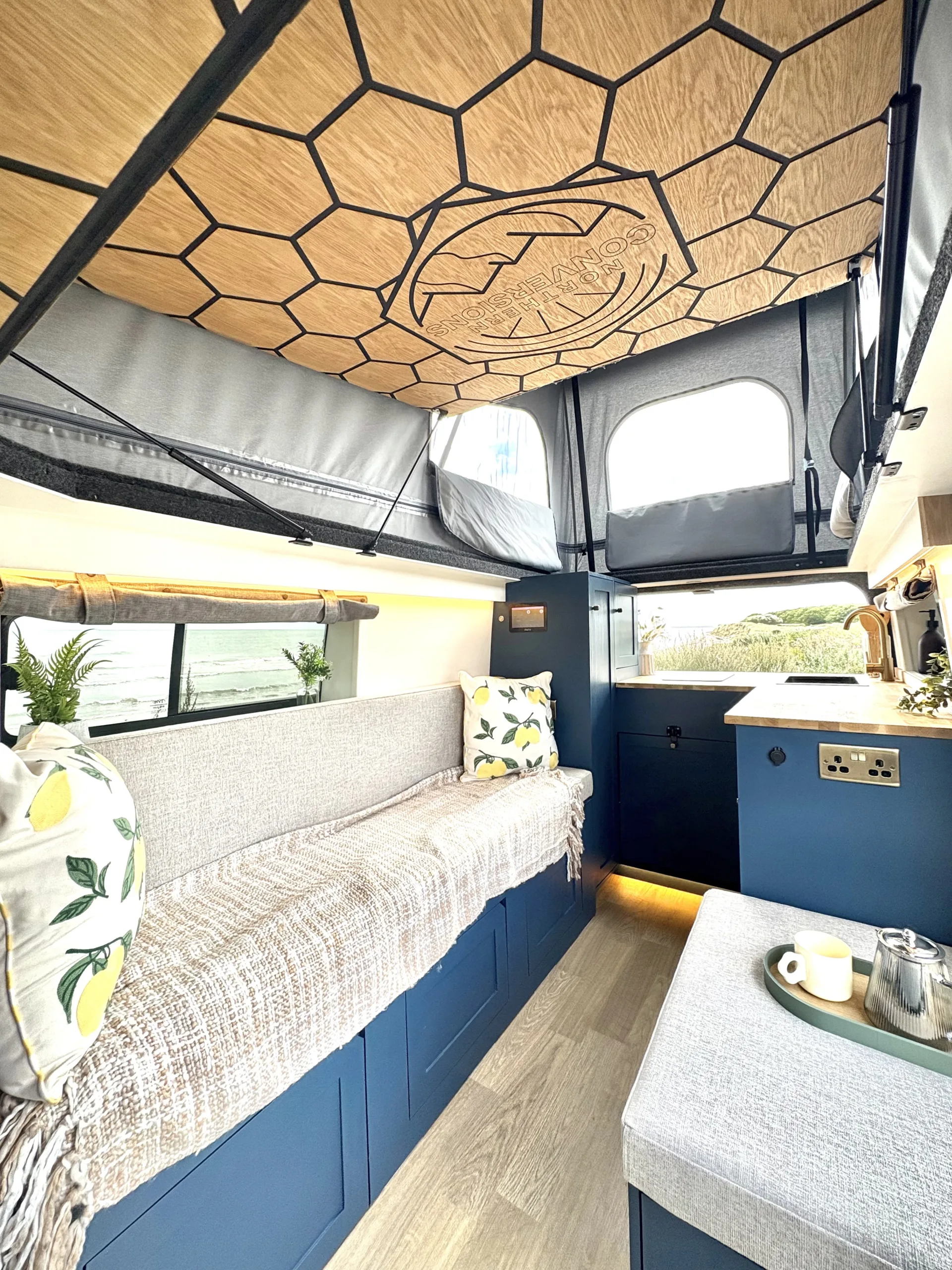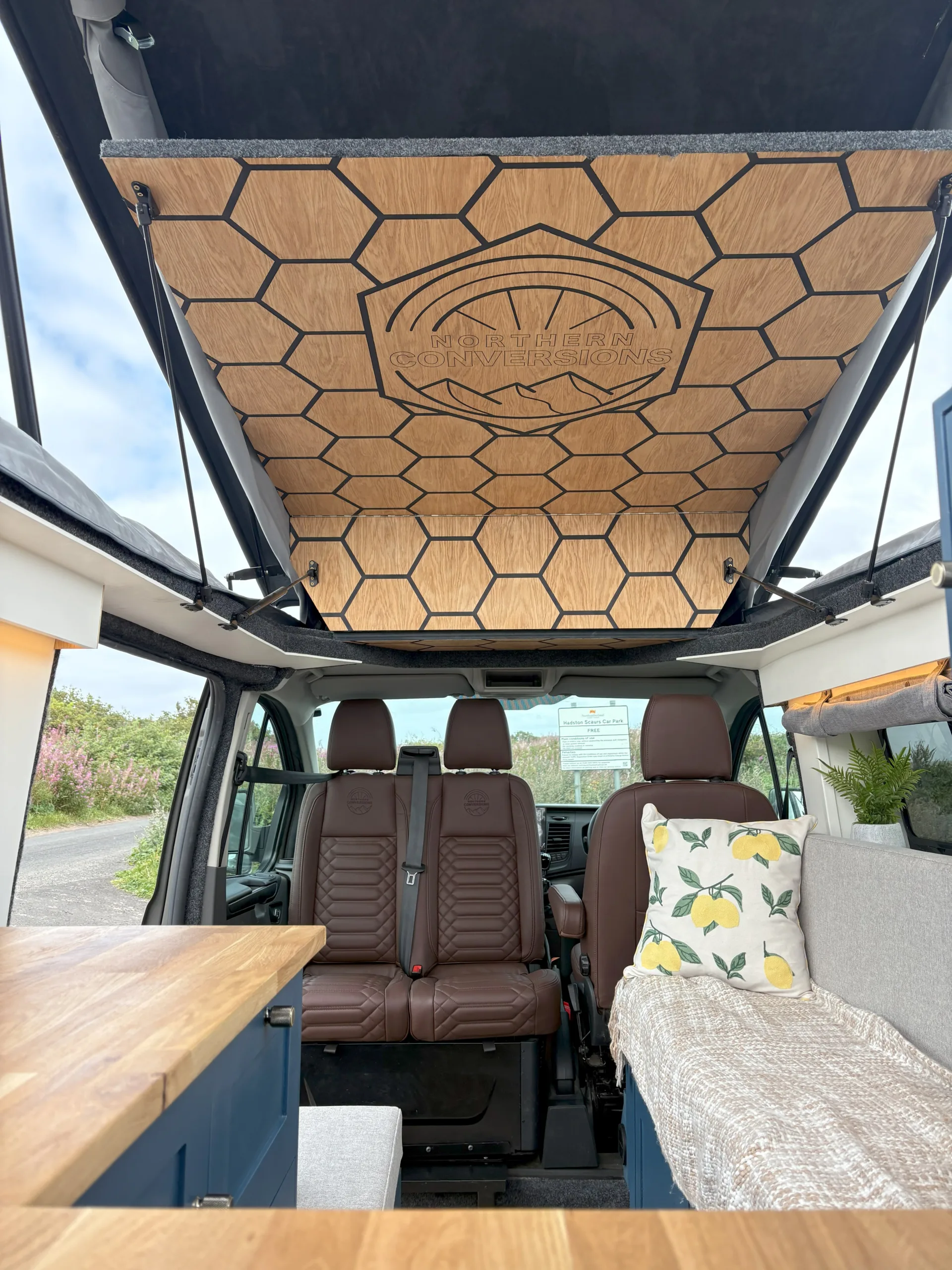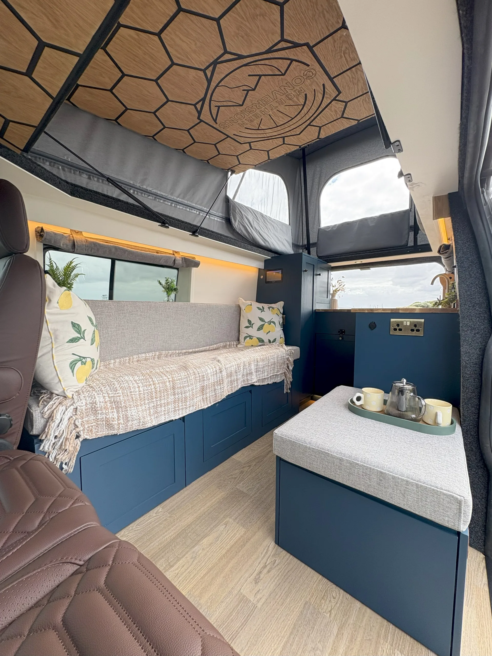 The conversion includes a pop top roof with an elevating bed (which allows additional room for sleeping). This is a full “scenic” canvas so can be unzipped to give the ultimate open-plan experience! The bi-folding pop-top bed features a stunning honeycomb-patterned design — both stylish and practical. Its clever folding mechanism creates extra headroom when standing, making the space feel more open and comfortable.