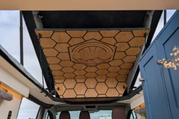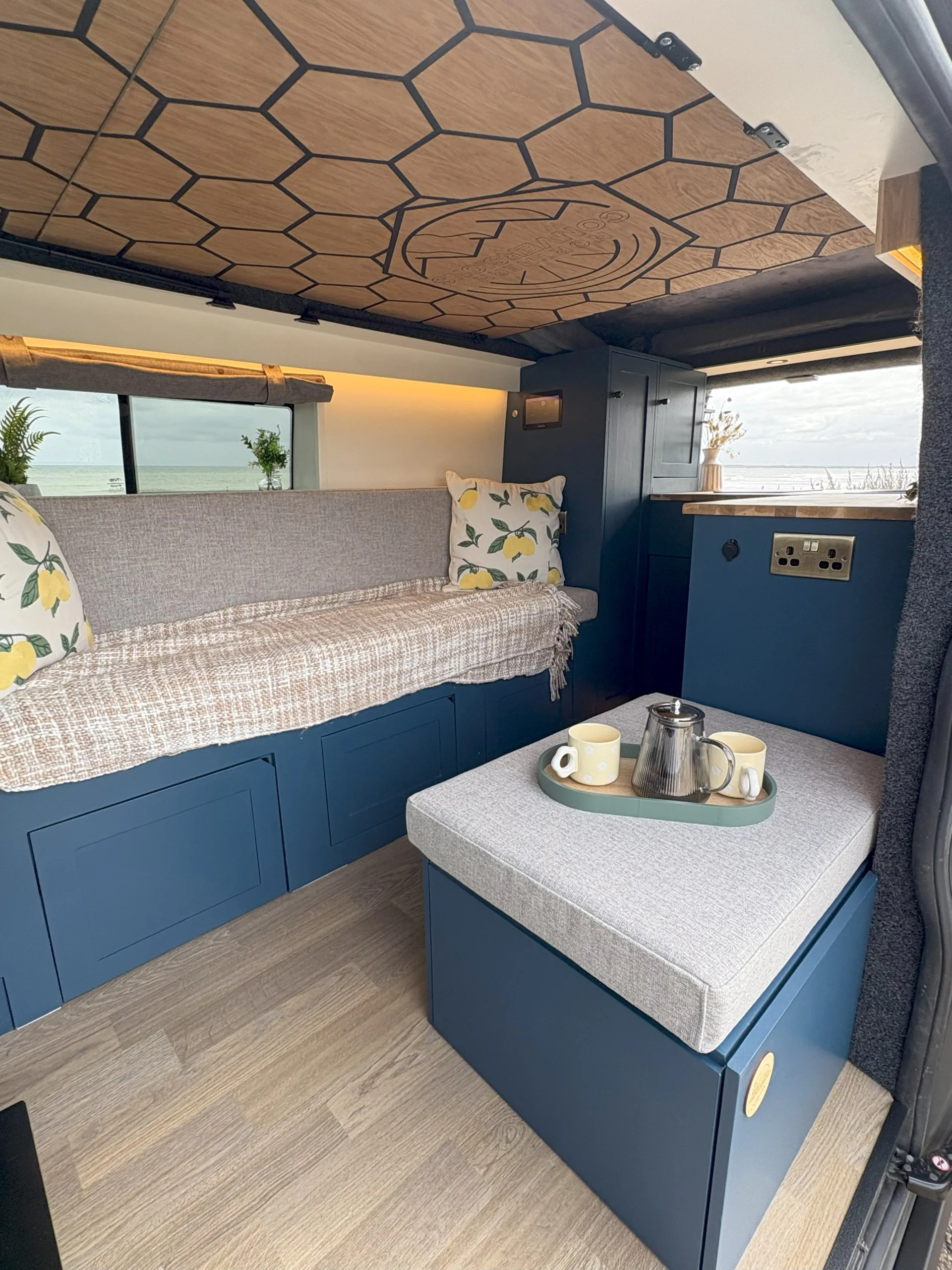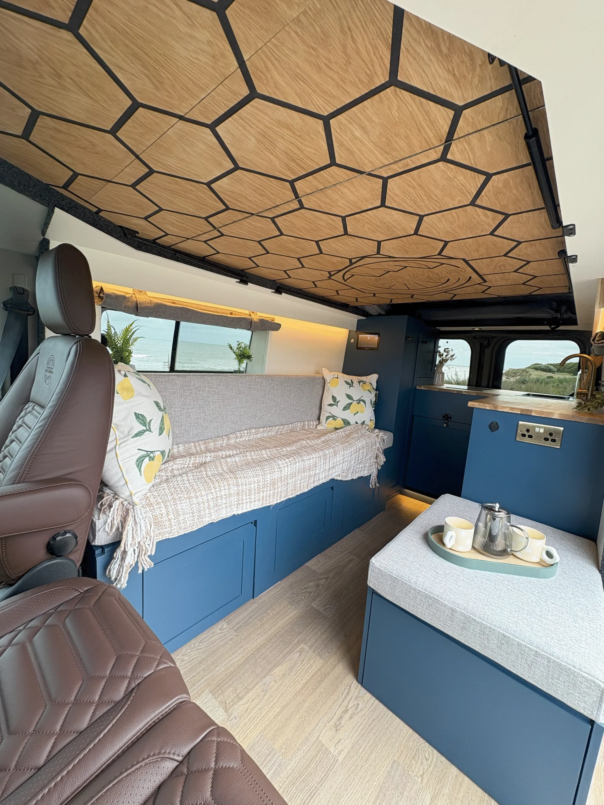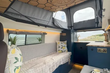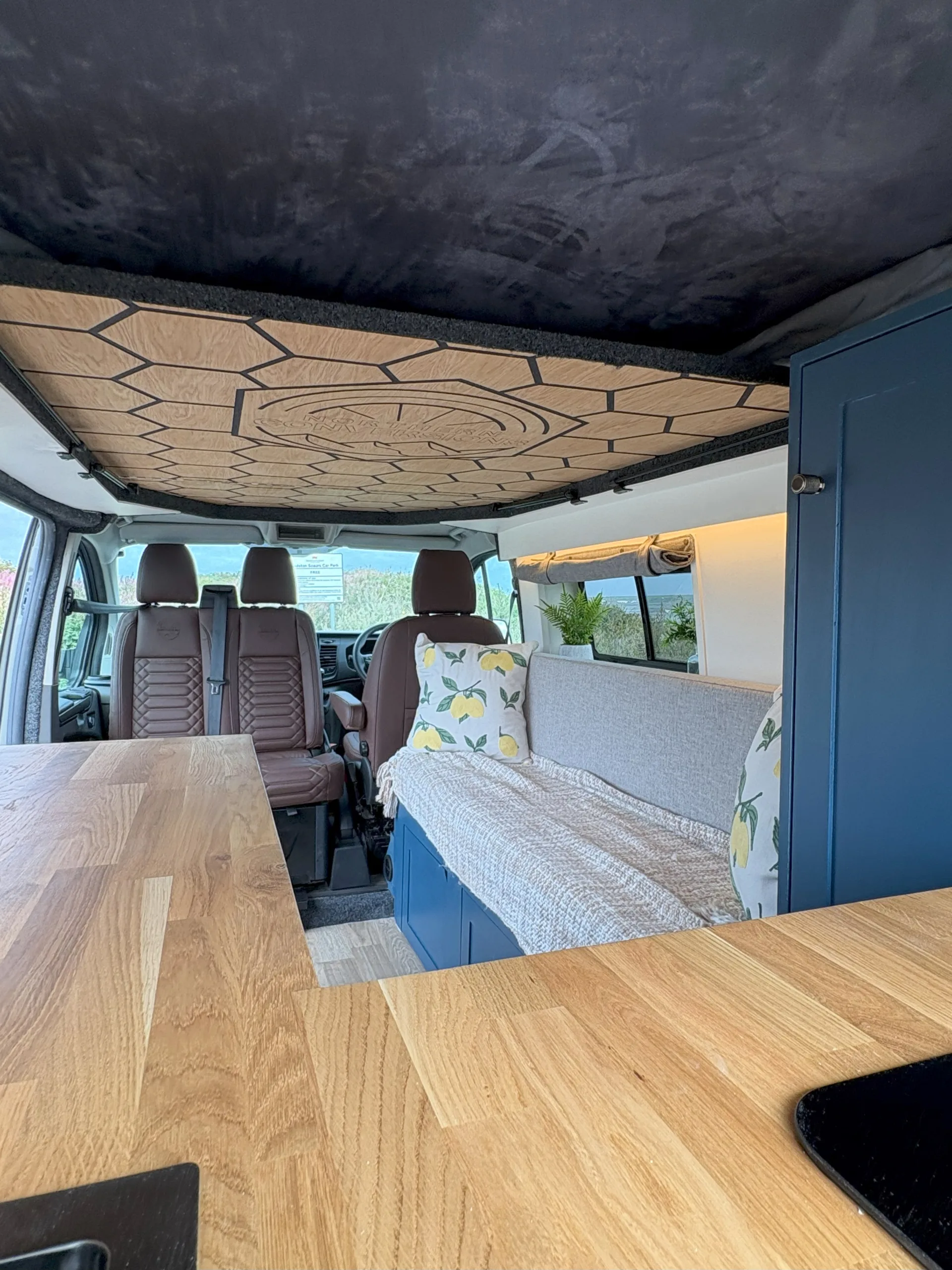 The conversion includes a pop top roof with an elevating bed (which allows additional room for sleeping). This is a full “scenic” canvas so can be unzipped to give the ultimate open-plan experience! The bi-folding pop-top bed features a stunning honeycomb-patterned design — both stylish and practical. Its clever folding mechanism creates extra headroom when standing, making the space feel more open and comfortable.