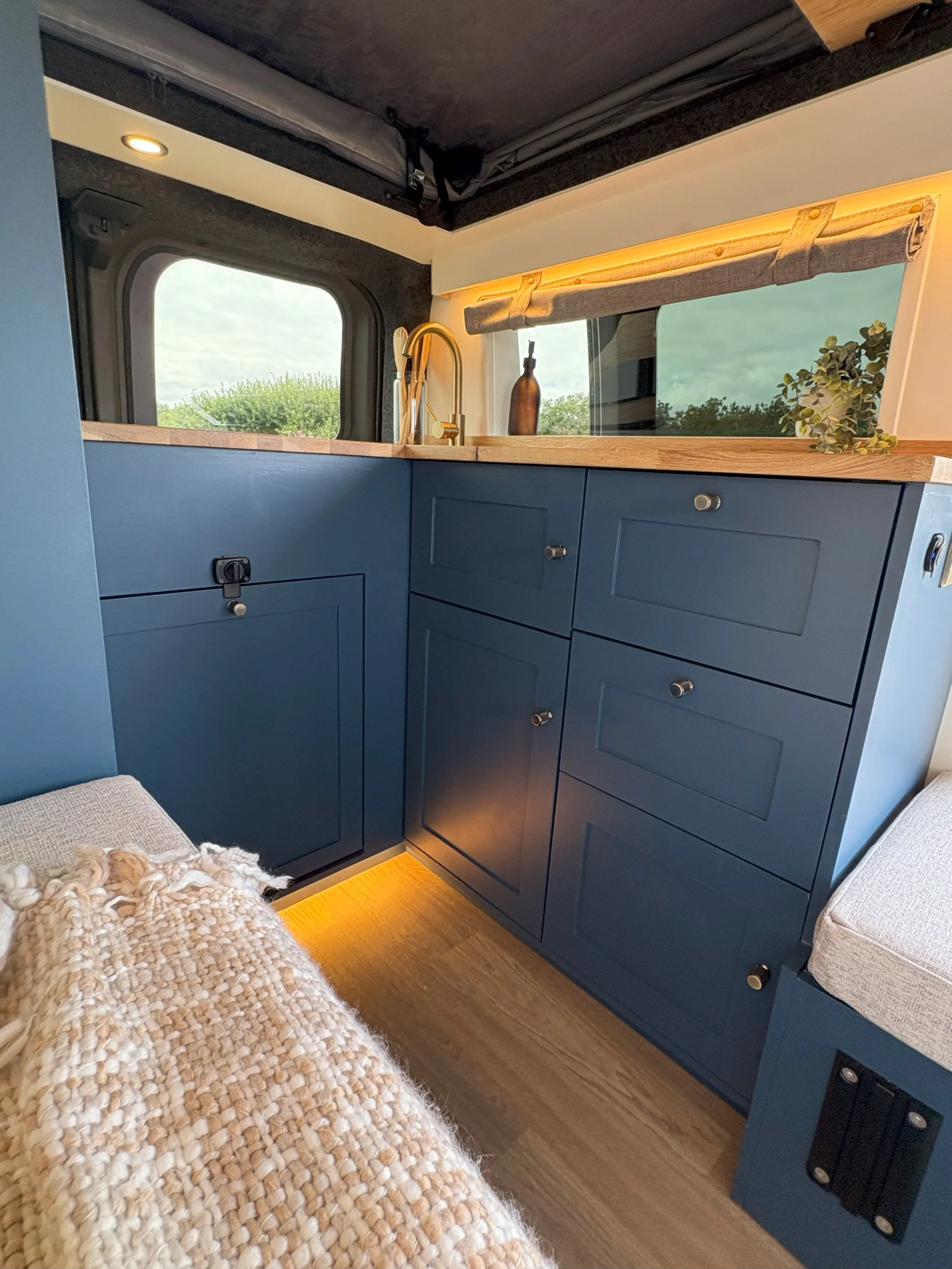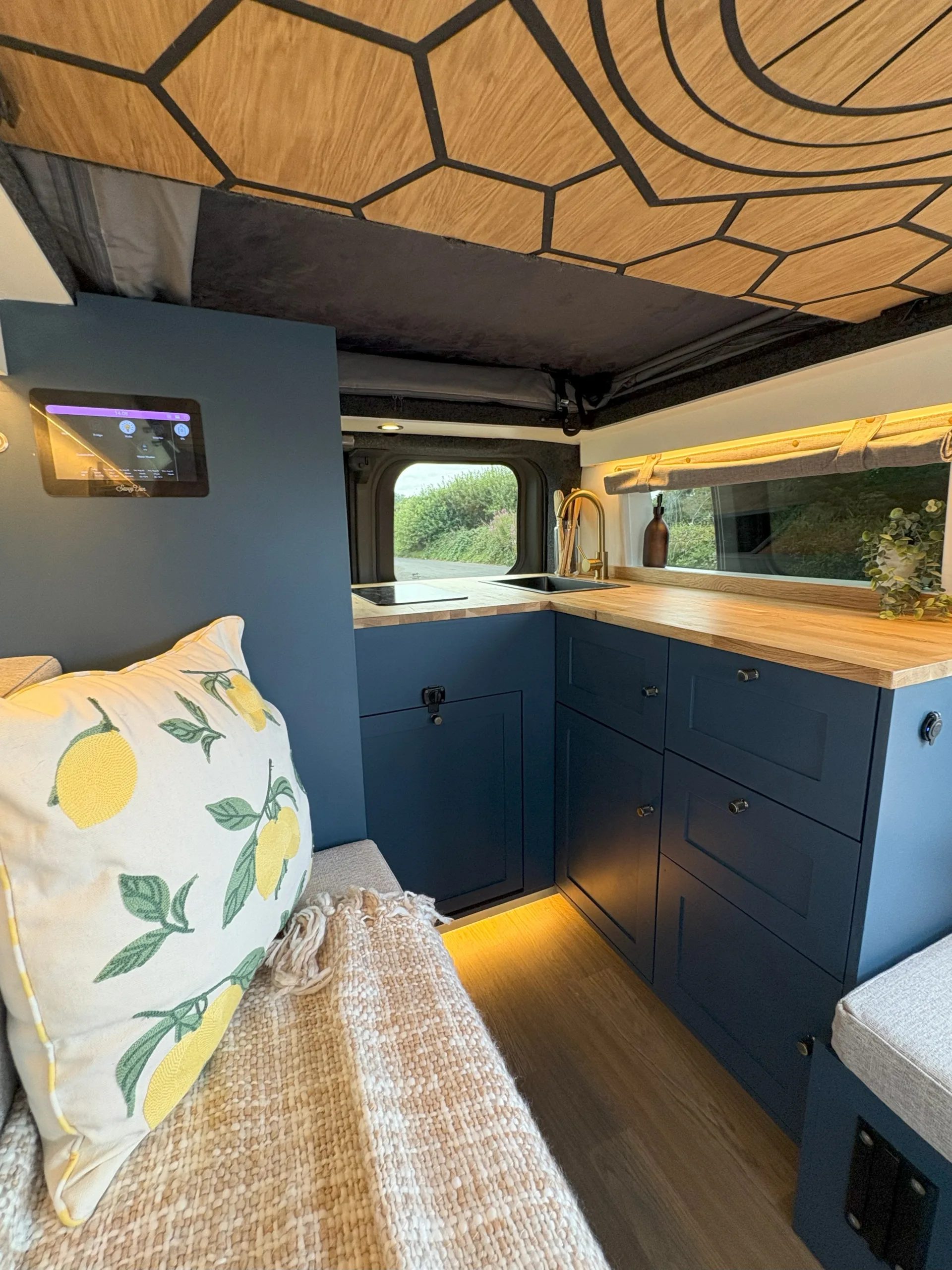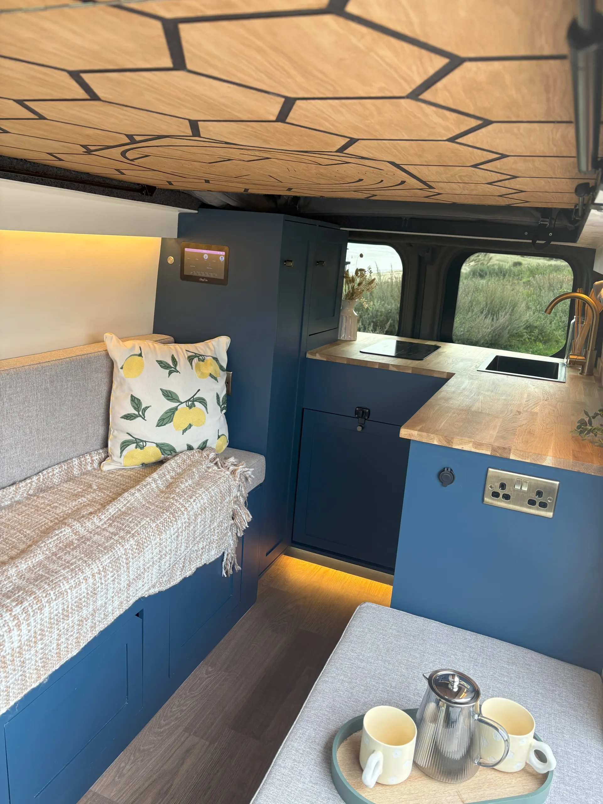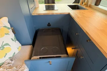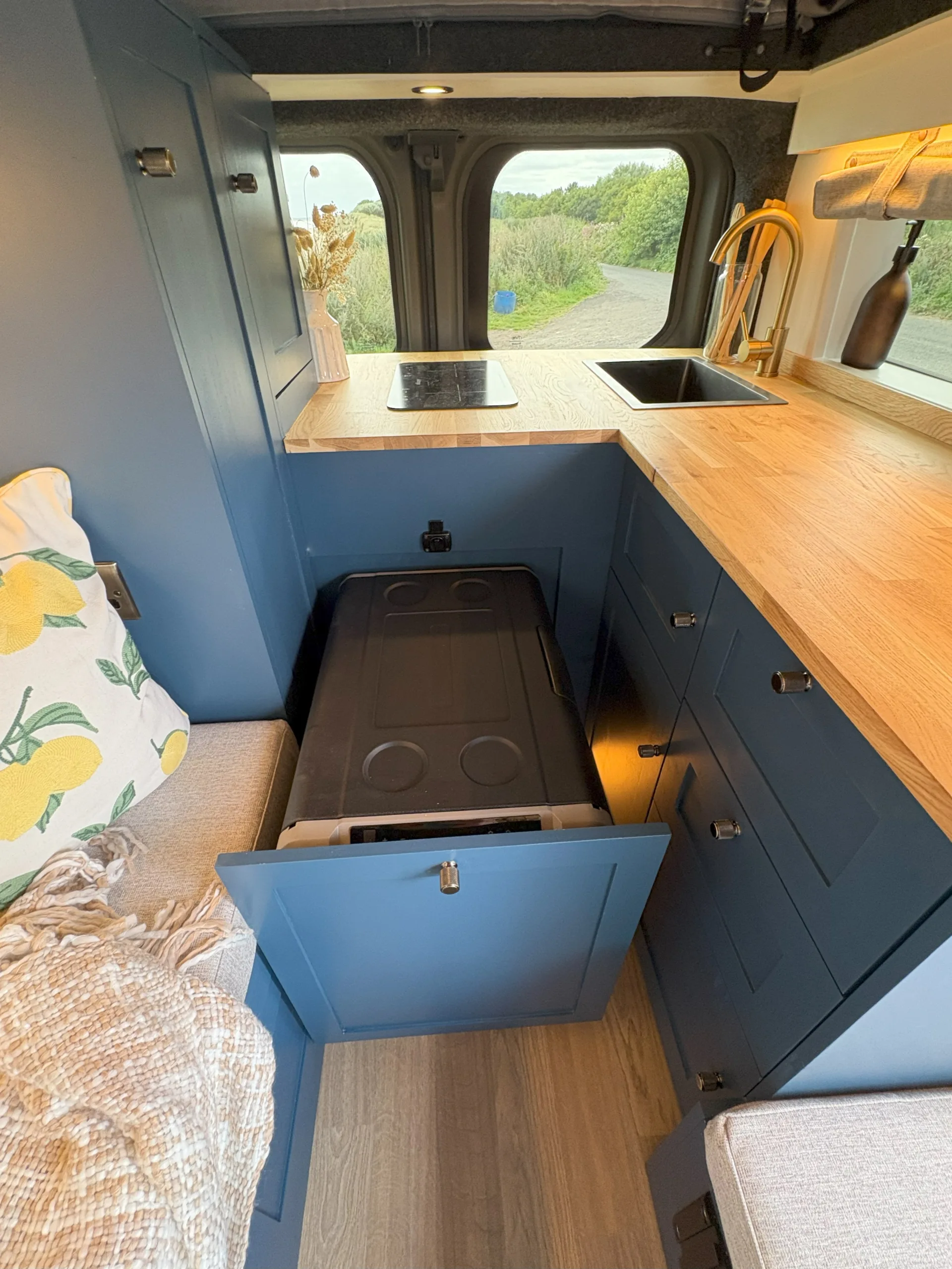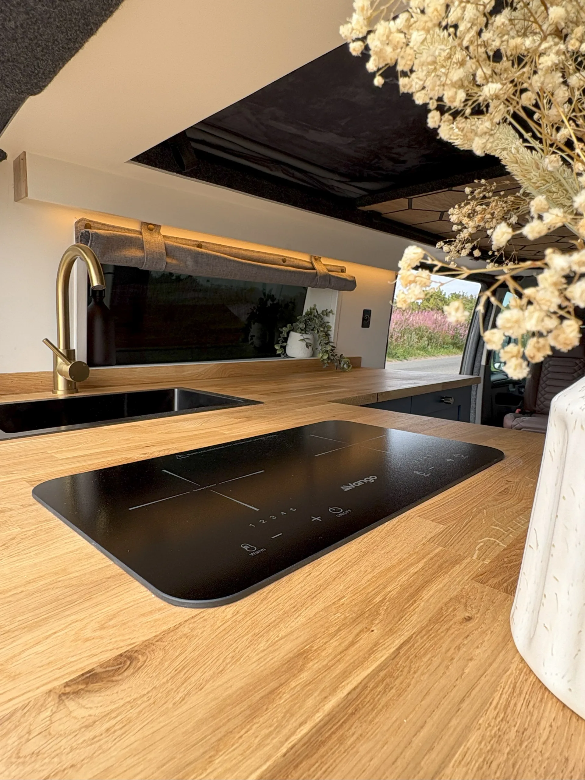 This campervan has been built completely gas-free, with no gas onboard at all. That means less fuss, less hassle, and a much safer, modern system powered entirely by a reliable off-grid electrical setup and induction hob.