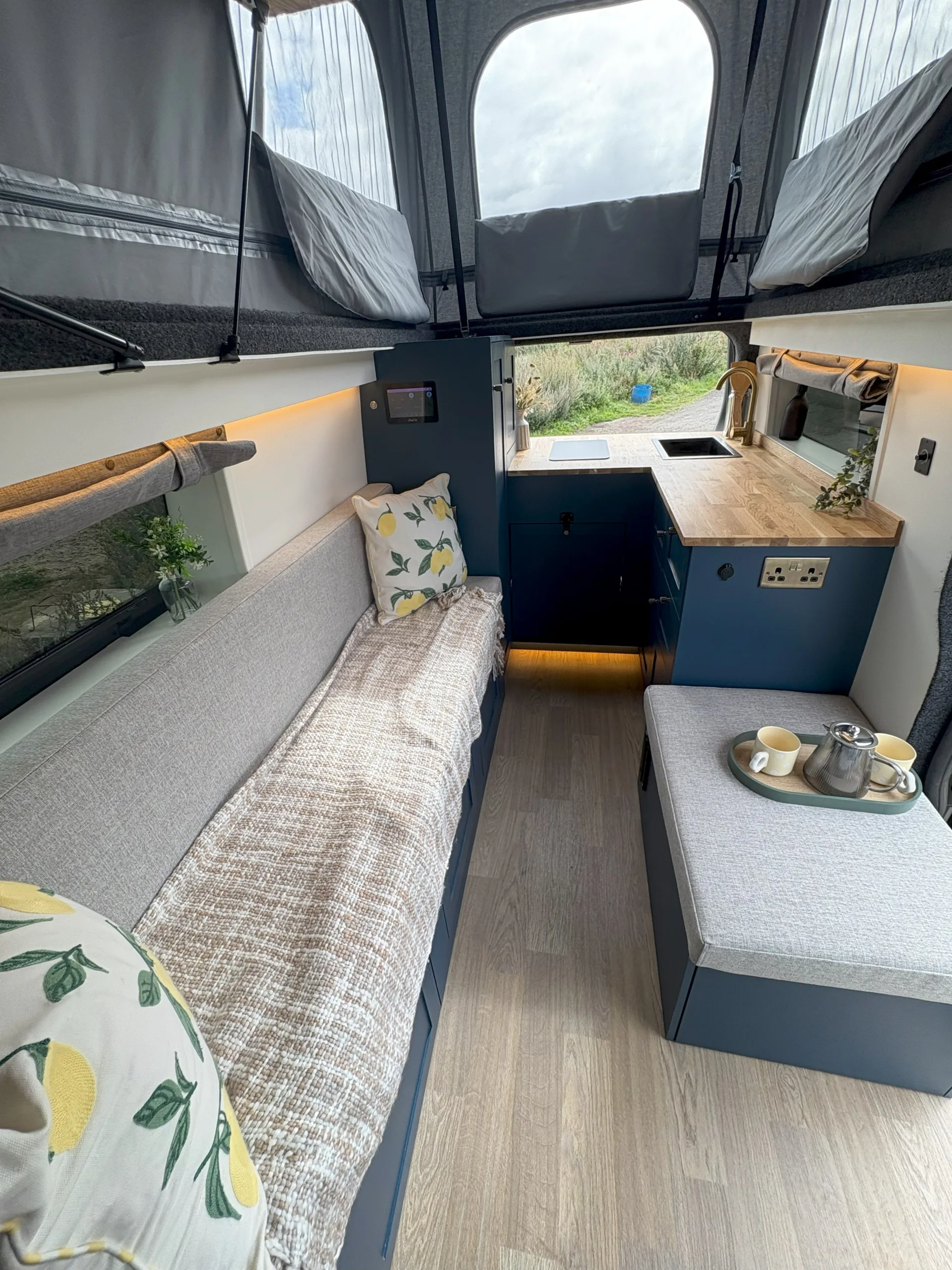 Pop-top roof with bi-folding bed – sleep 4 comfortably