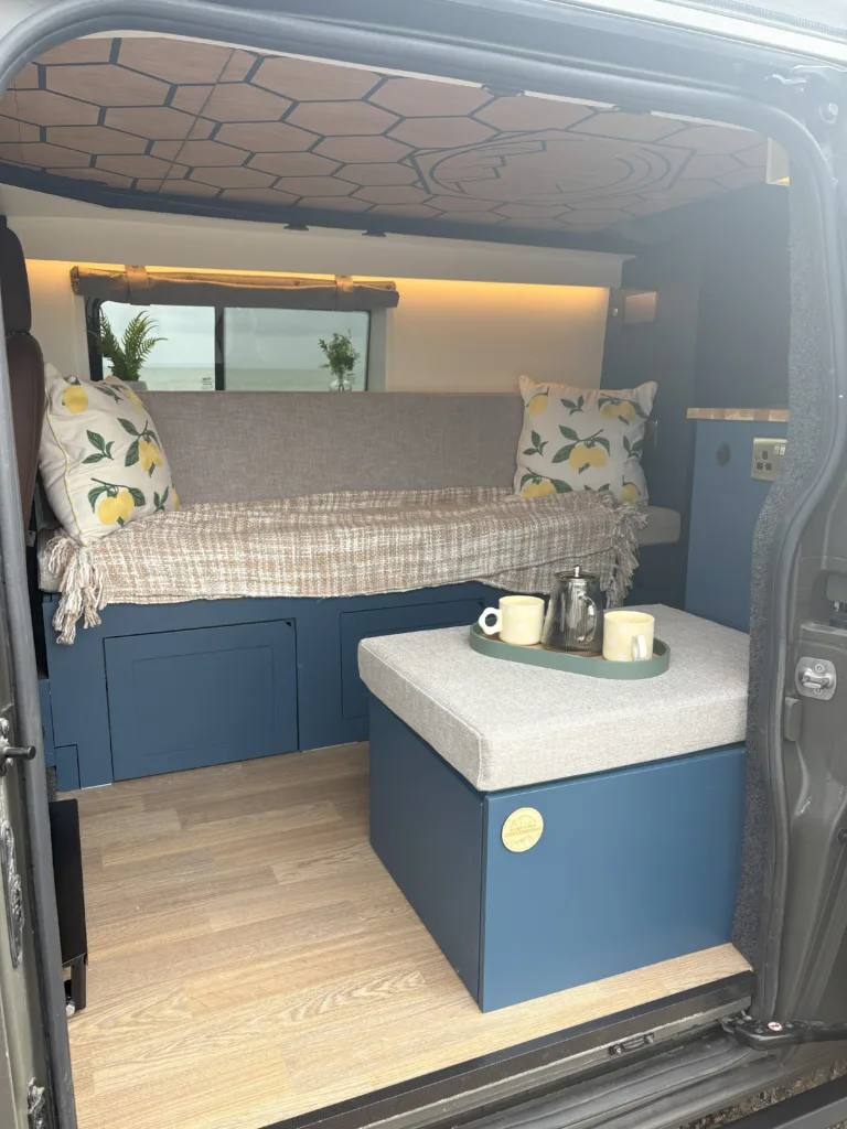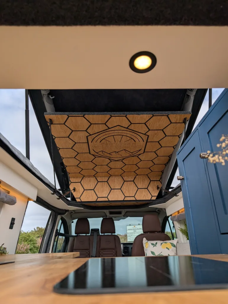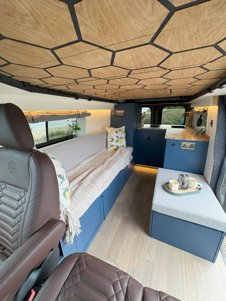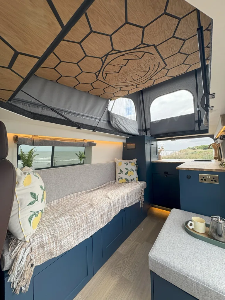 The conversion includes a pop top roof with an elevating bed (which allows additional room for sleeping). This is a full “scenic” canvas so can be unzipped to give the ultimate open-plan experience! The bi-folding pop-top bed features a stunning honeycomb-patterned design — both stylish and practical. Its clever folding mechanism creates extra headroom when standing, making the space feel more open and comfortable.
