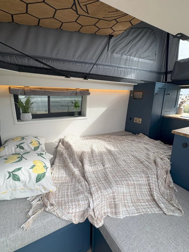 Pop-top roof with bi-folding bed – sleep 4 comfortably