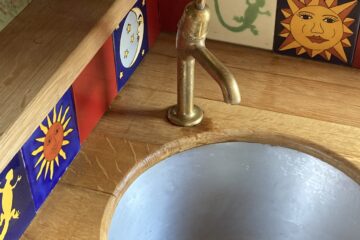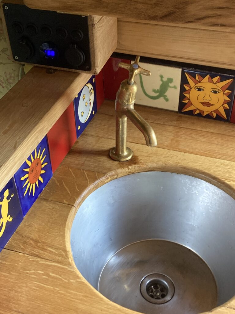 – Deep round sink with quirky upcycled brass tap. Wooden sink cover doubles up for food prep area
