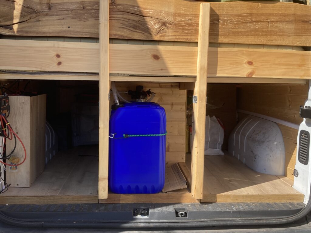 The barn doors open to reveal a huge amount of storage under the bed helpfully separated to prevent items sliding around. 2 x 25 litre fresh water tanks and the water pump are located here.