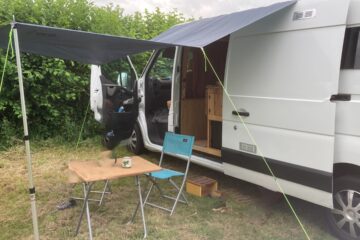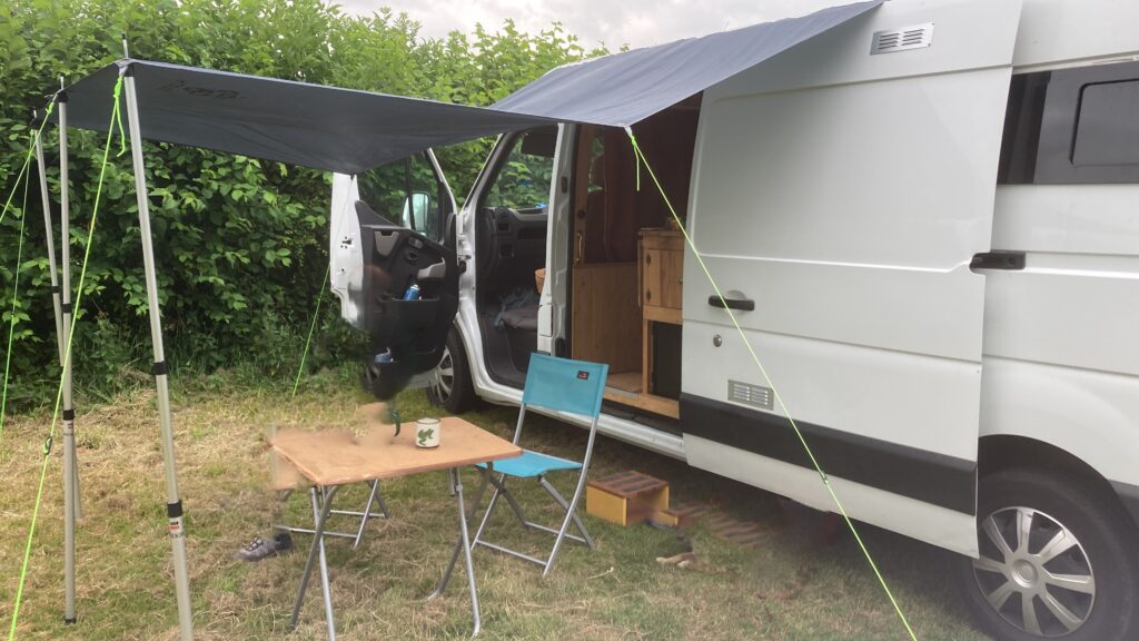 Extras include a basic 12v shower that can be used at the rear of the van and an awning which slides along the rail running along the side of the van.