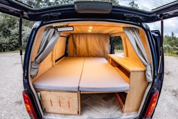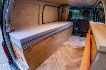 Flip out small double bed (170×100) – I’m 5’3 so there is plenty of room for me, but even if you’re taller there’s loads of room for feet to hang off the end when the seats are forward. Sleeps one very comfortably or two if you’re fine being cosy!