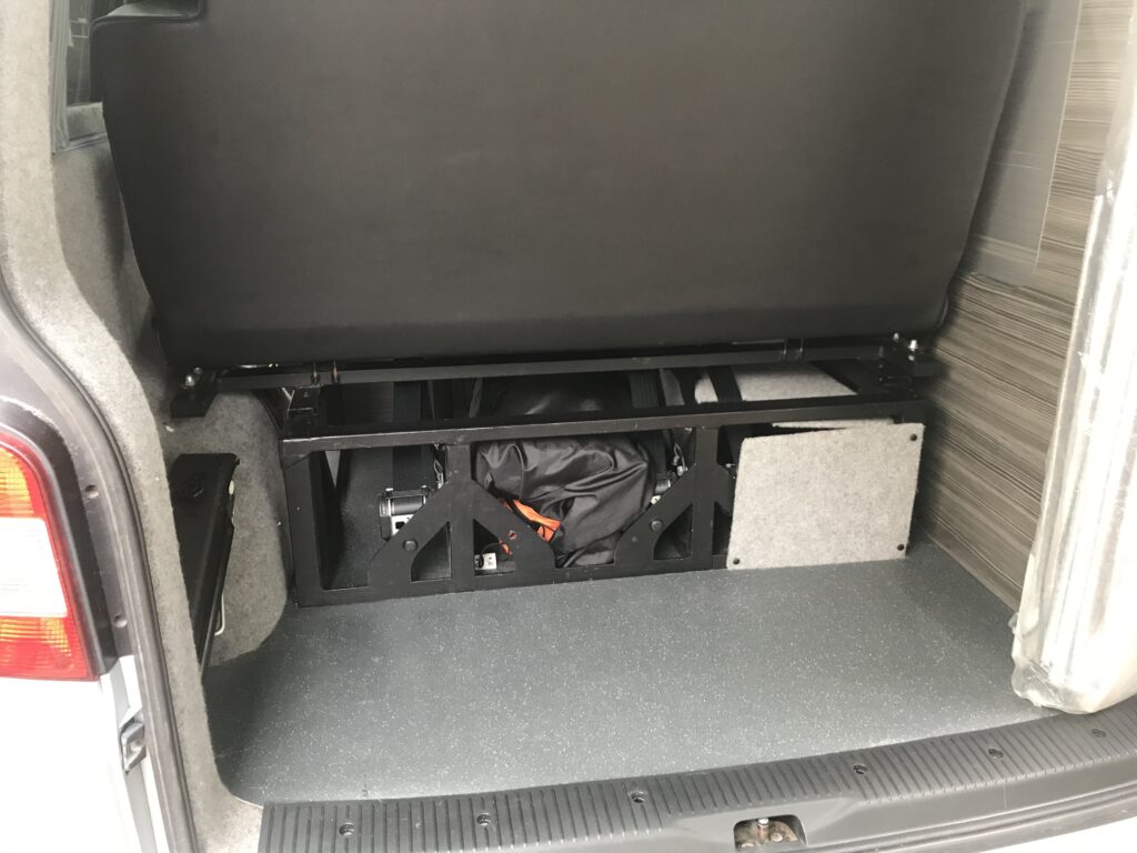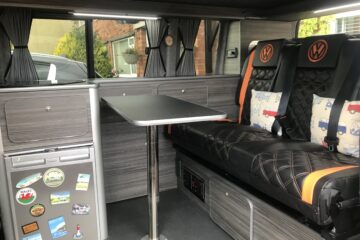 The bike rack is genuine VW one for up to 4 bikes. The CampervanParts roof rails have been professionally glued, screwed and sealed onto the pop-top roof and hold aero bars. While the pop-top roof itself is not officially rated for any load, I have used these roof bars for carrying three surfboards on long trips and it’s been totally solid.