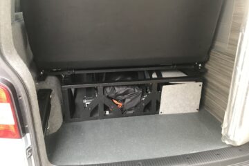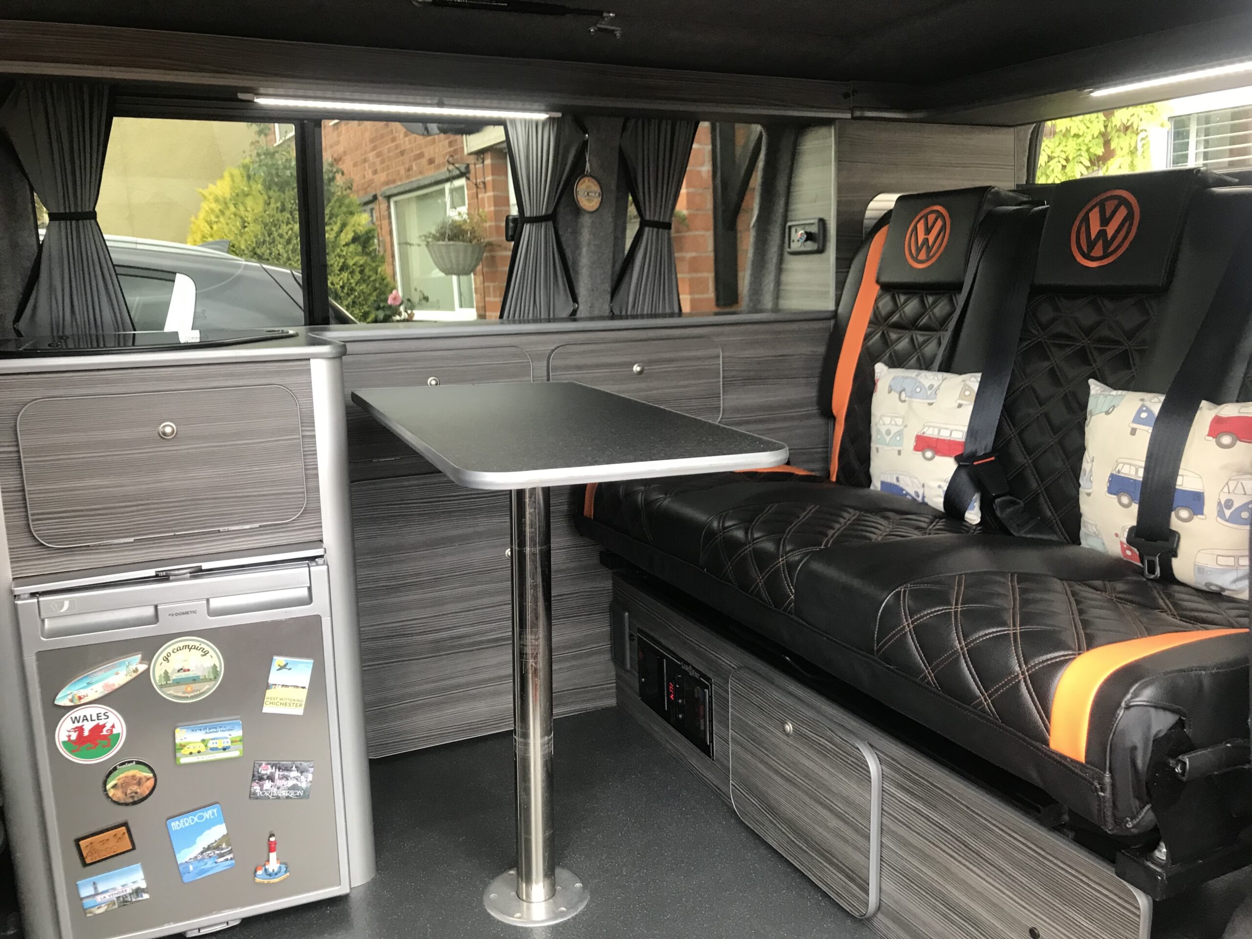 There is a 240V hook up on the side of the van and internal 12V electrics. The (new) leisure battery charges from the engine or from the mains and holds enough power to run the fridge for a weekend without needing a boost. There are 3 x 240V 3-pin plugs as well as USB charging and 12V ports. The electrical control unit is fitted on a panel beneath the rear seats.