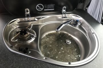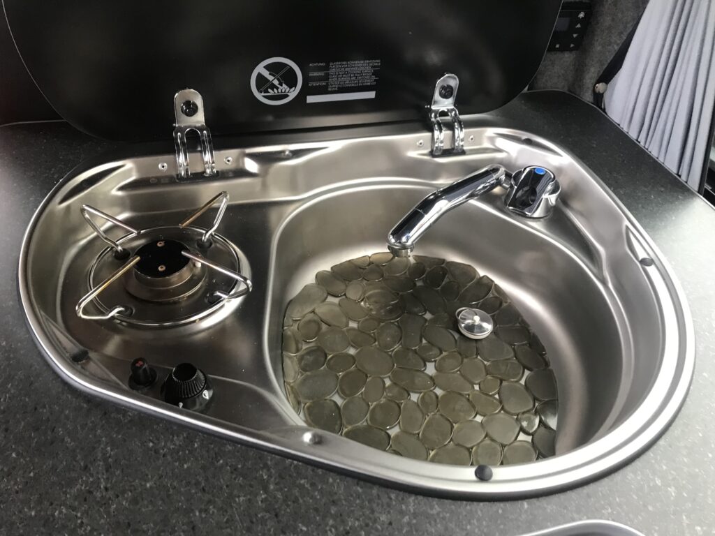 The twin front seats are on a swivel base and can be turned to face rear. A cleverly stashed table fits between the rows of seats to share food, drinks, games etc. when everyone’s in the van. There are LED lights in the kitchenette area, above the lower bed and in the pop-top. The pop-top has a grey water resistant canopy and a front window with a roll-up blind and ventilation mesh.