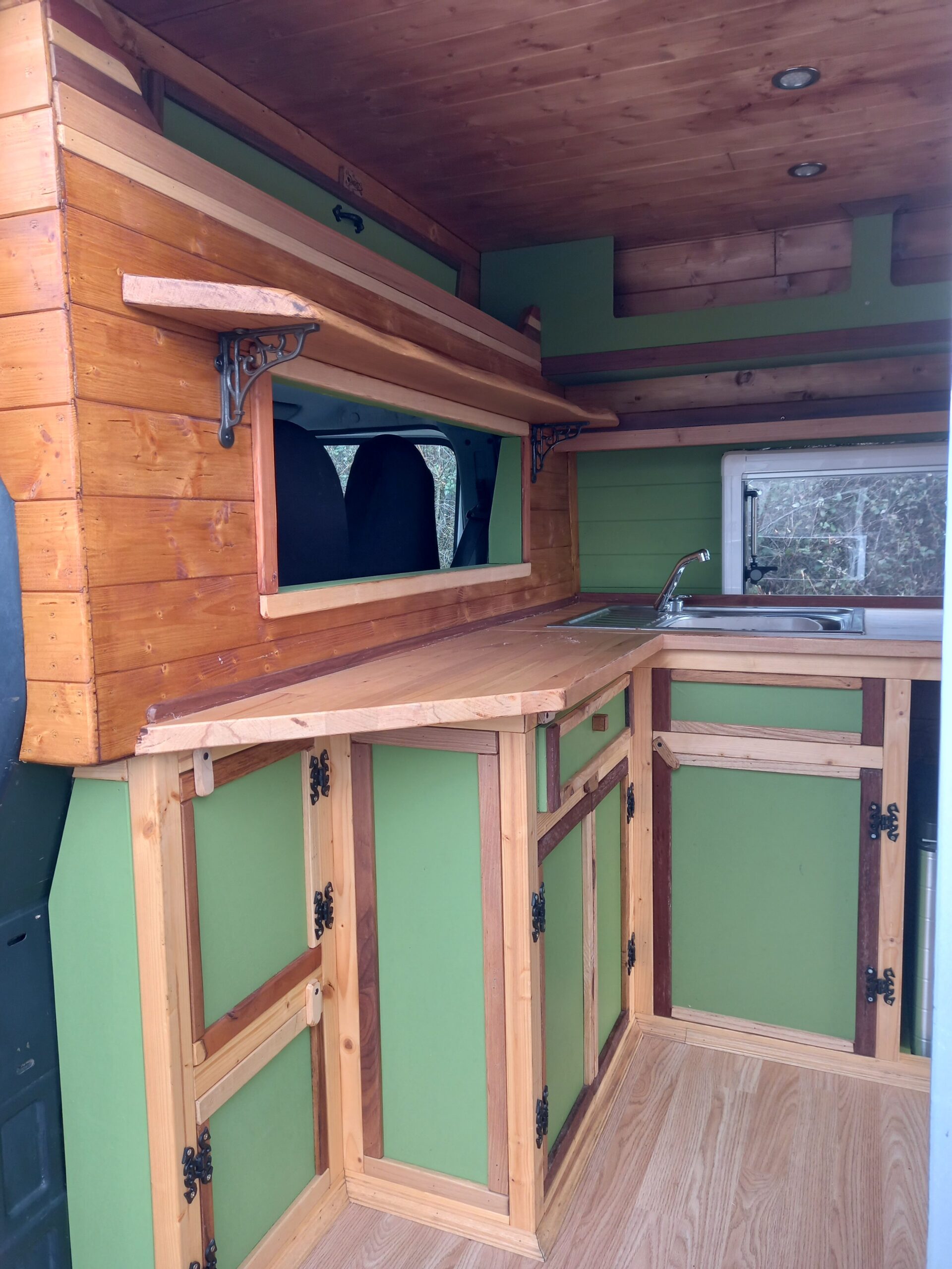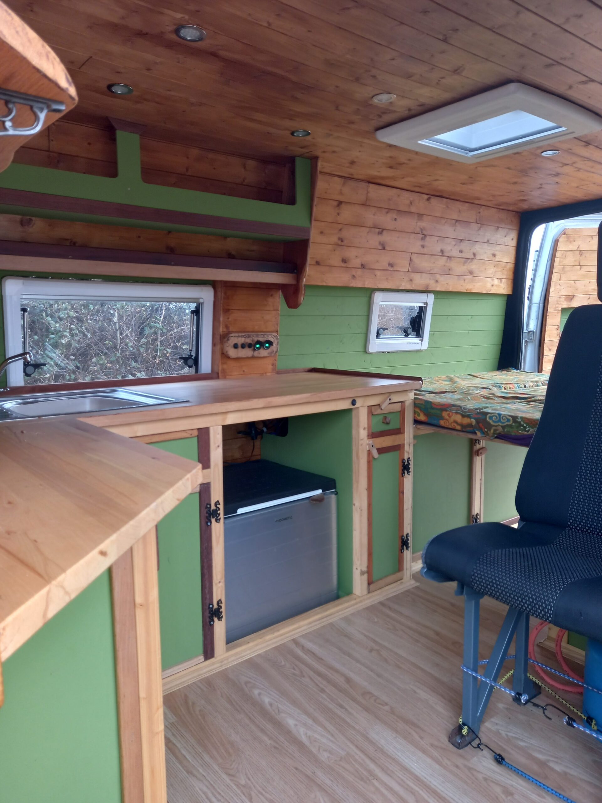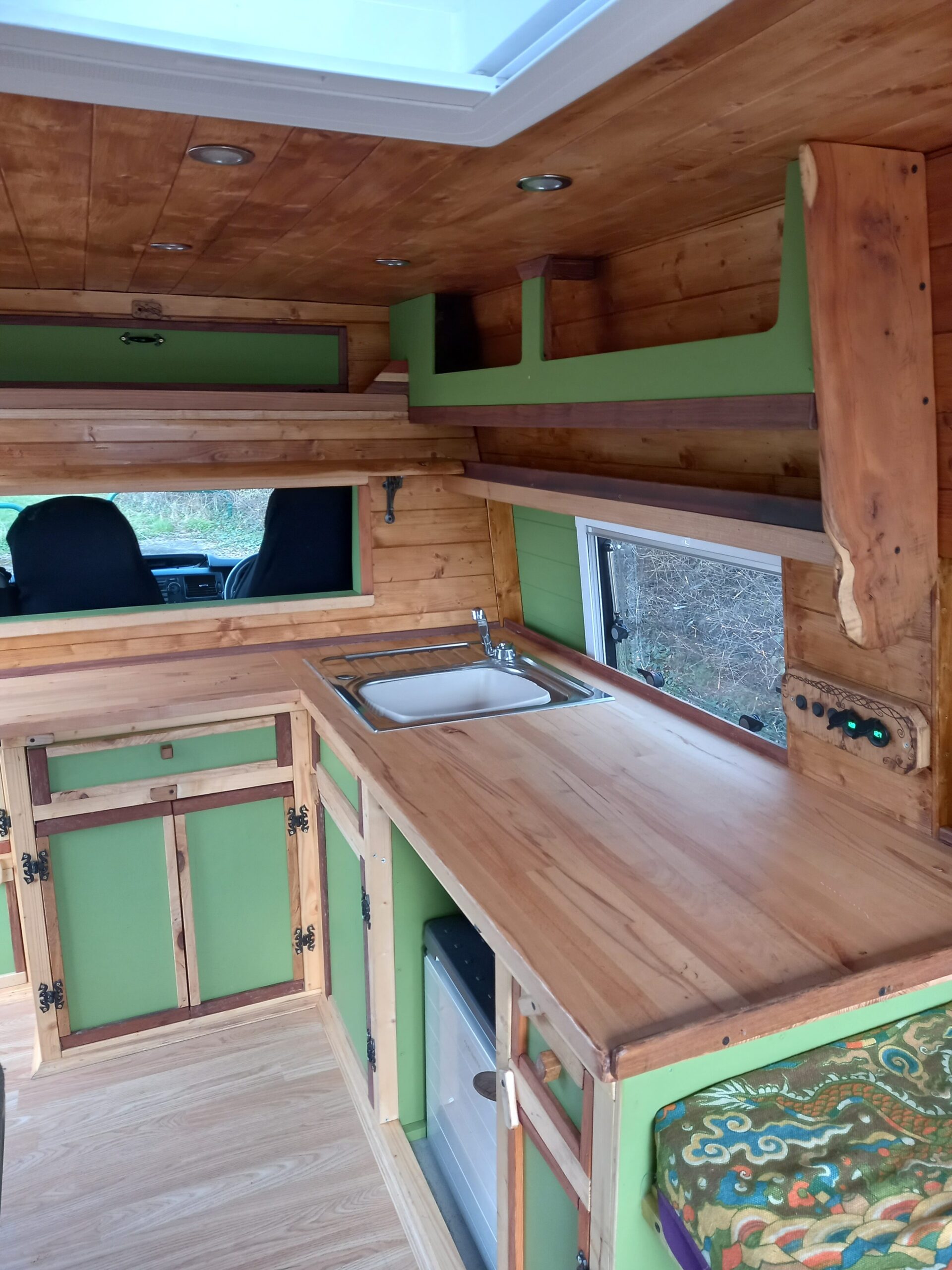 Made from beautiful wood and modern motorhome products, designed to be unique with effective use of space, With lots of storage and character. It has simple features inside but its got what you need for an off grid expedition.