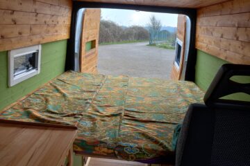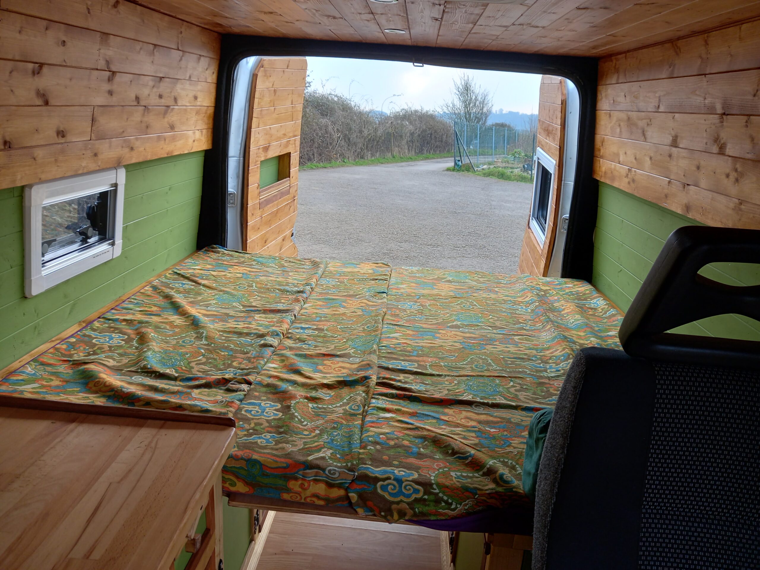 The double bed at the rear of the van folds away to create a lot of space and extra seating in the van, you can sleep a child under the bed on foam.