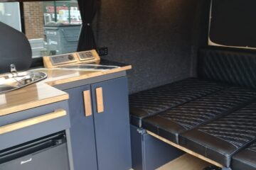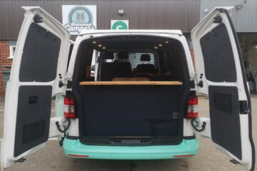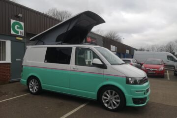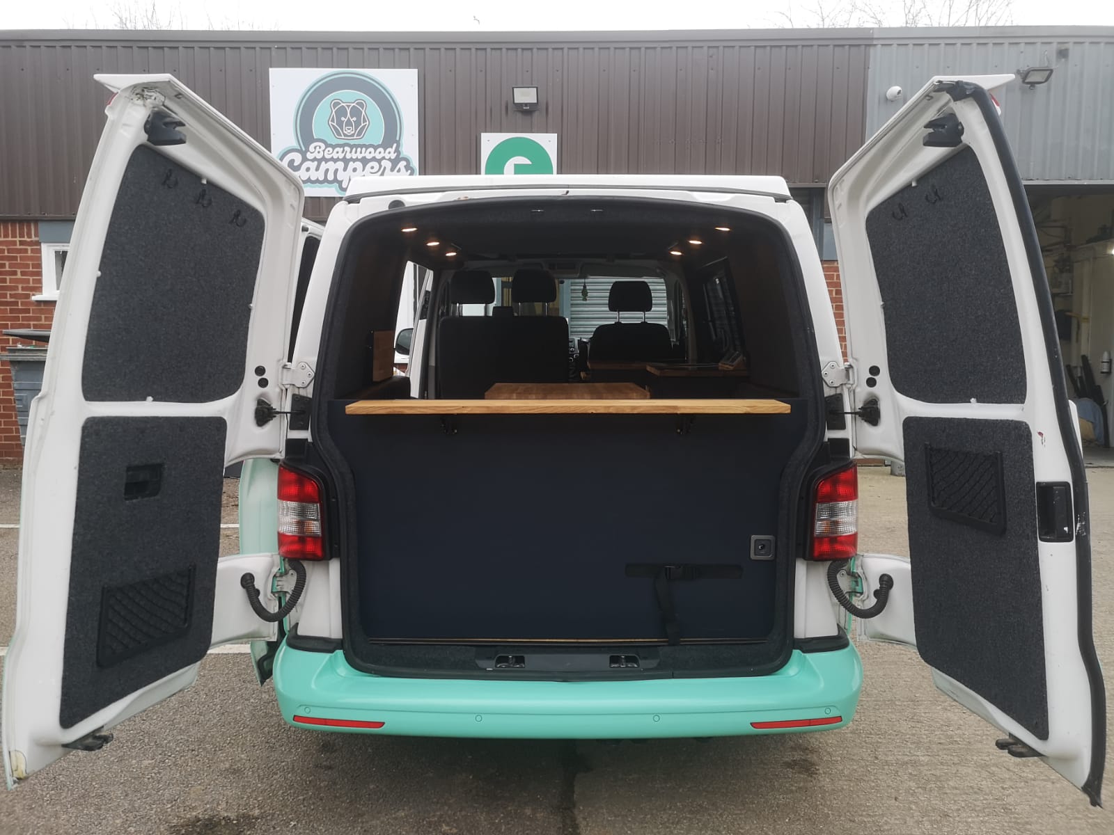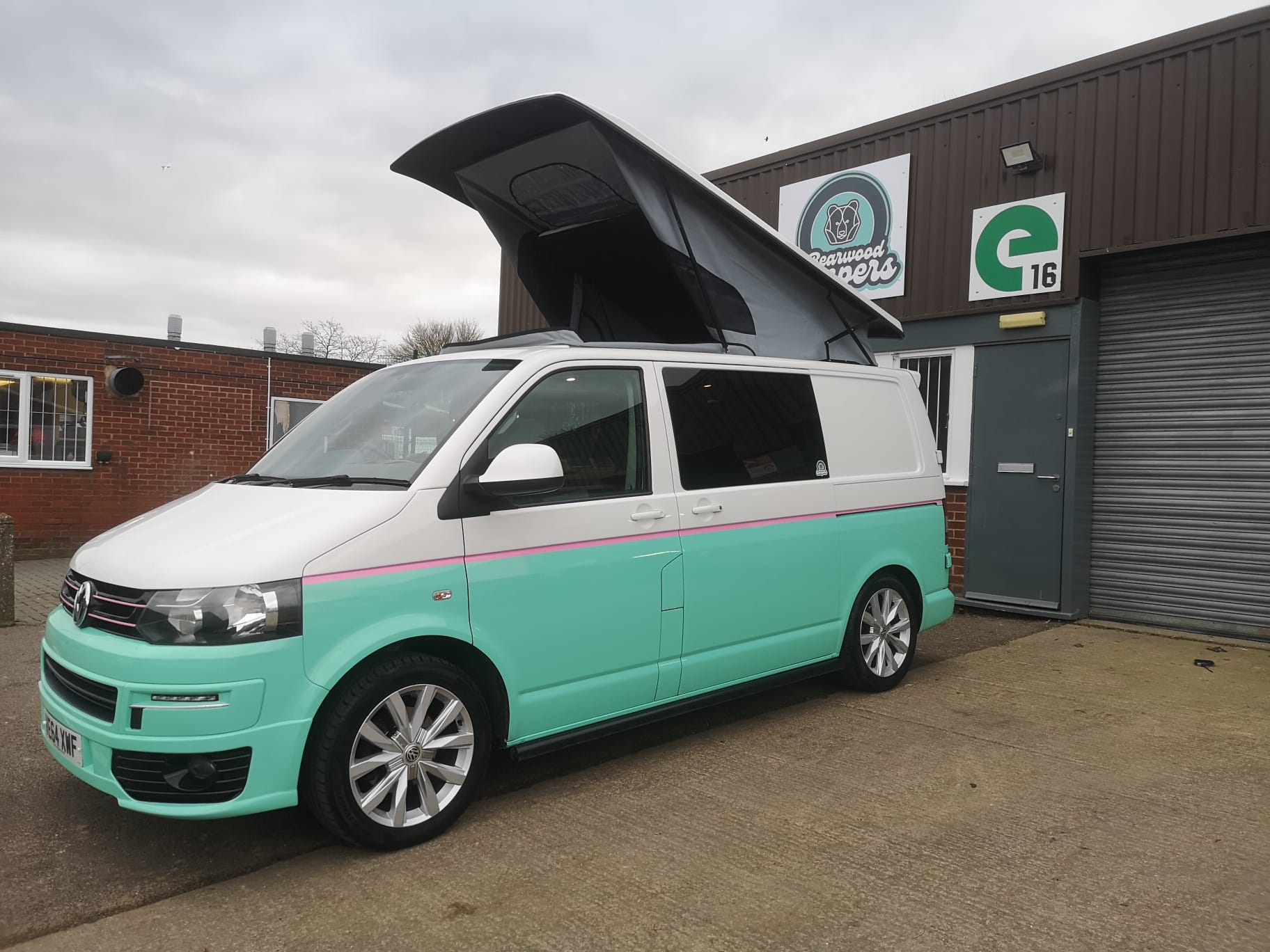 If so then this stunning 2014 plate, VW Highline in our Retro Two tone style with some stand out alloys and our custom made kitchen and cast resin worktop might just be one well worth you checking out. It has a brand new MOT until Feb 2014, a brand new full service, 99,000 miles and is one of Bearwood Campers owners personal campervan that’s got loads of awesome extras inside. Brand new clutch and flywheel, Air con, Electric heated mirrors, Full Bluetooth stereo and phone connectivity, Cruise control and much more.